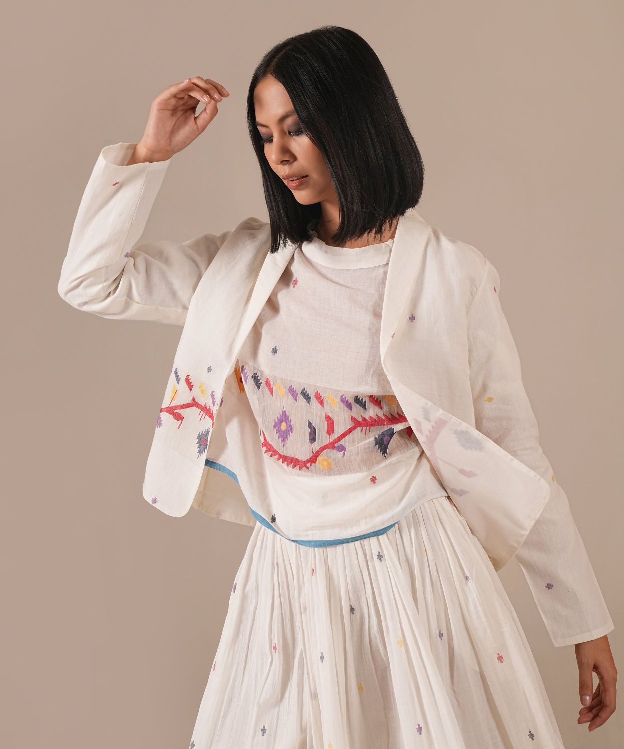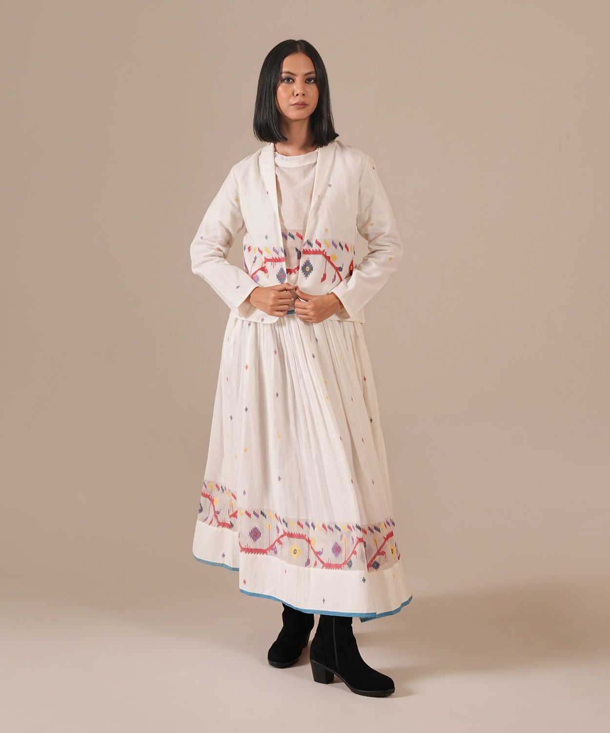 A classic Jamdani co-ord set featuring a boxy top, a gathered skirt, and a finely tailored jacket that can be styled in multiple ways.
