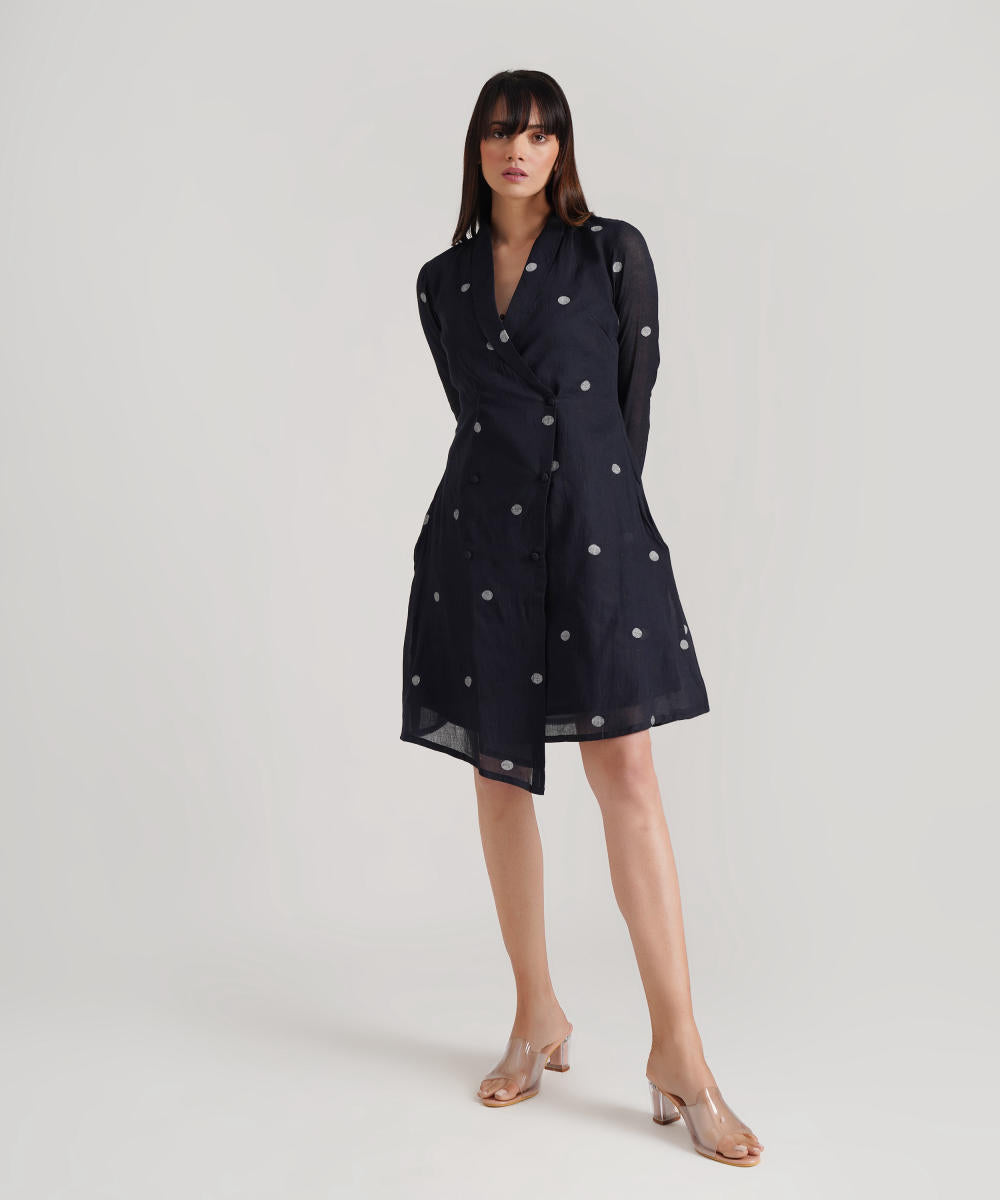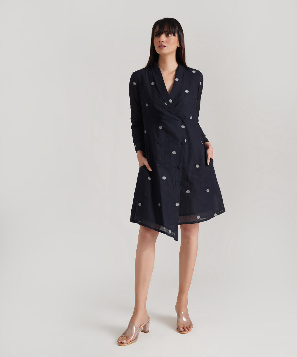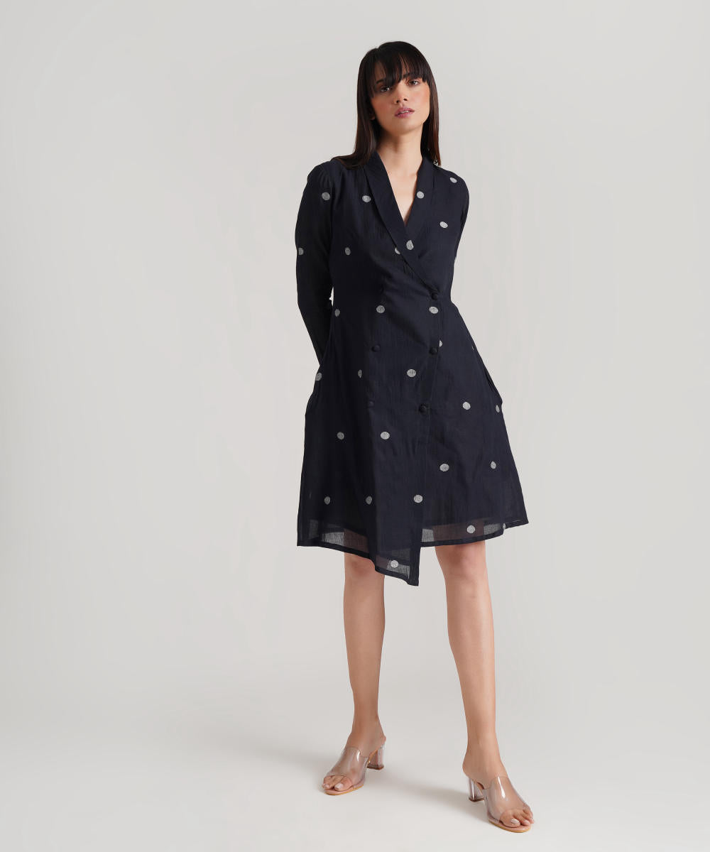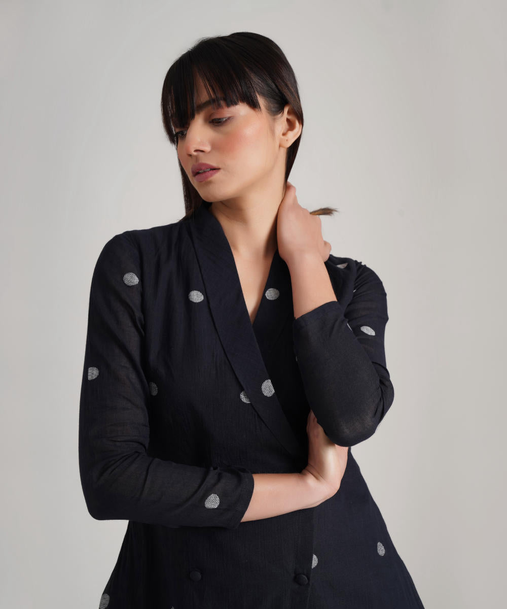 A classic black jacket dress featuring a shawl collar, full sleeves, double-breasted button detailing, and an asymmetric silhouette is perfect party wear.
