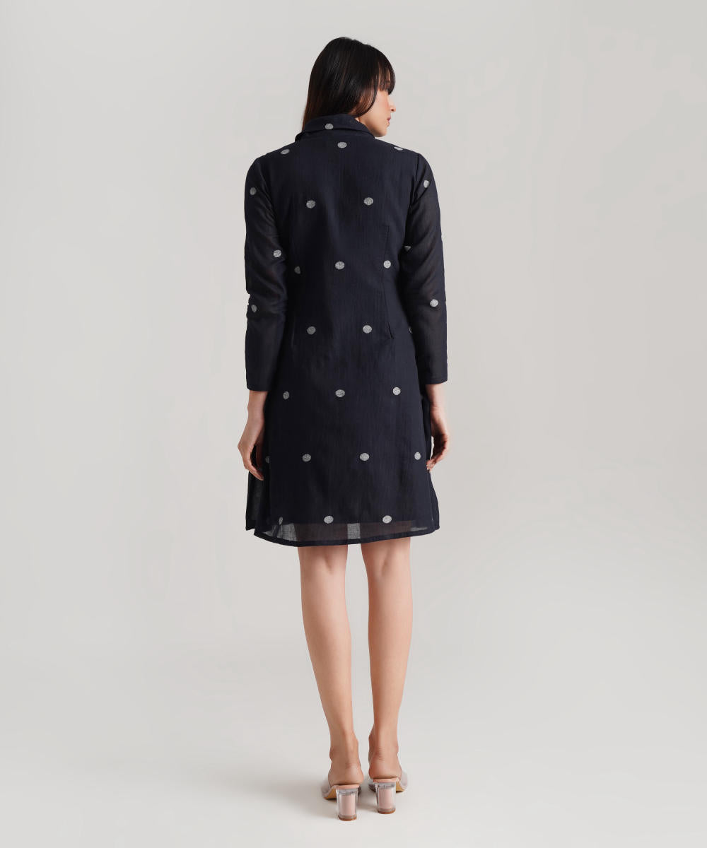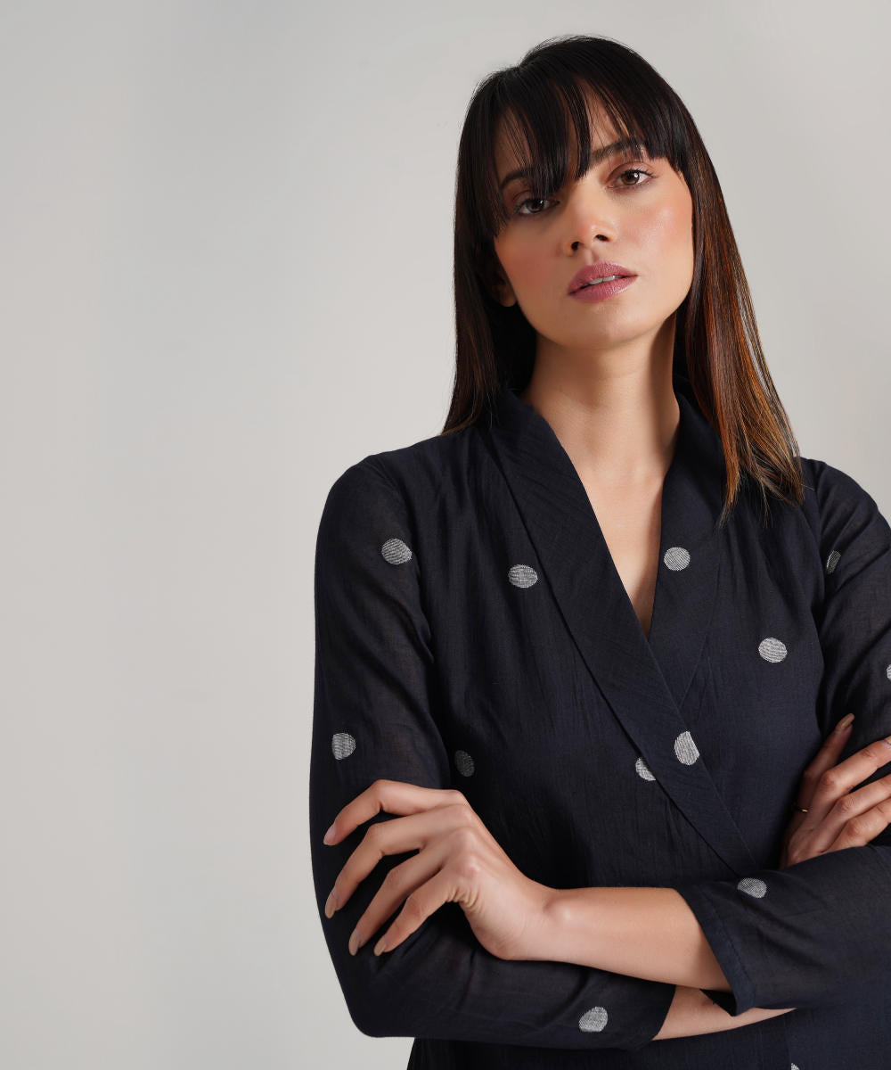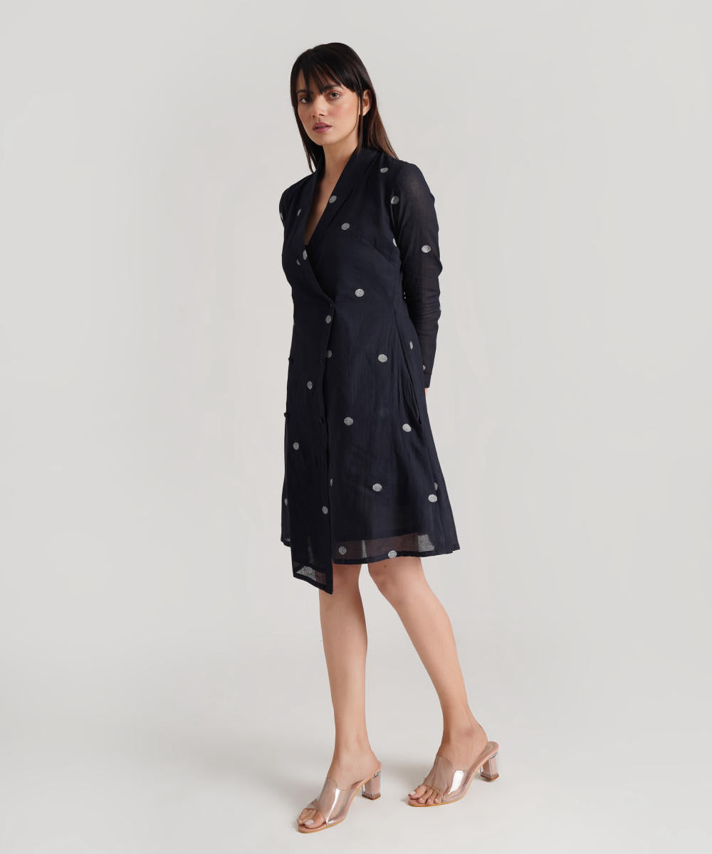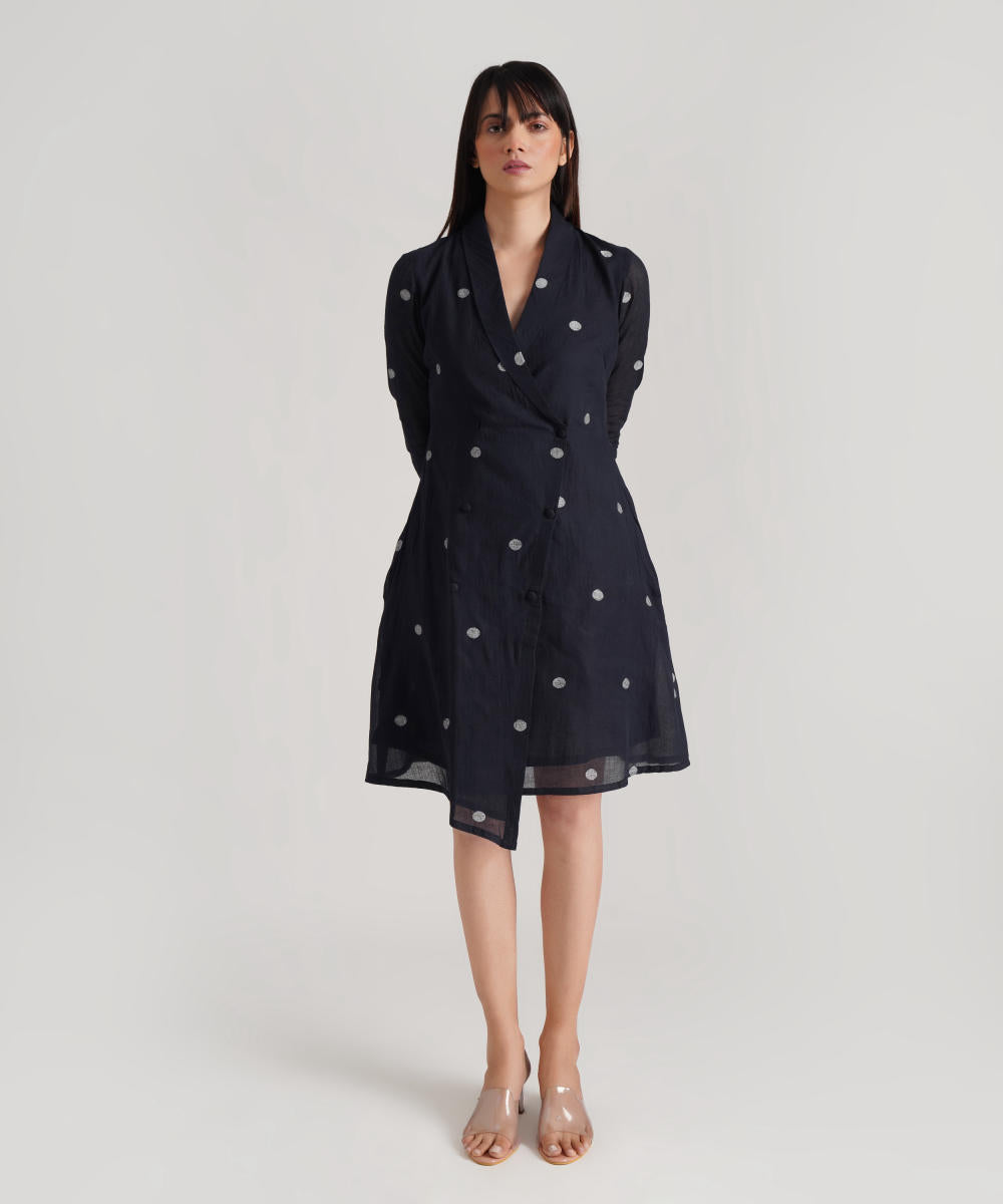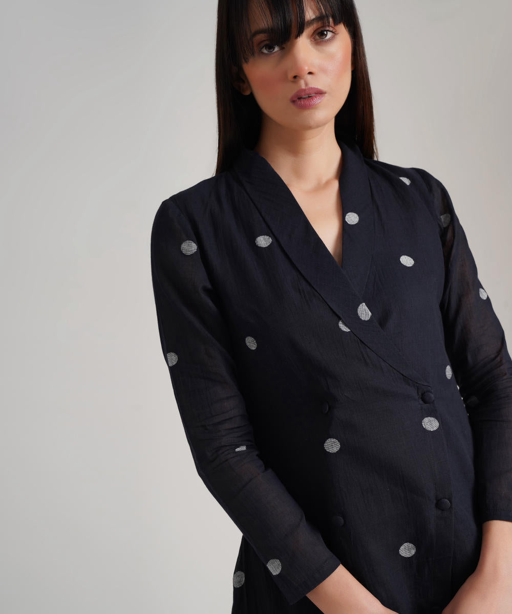 A classic black jacket dress featuring a shawl collar, full sleeves, double-breasted button detailing, and an asymmetric silhouette is perfect party wear.
