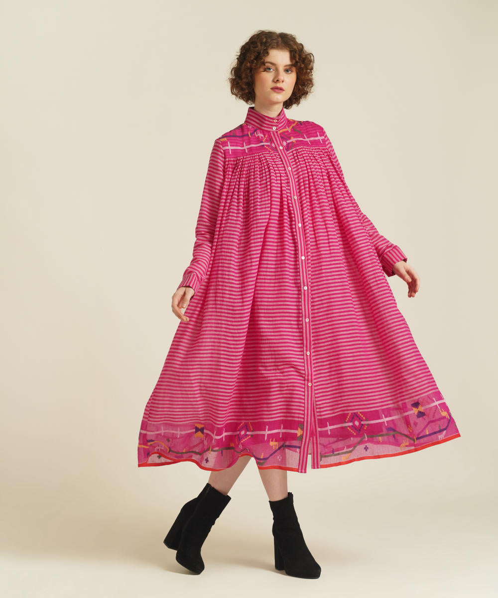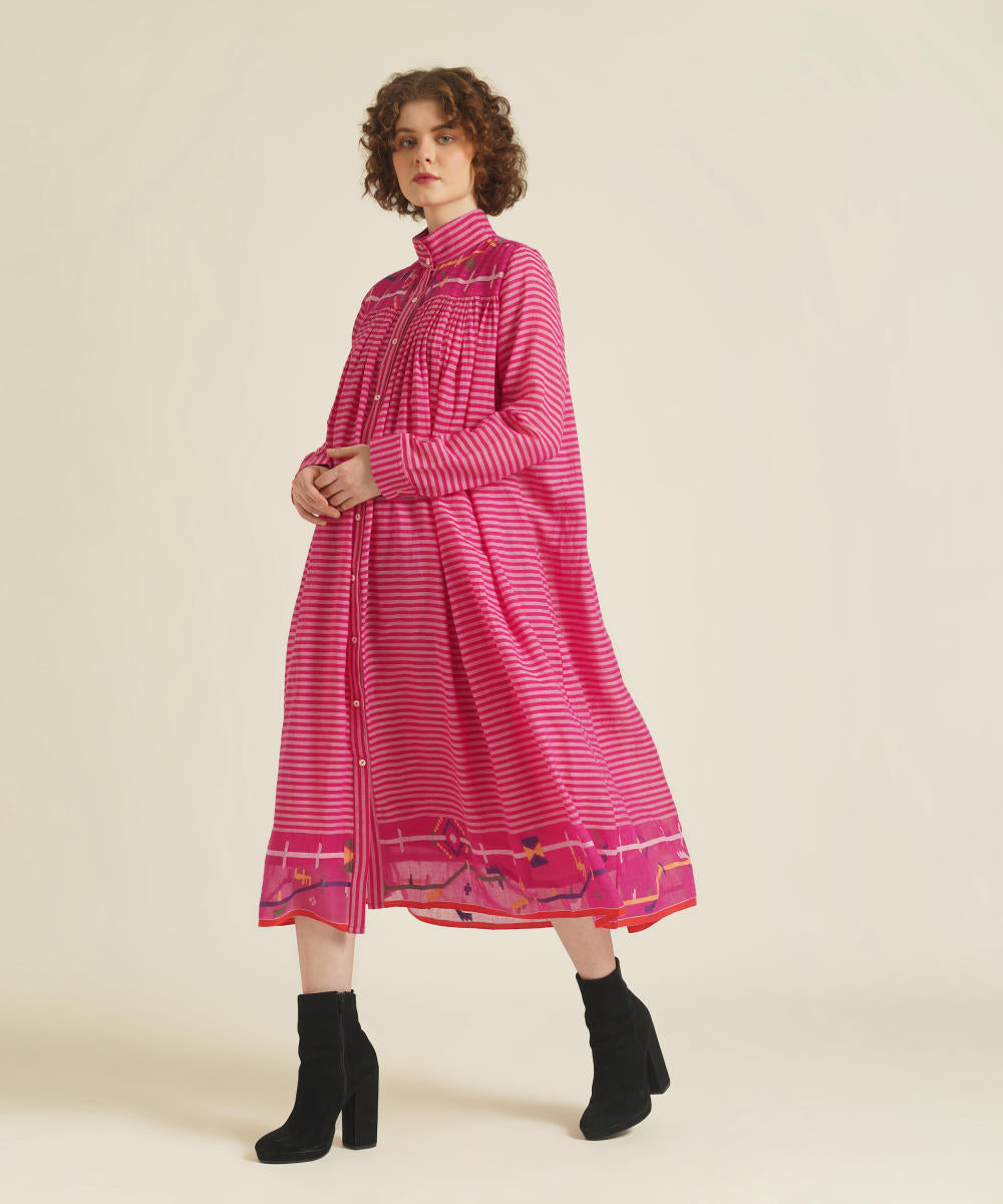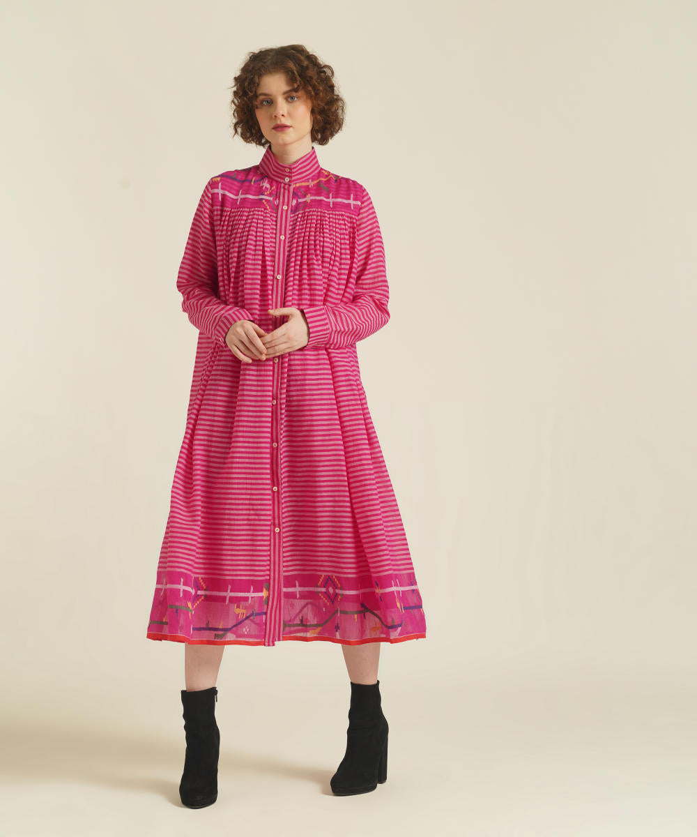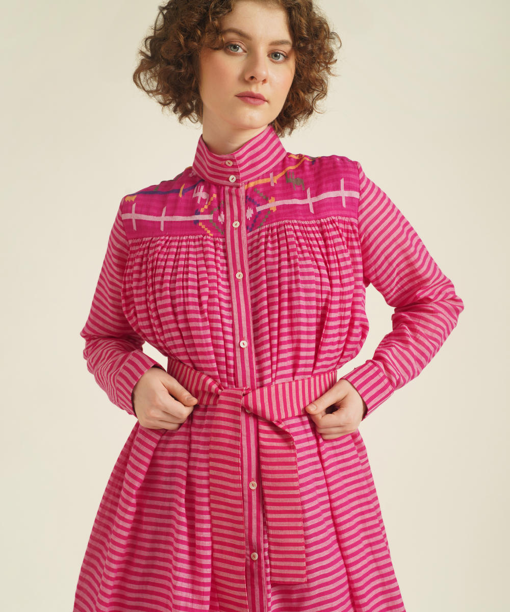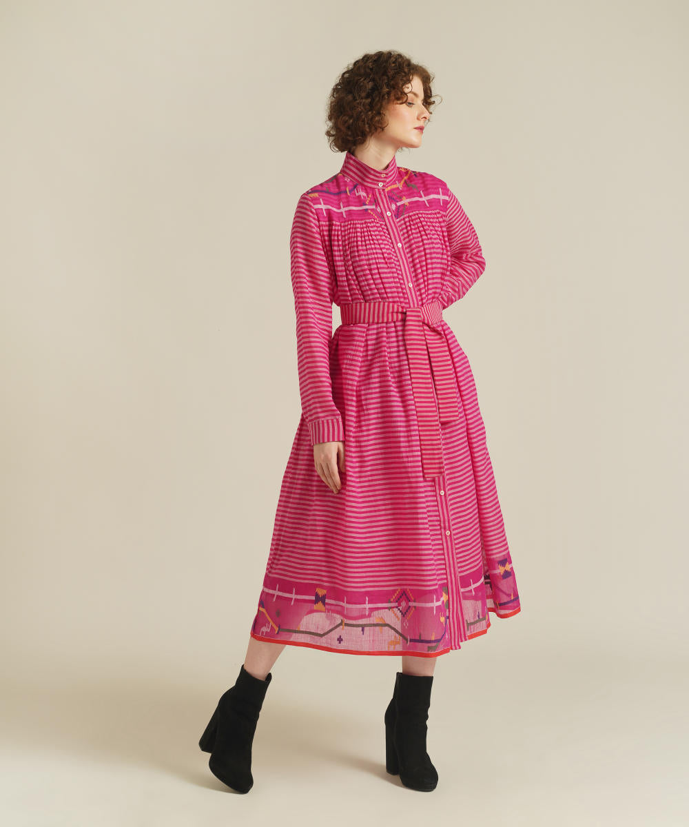 A classic gathered dress featuring high collar neck, front button fastening, full sleeves that comes with gentle pleats at the front and back which can be styled in multiple ways. This dress also comes with a removable tie belt.