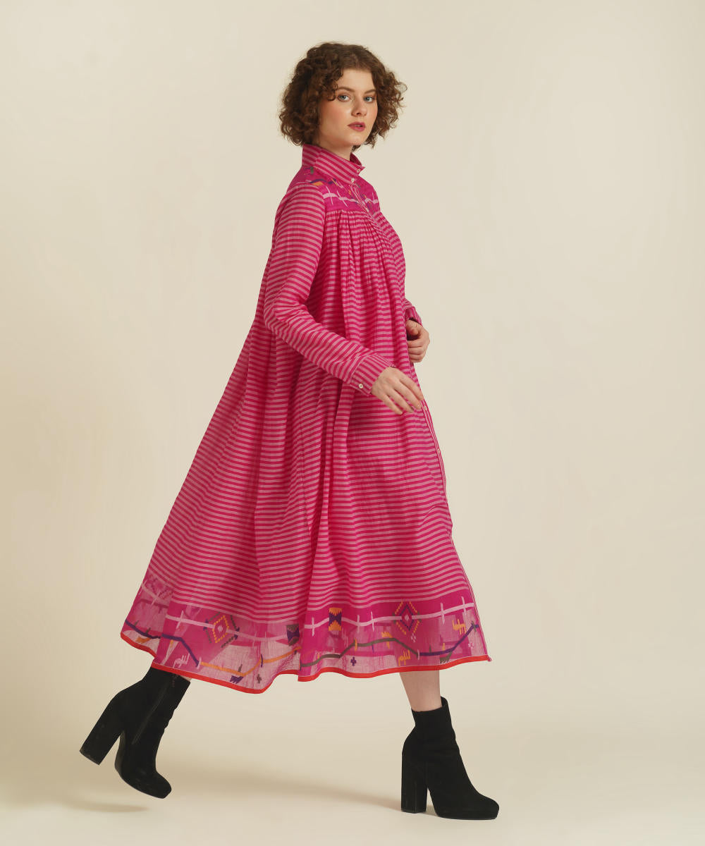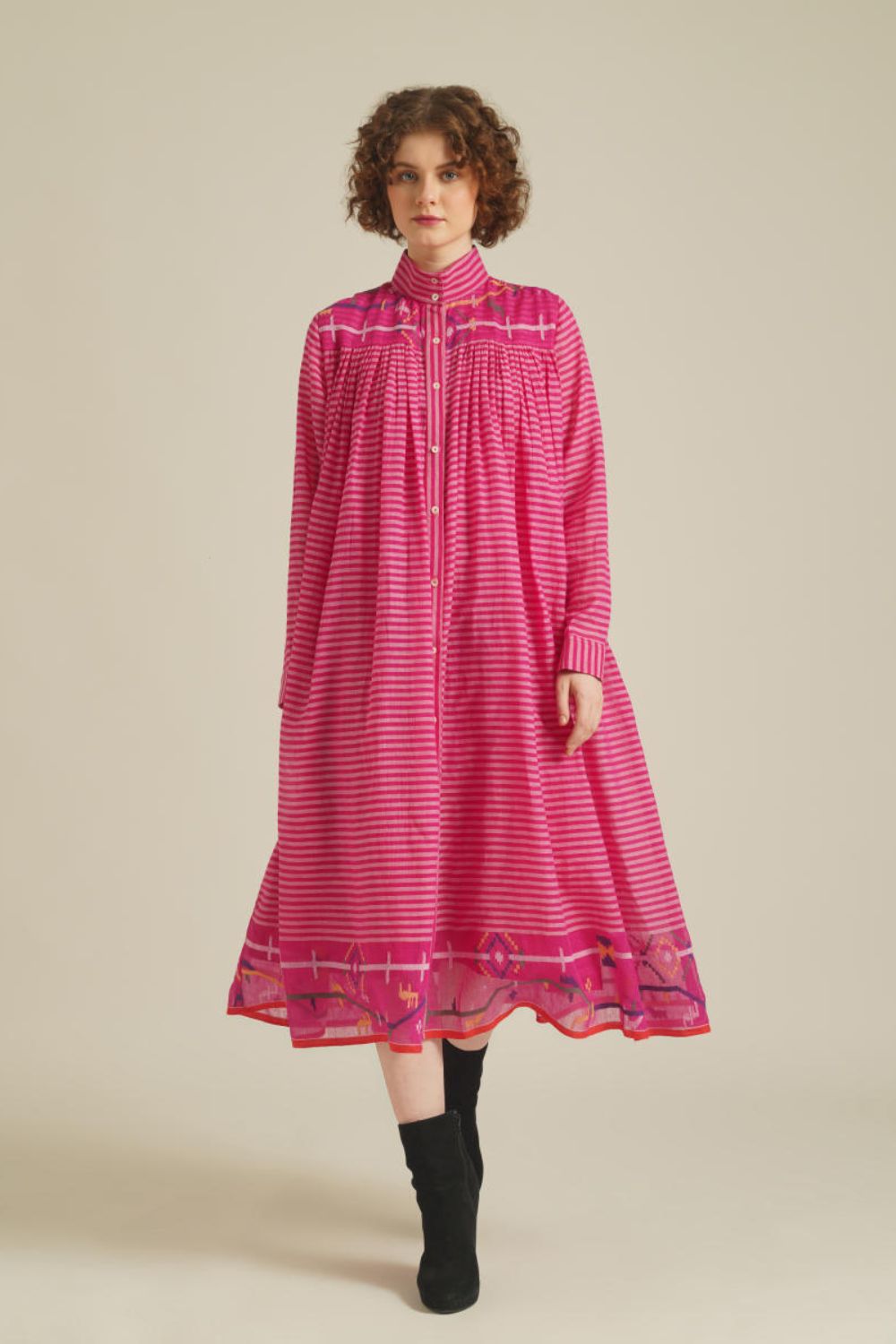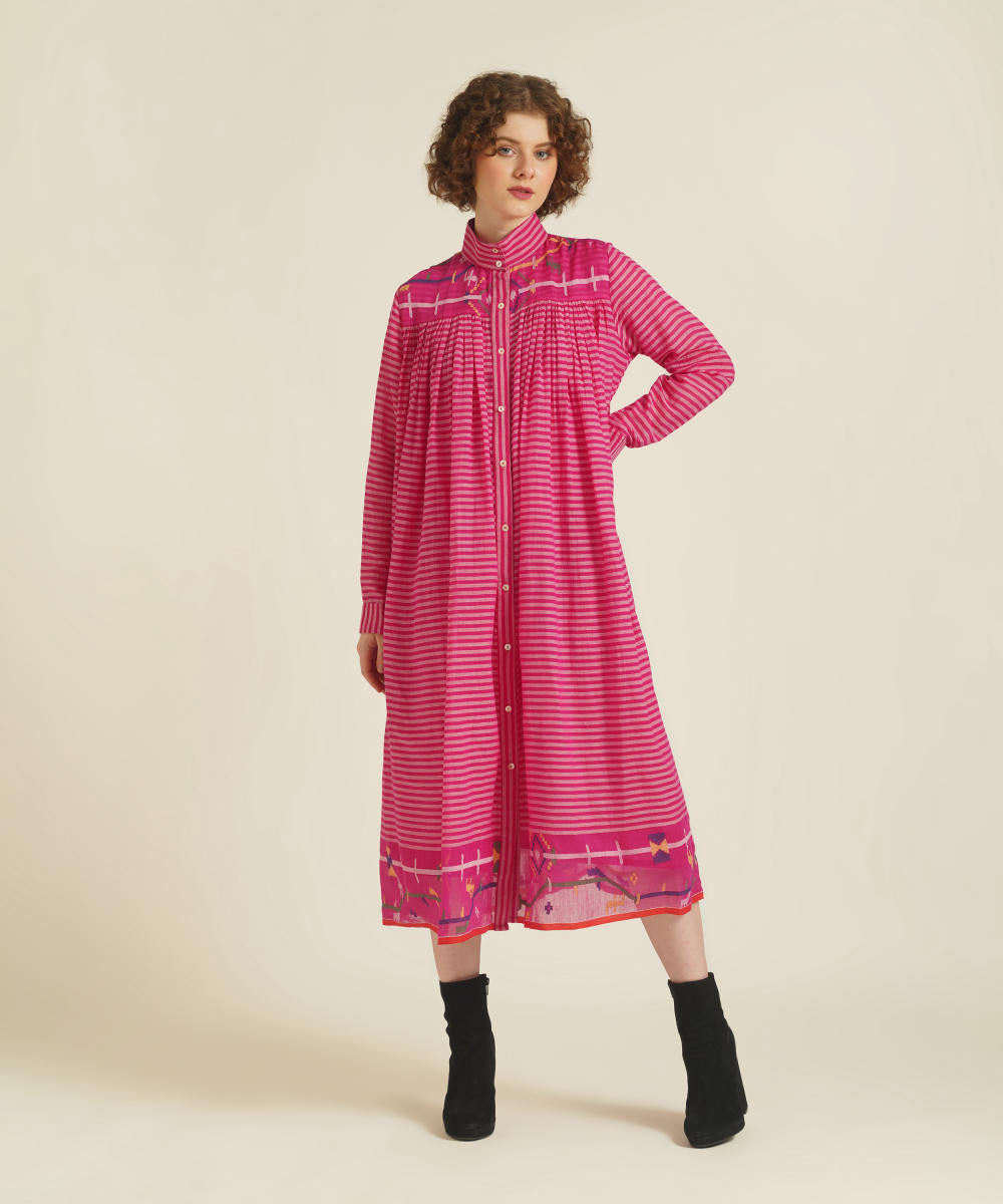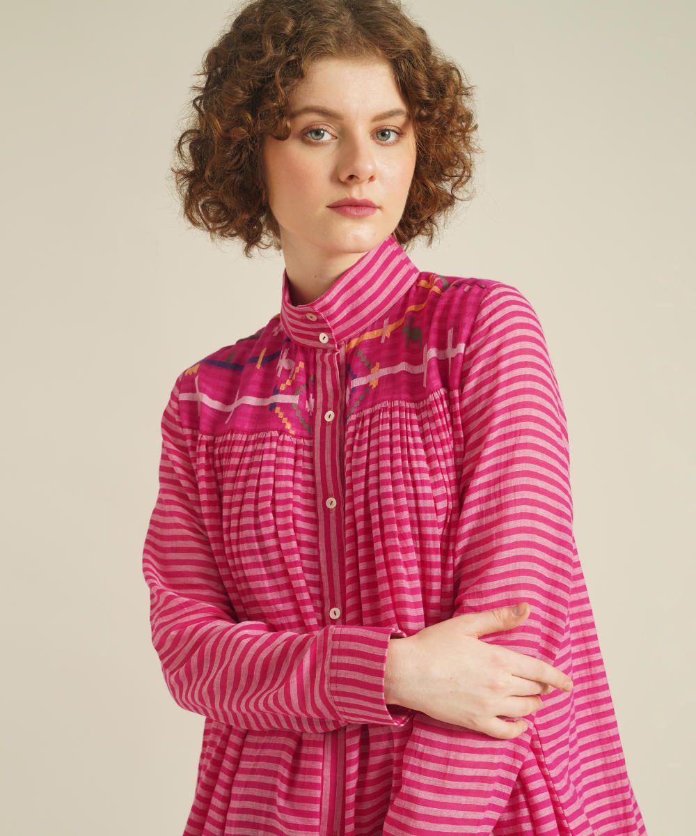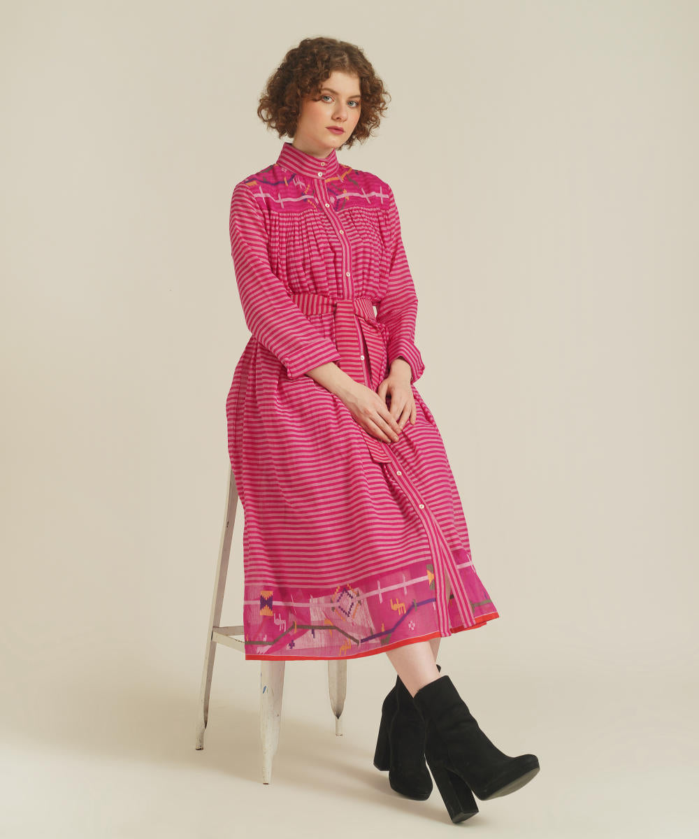 A classic gathered dress featuring high collar neck, front button fastening, full sleeves that comes with gentle pleats at the front and back which can be styled in multiple ways. This dress also comes with a removable tie belt.