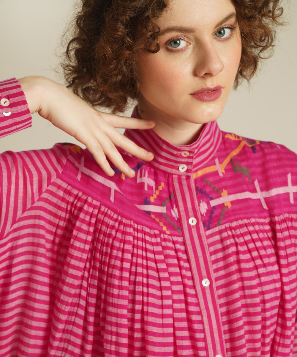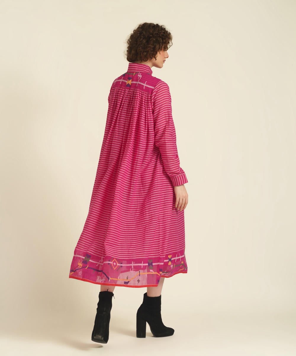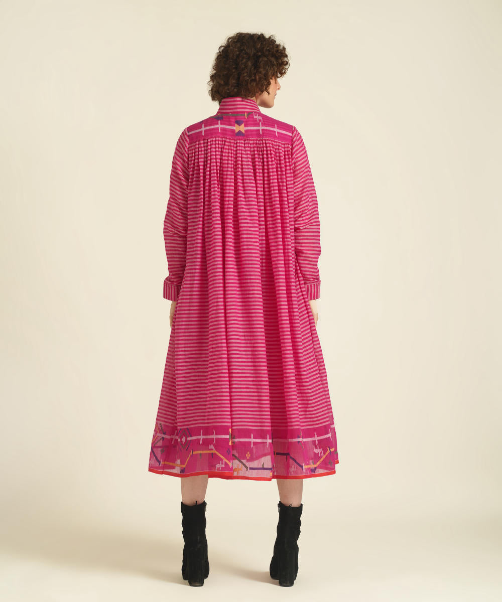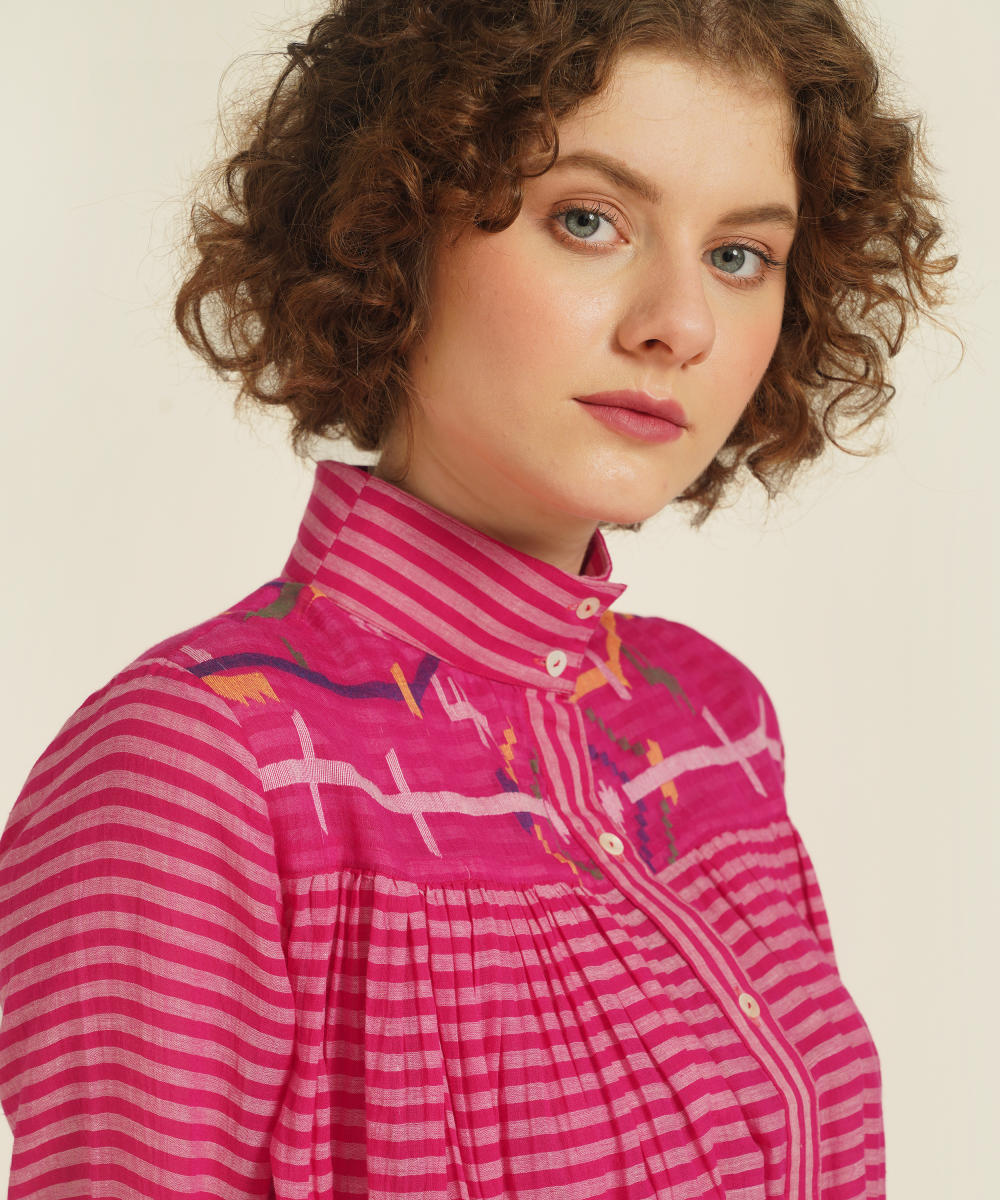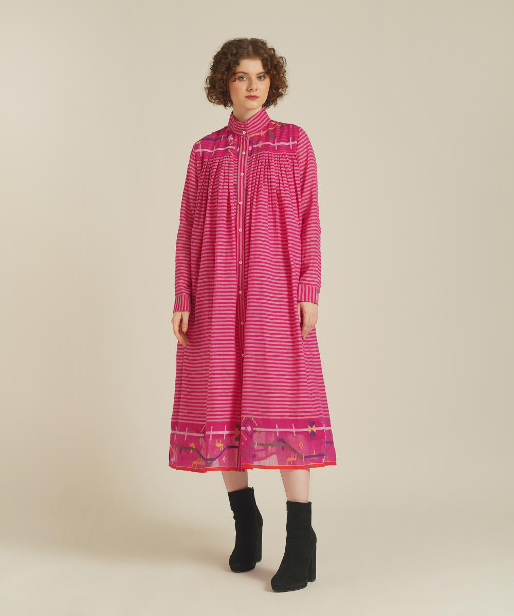 A classic gathered dress featuring high collar neck, front button fastening, full sleeves that comes with gentle pleats at the front and back which can be styled in multiple ways. This dress also comes with a removable tie belt.