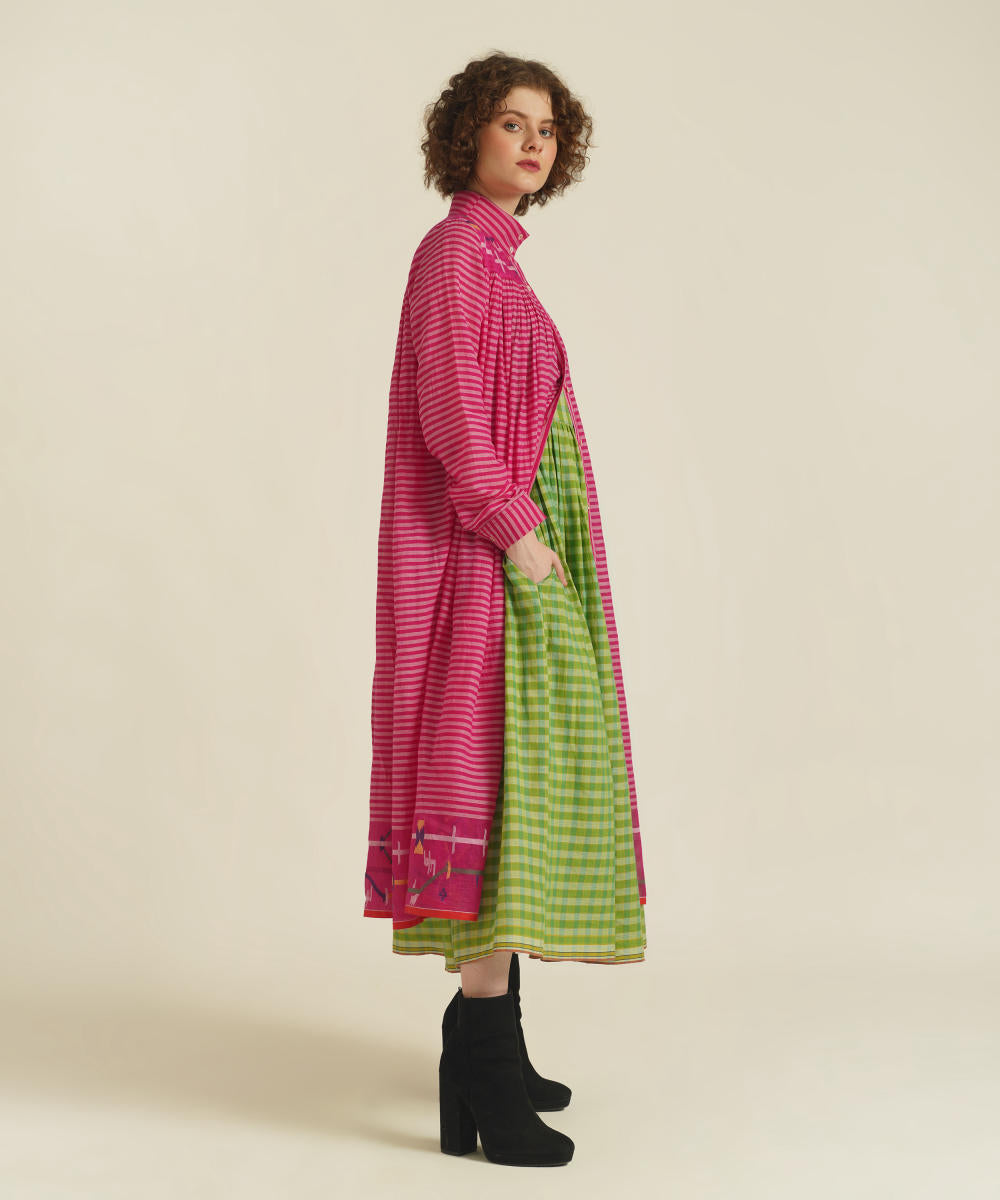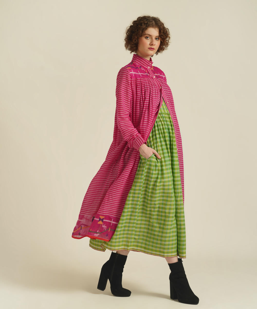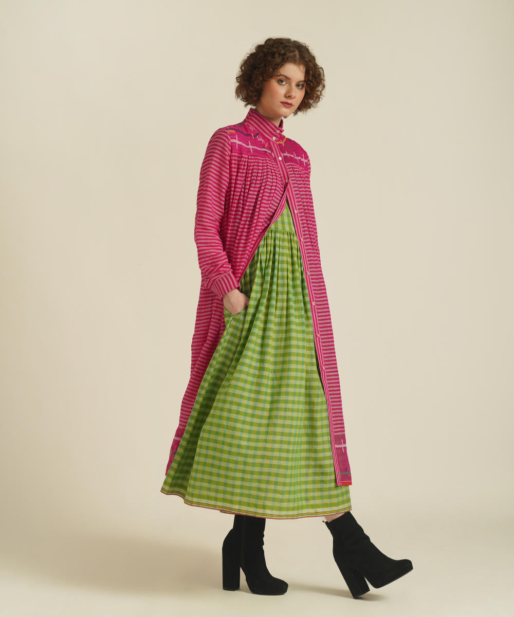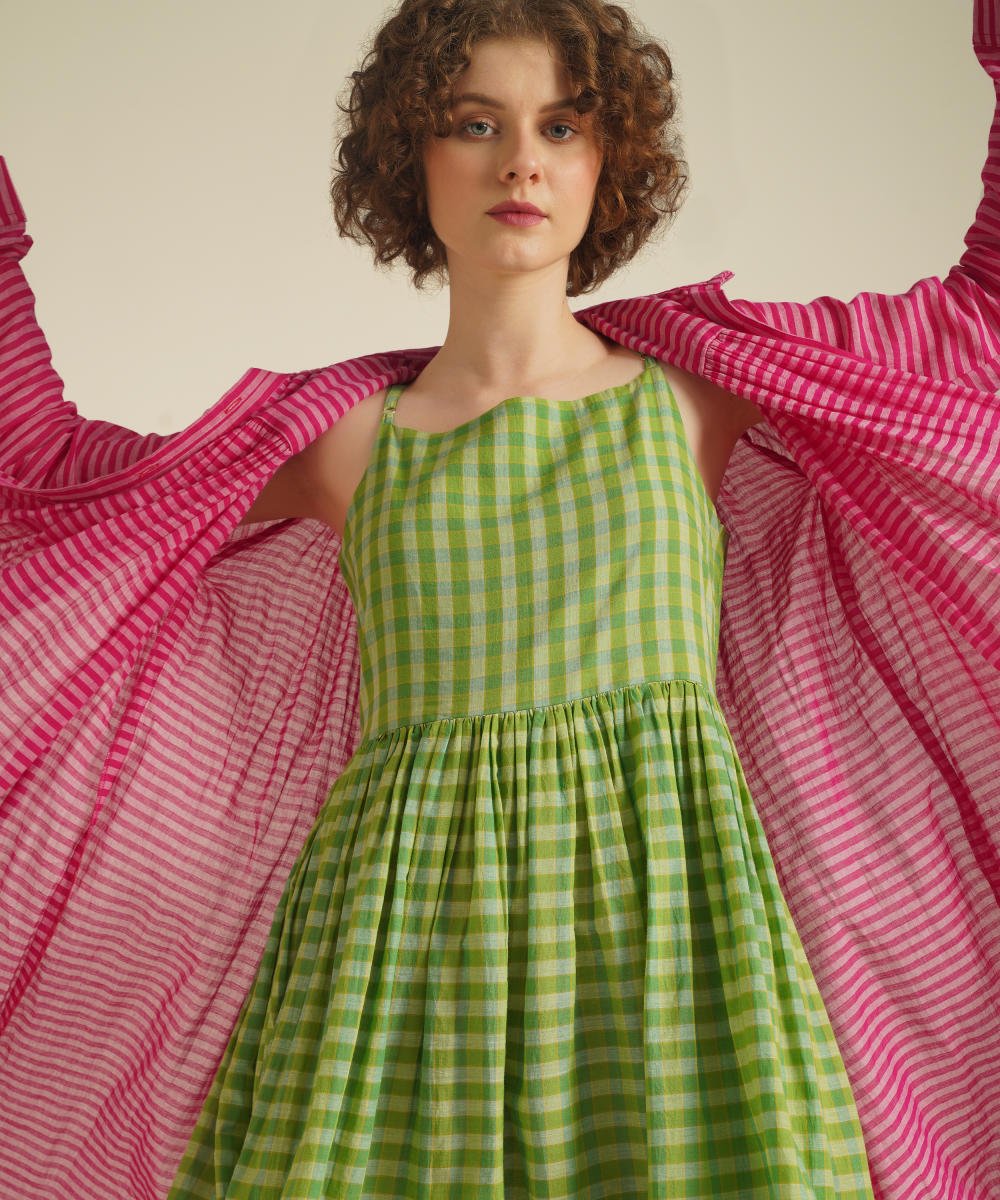 A classic gathered dress featuring high collar neck, front button fastening, full sleeves that comes with gentle pleats at the front and back. This dress also comes with a handwoven slip dress and a removable tie belt that can be styled in multiple ways.