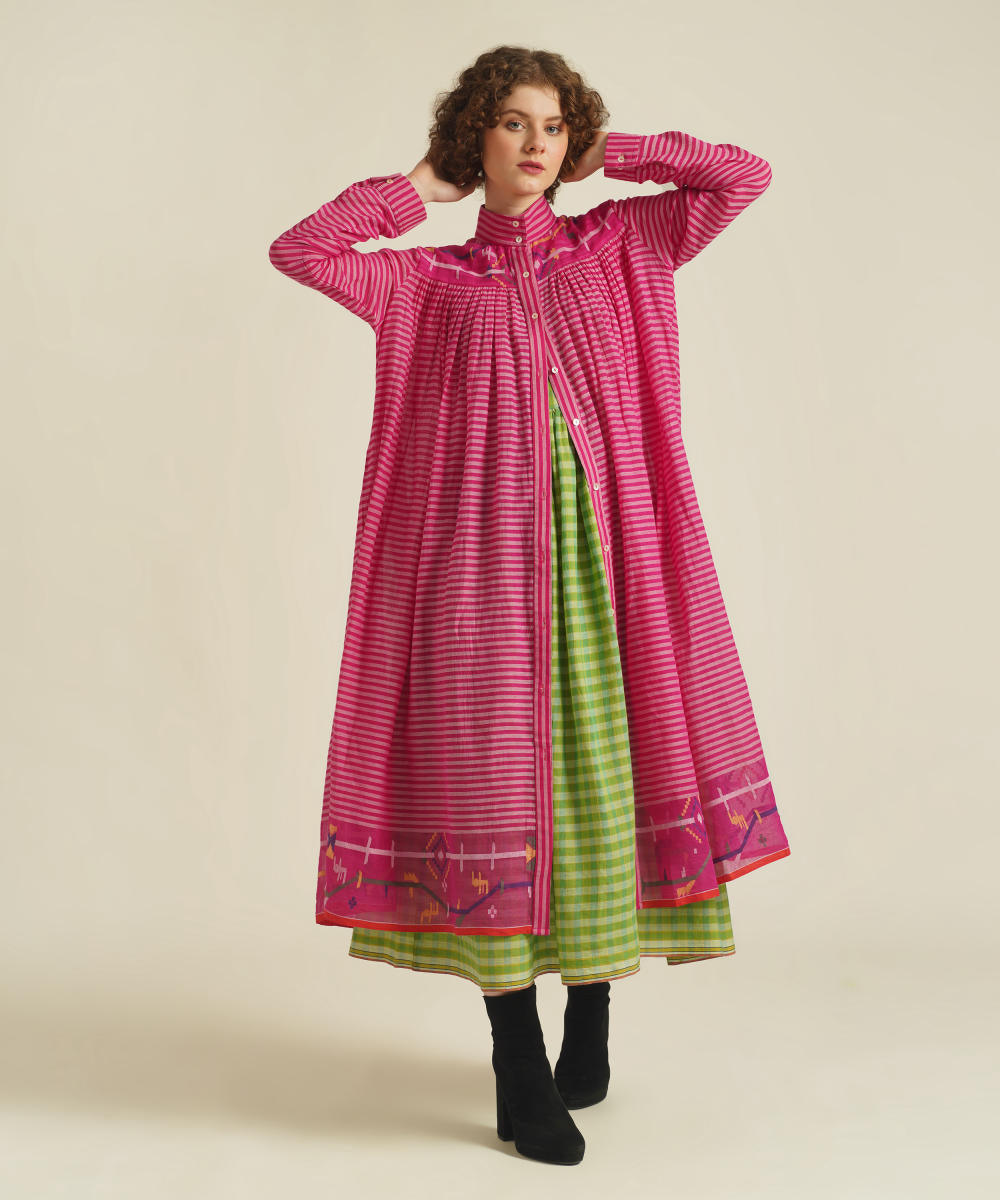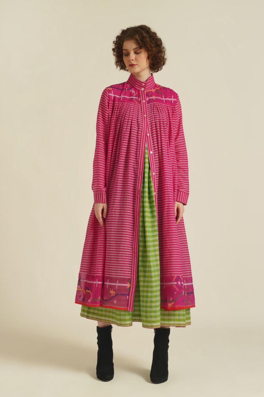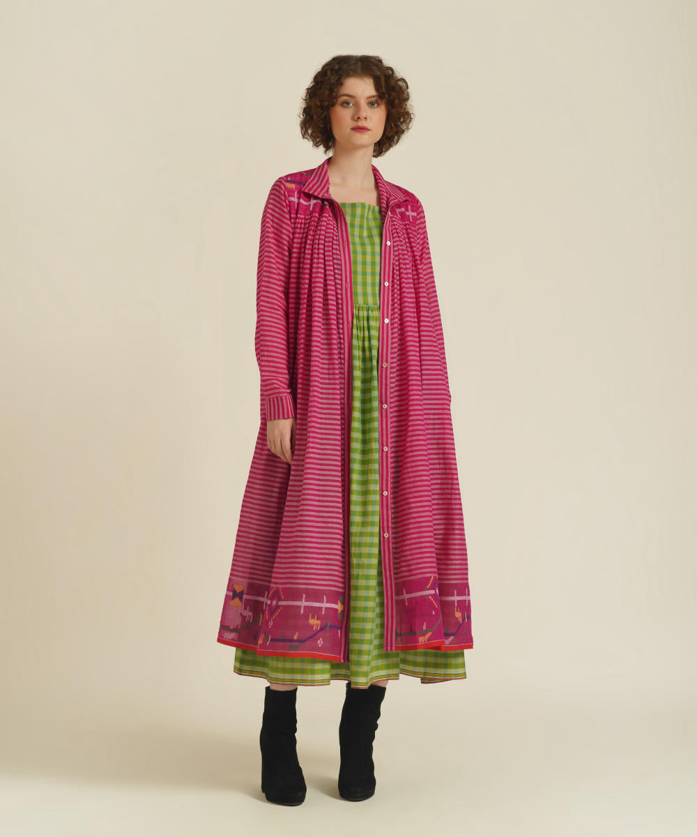 A classic gathered dress featuring high collar neck, front button fastening, full sleeves that comes with gentle pleats at the front and back. This dress also comes with a handwoven slip dress and a removable tie belt that can be styled in multiple ways.