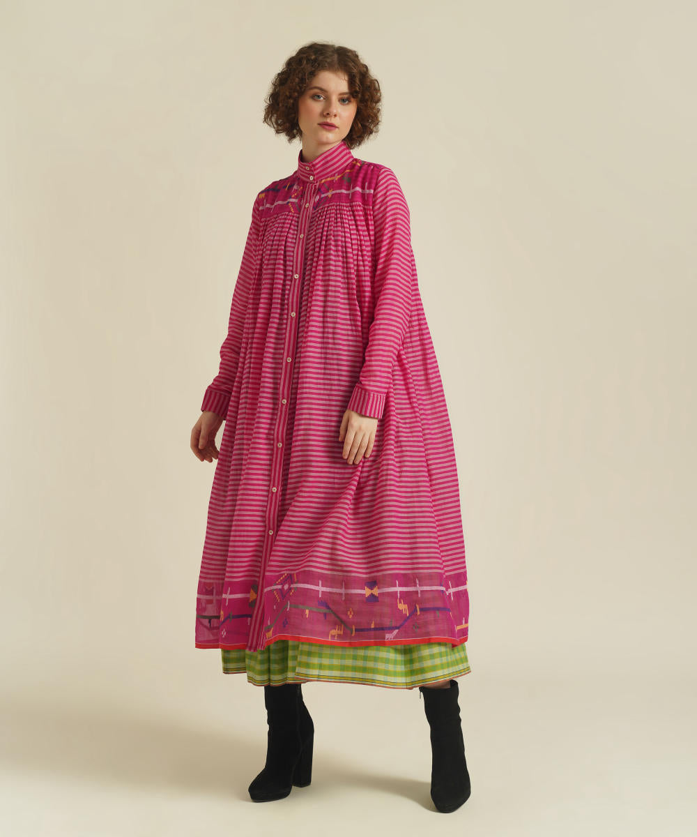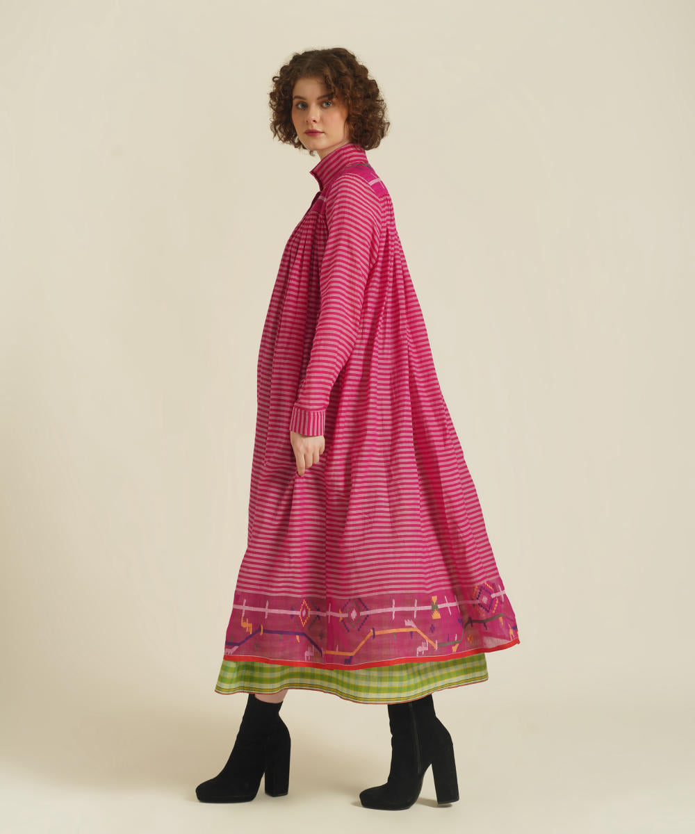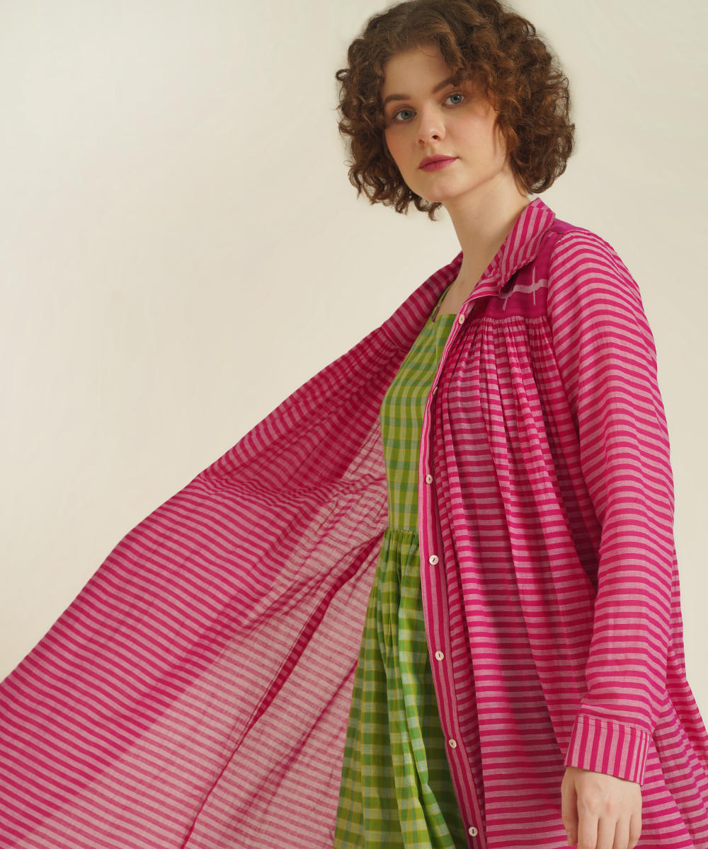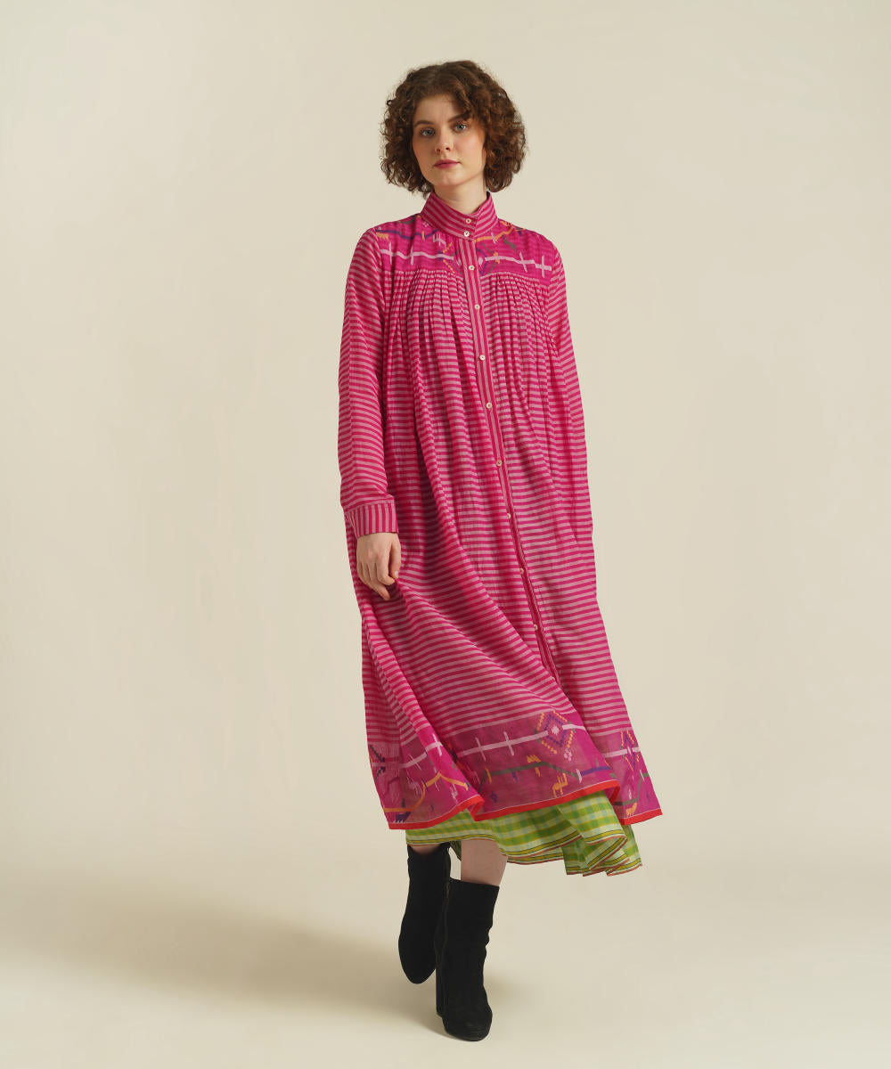 A classic gathered dress featuring high collar neck, front button fastening, full sleeves that comes with gentle pleats at the front and back. This dress also comes with a handwoven slip dress and a removable tie belt that can be styled in multiple ways.