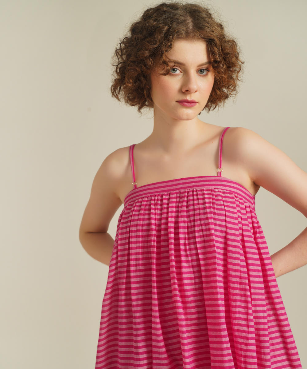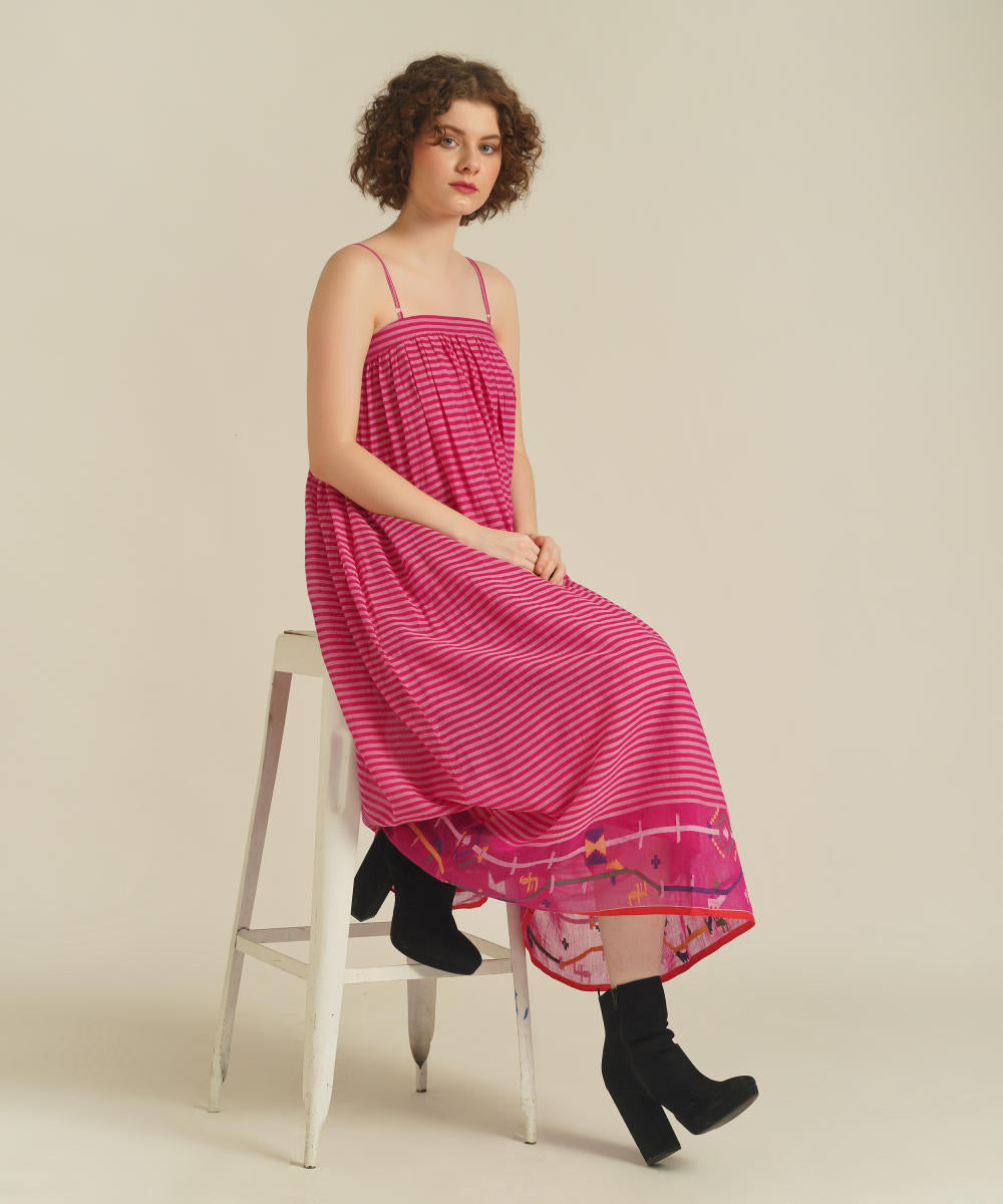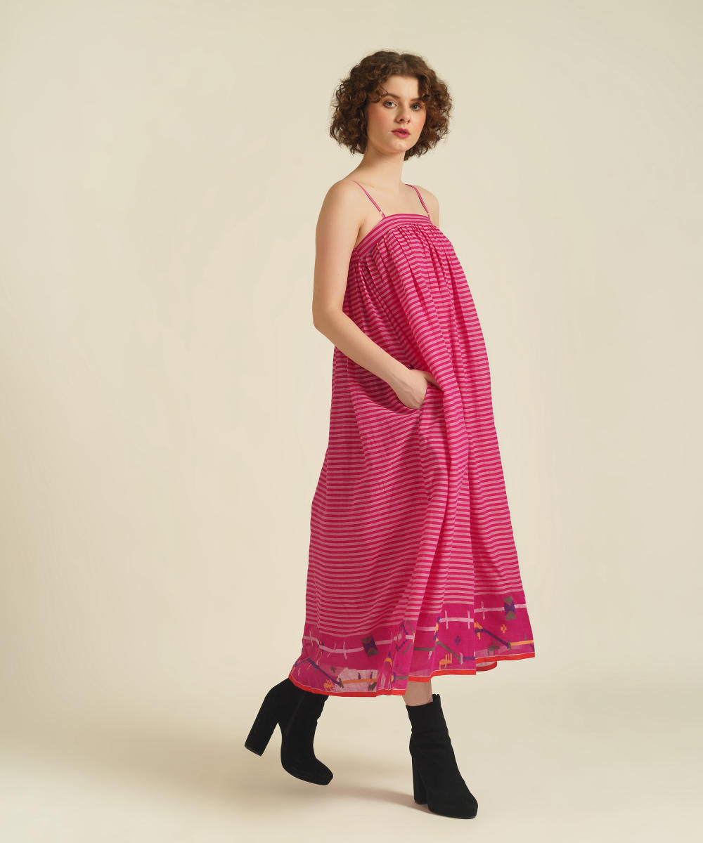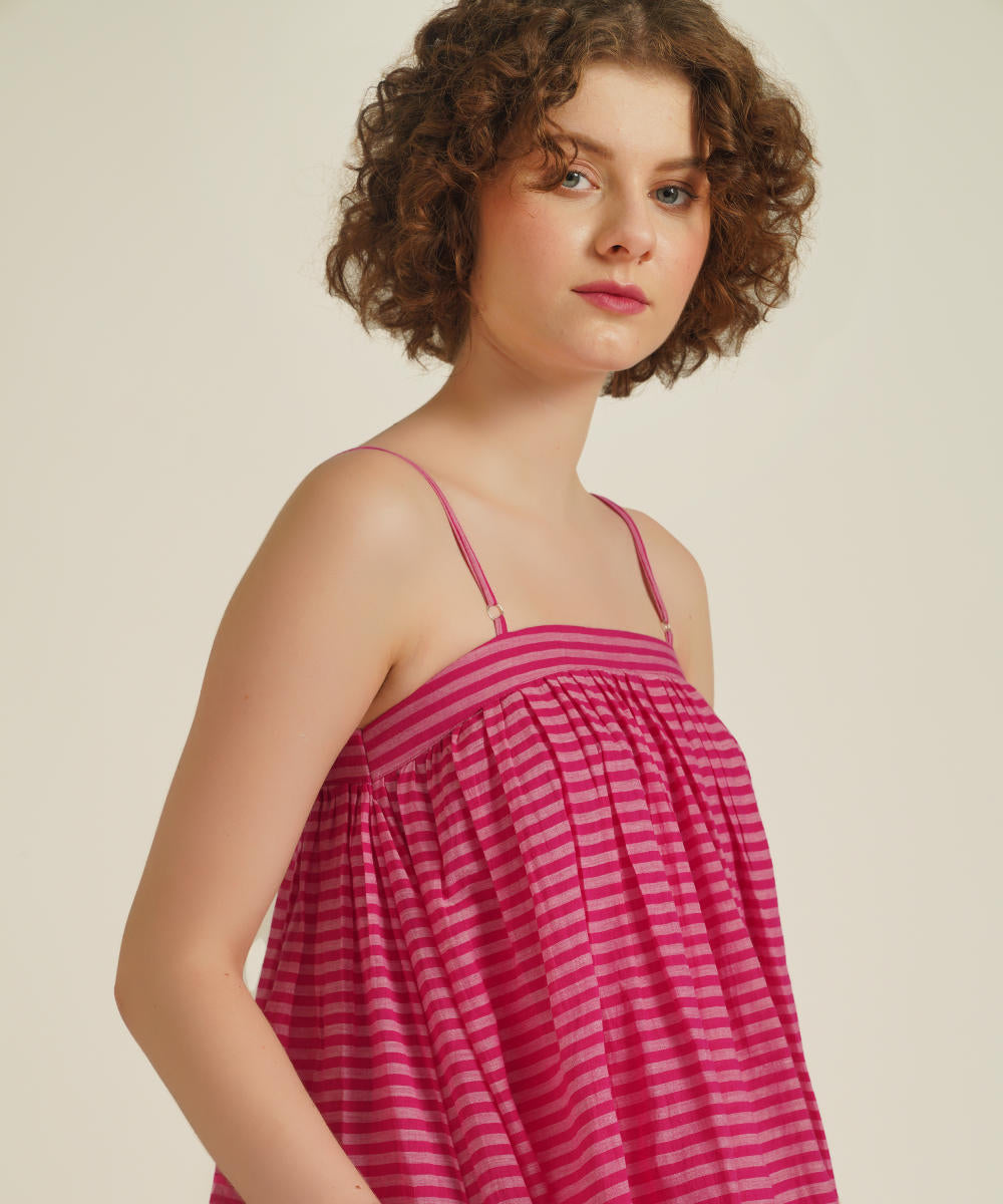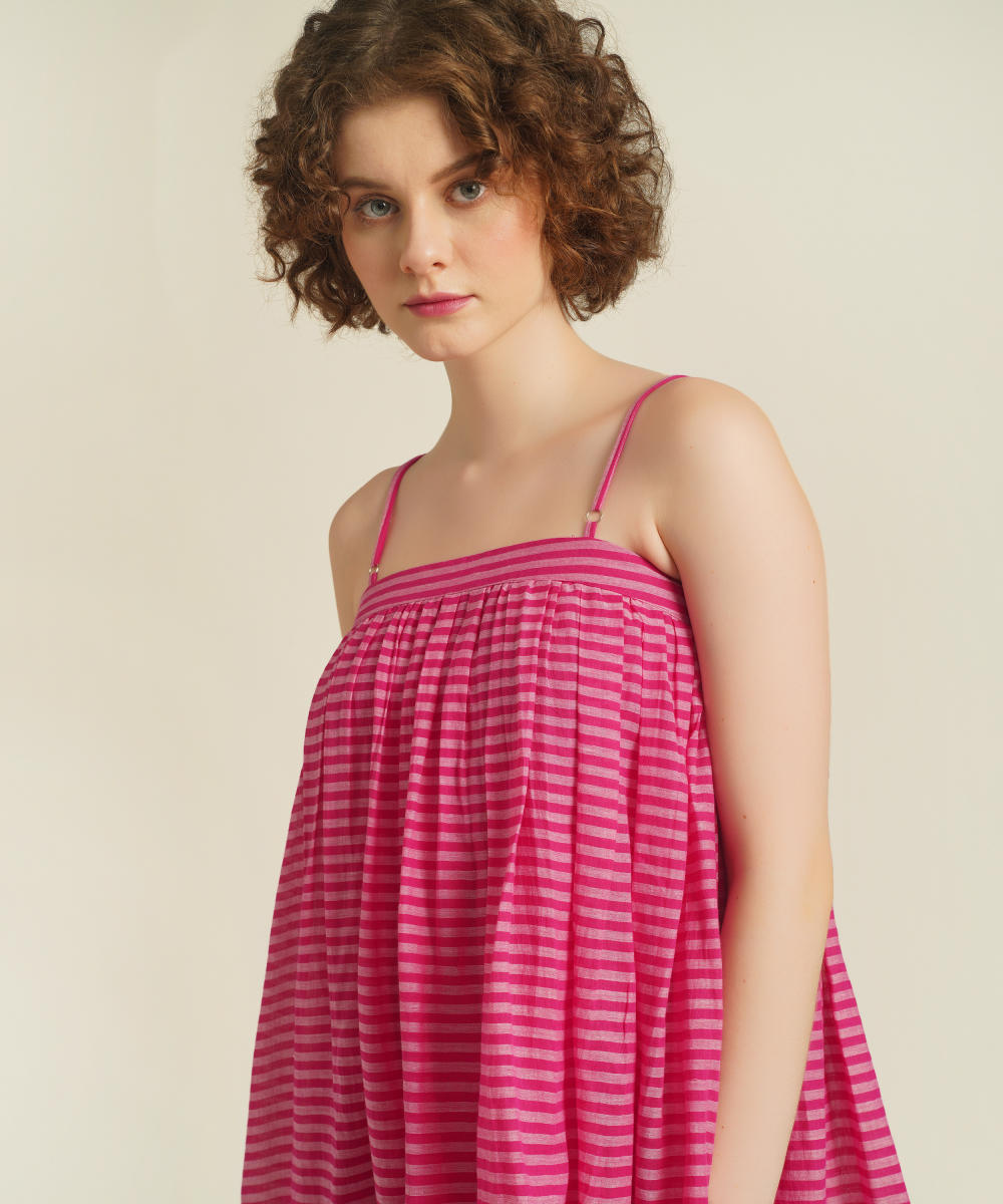 A classic strap dress features adjustable spaghetti strap, gentle gathers at yoke and comes with side pockets.