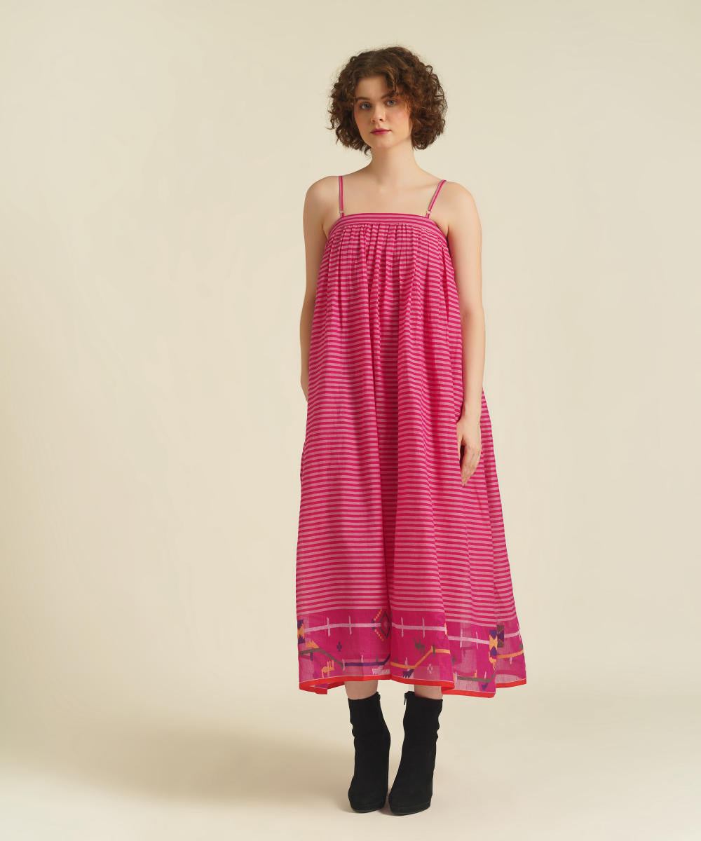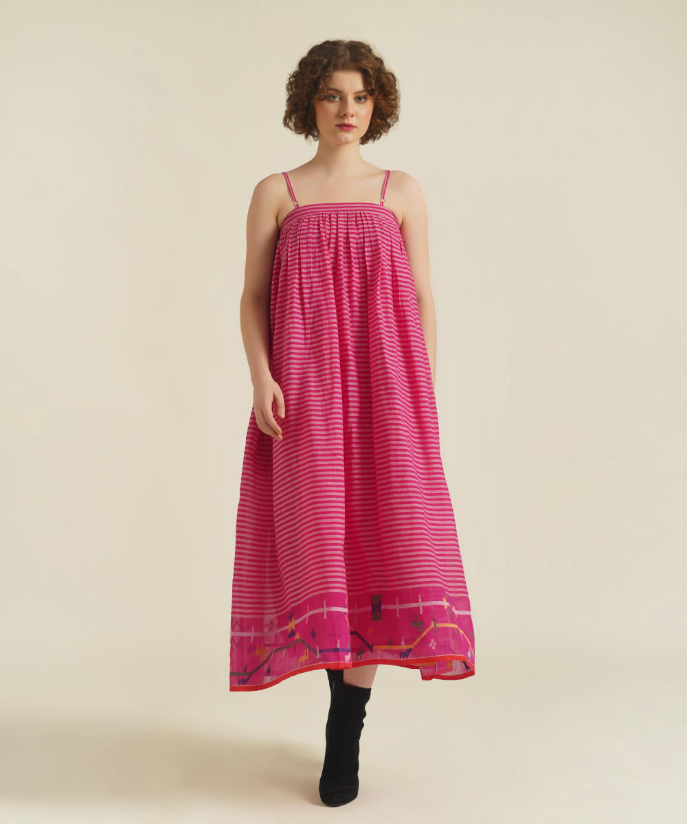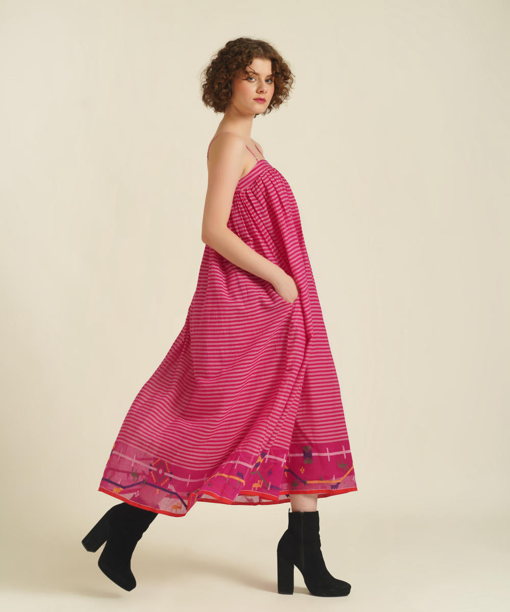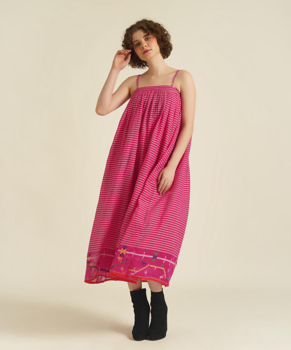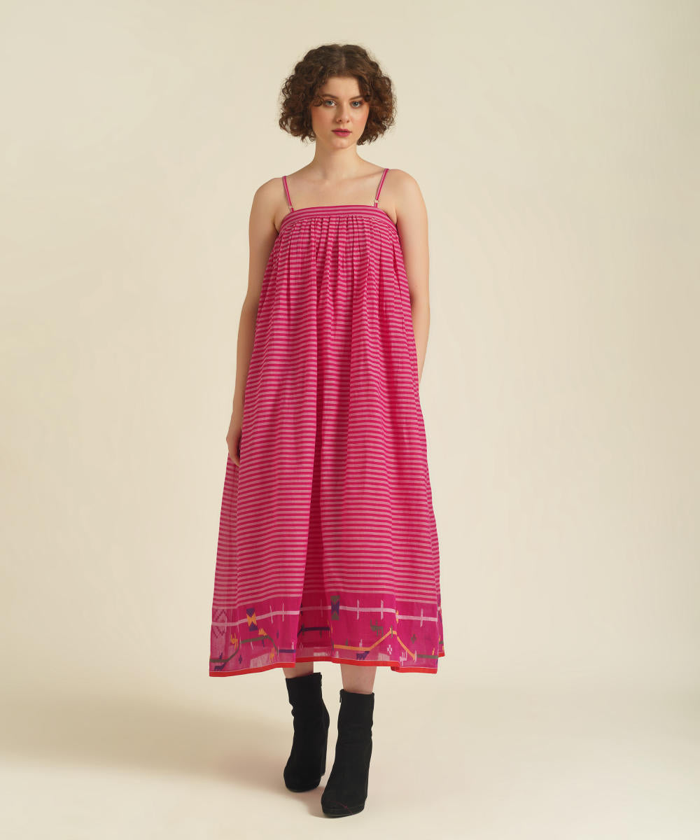 A classic strap dress features adjustable spaghetti strap, gentle gathers at yoke and comes with side pockets.