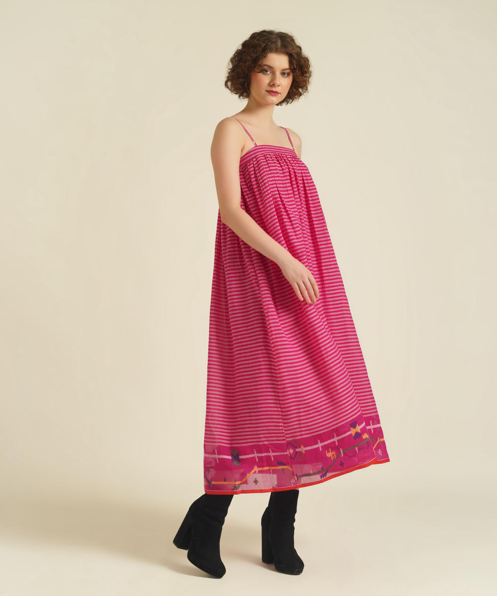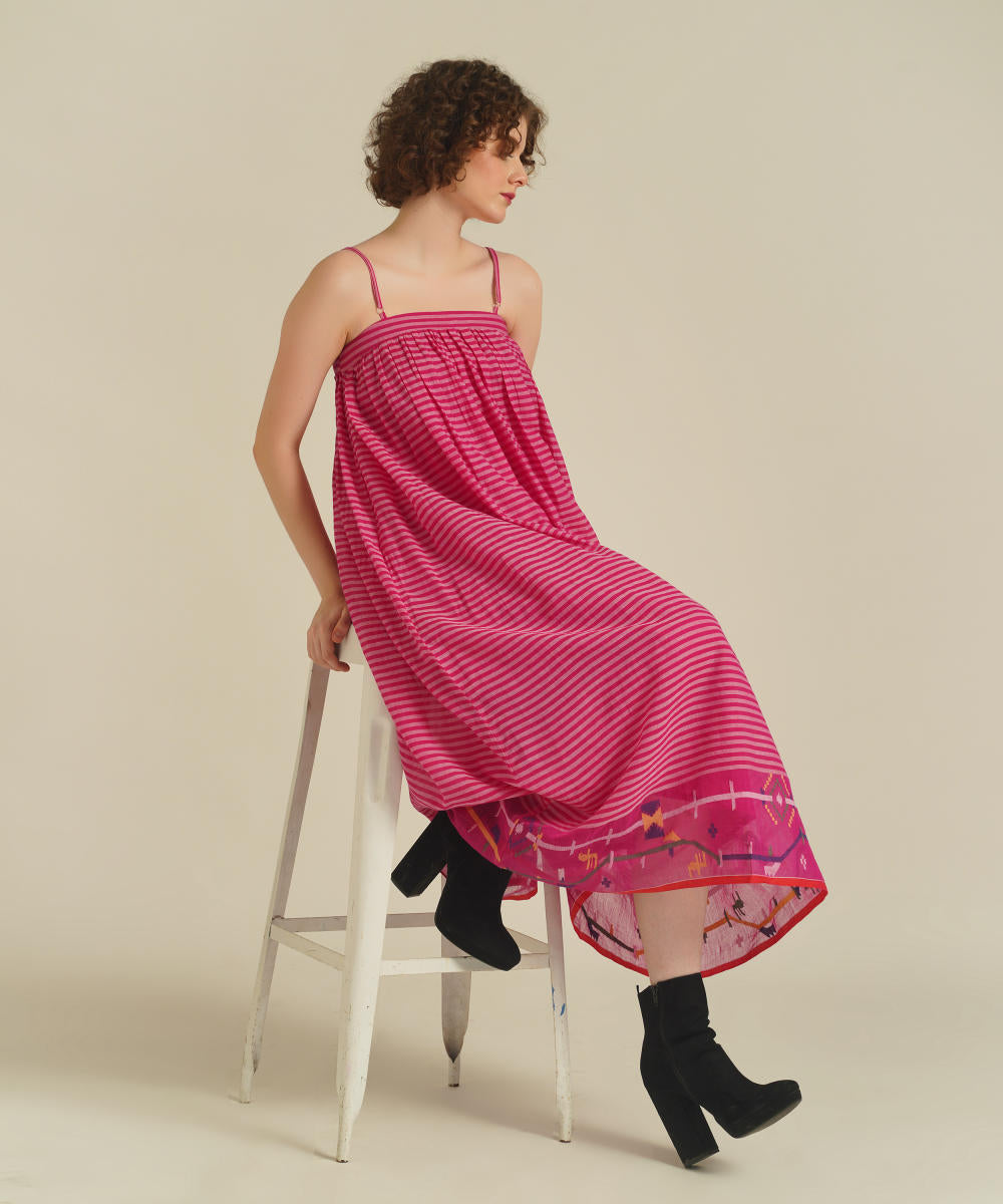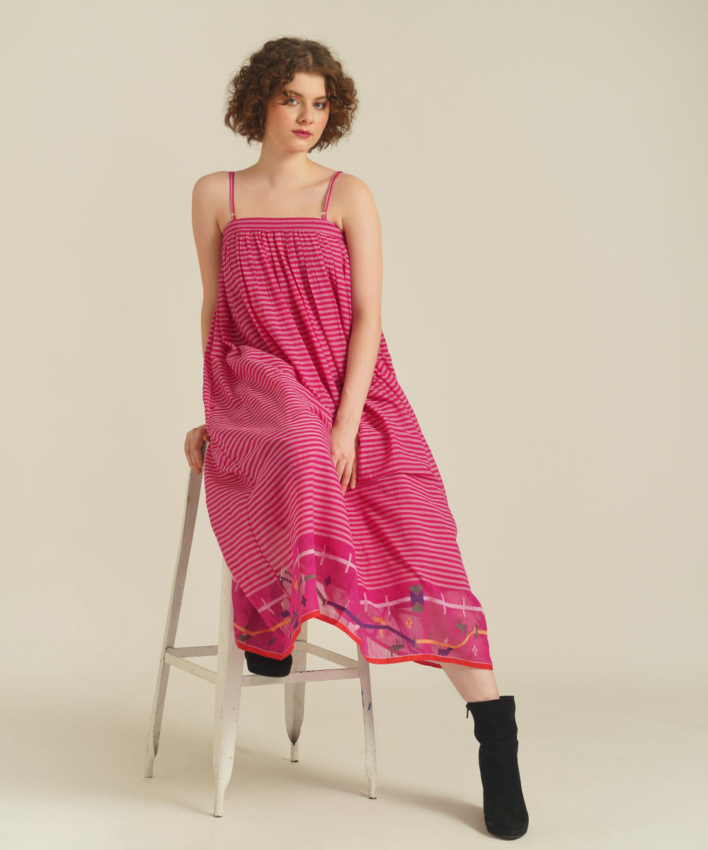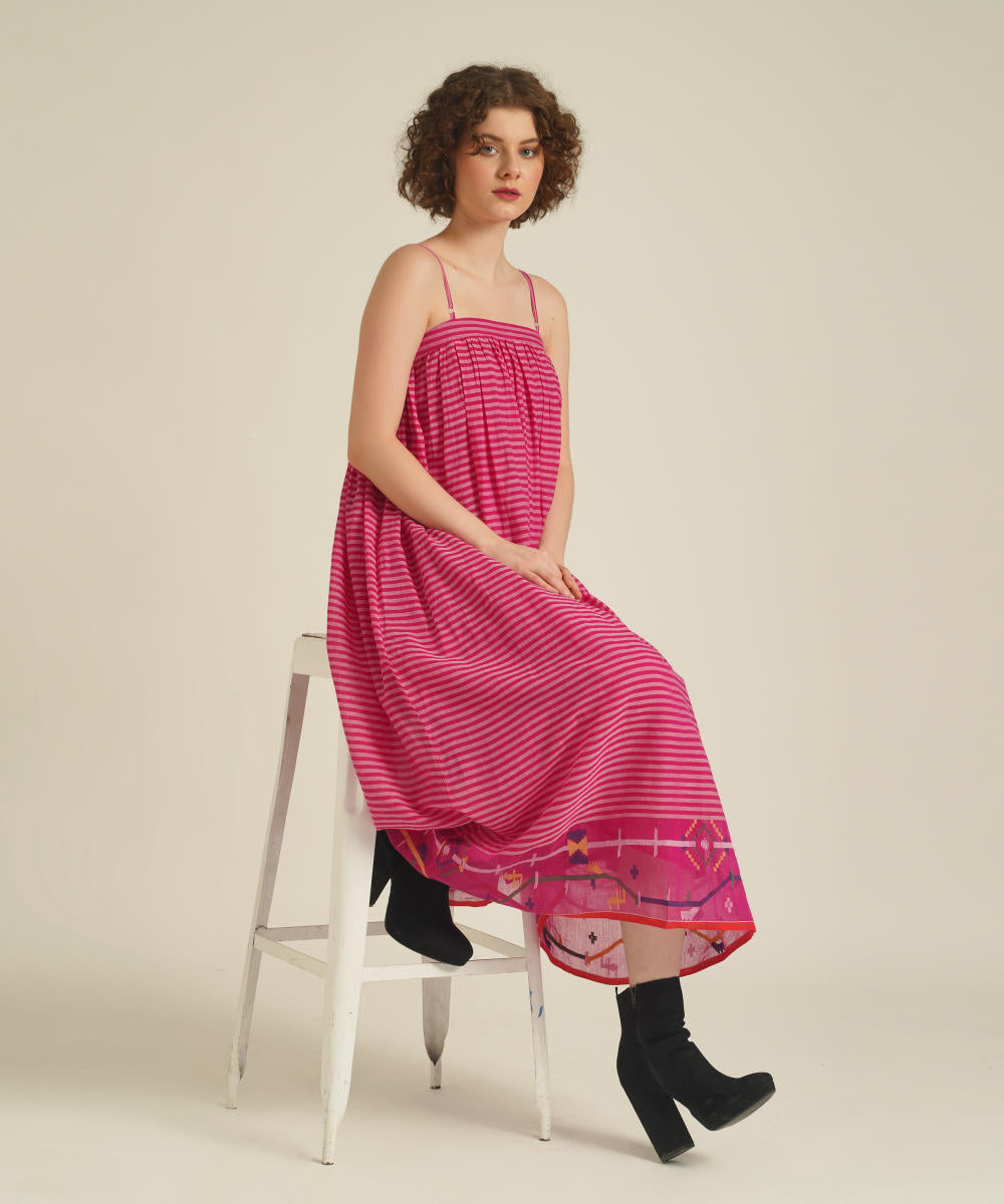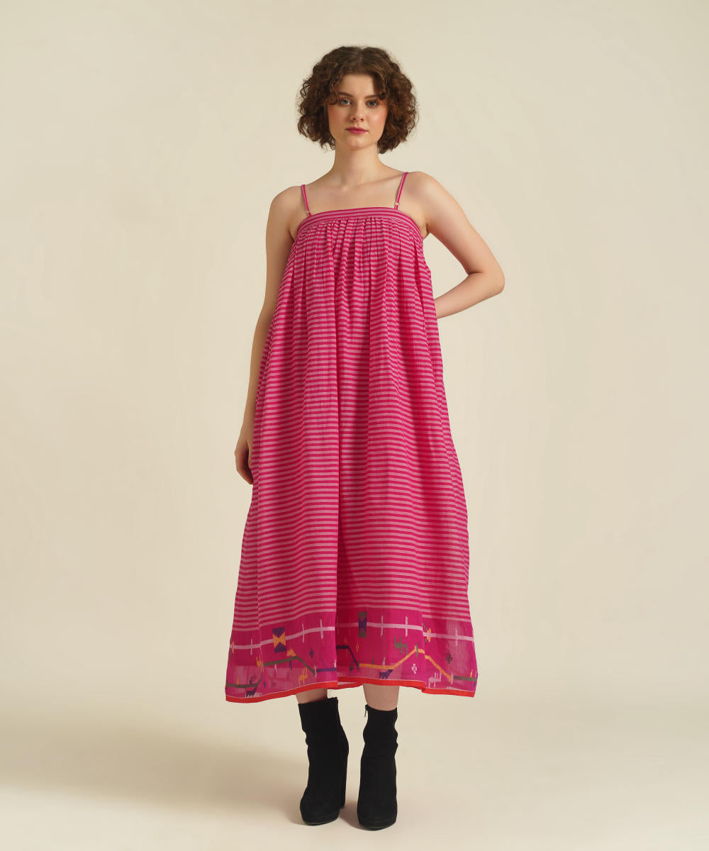 A classic strap dress features adjustable spaghetti strap, gentle gathers at yoke and comes with side pockets.