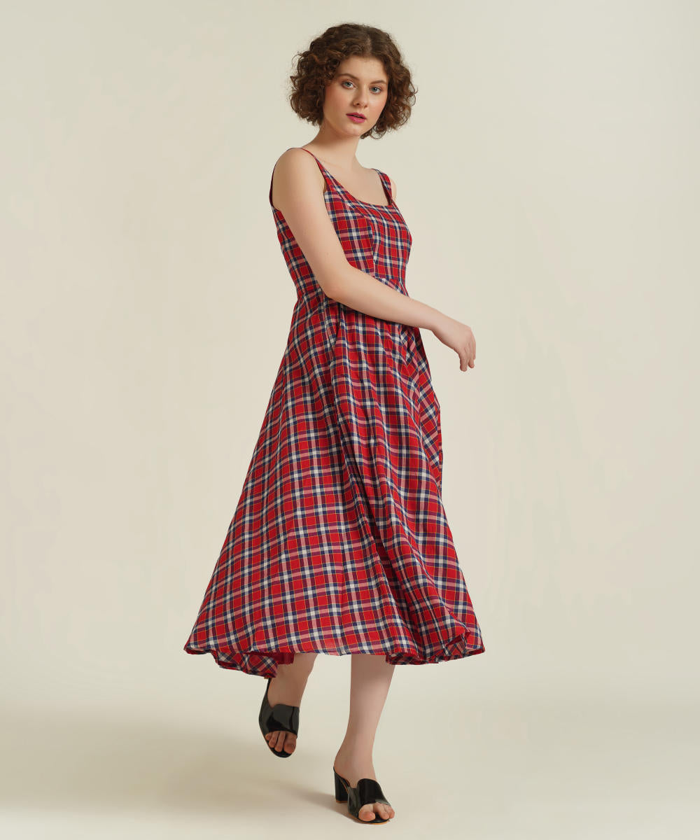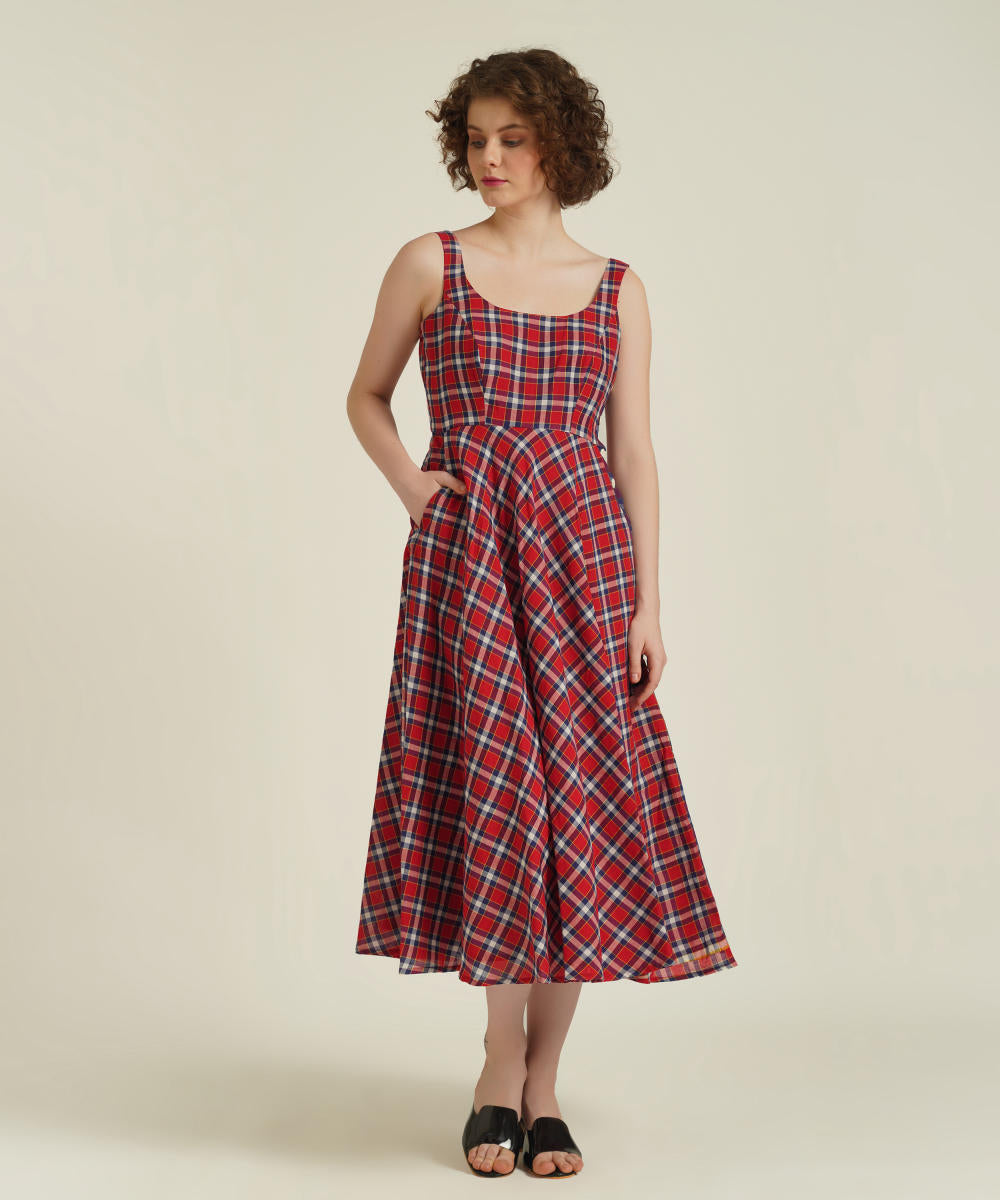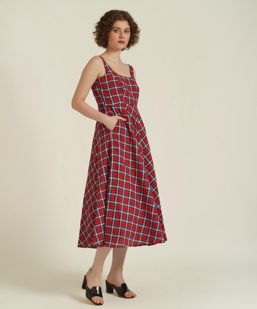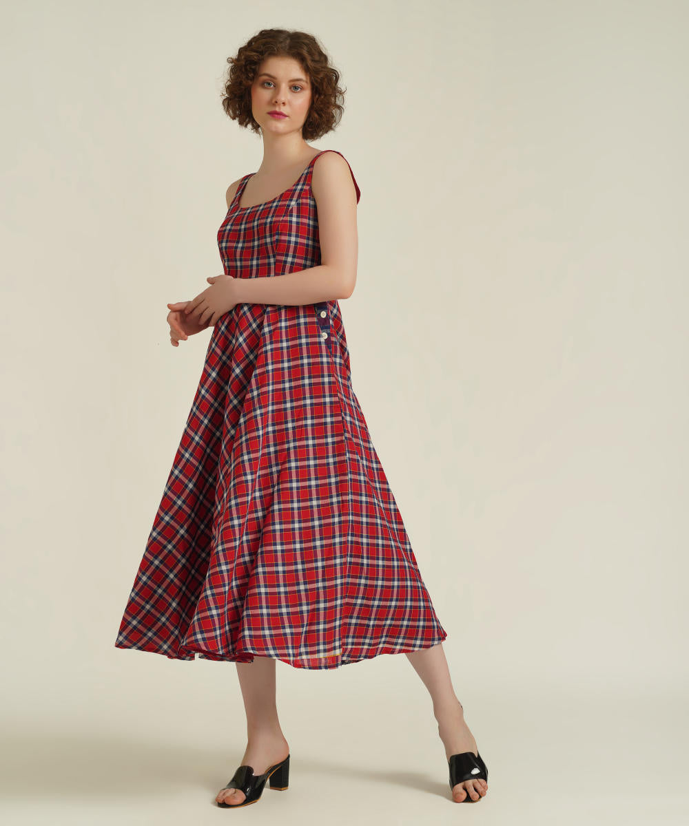 A classic fit and flare dress features fitted bodice, semi circular skirt, side button fastening and comes with side seam pockets.