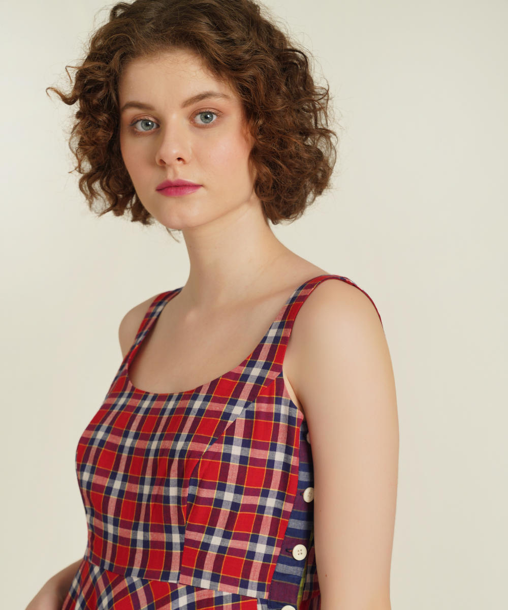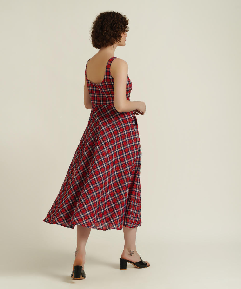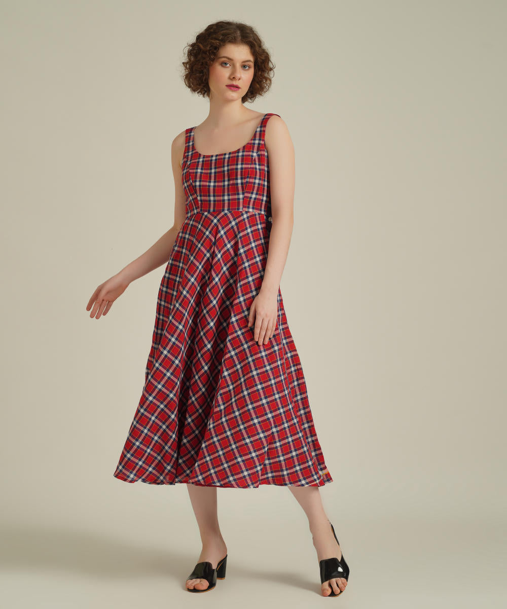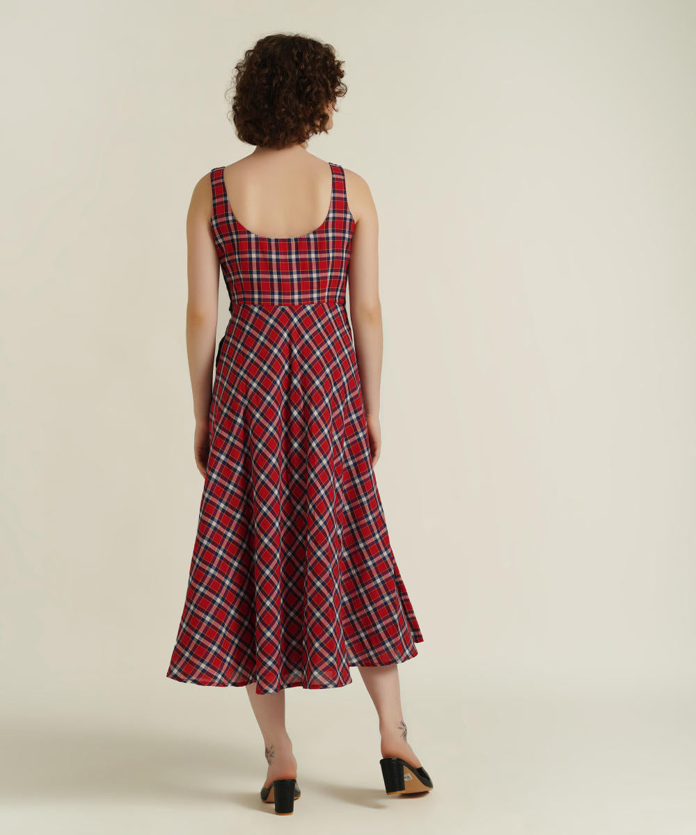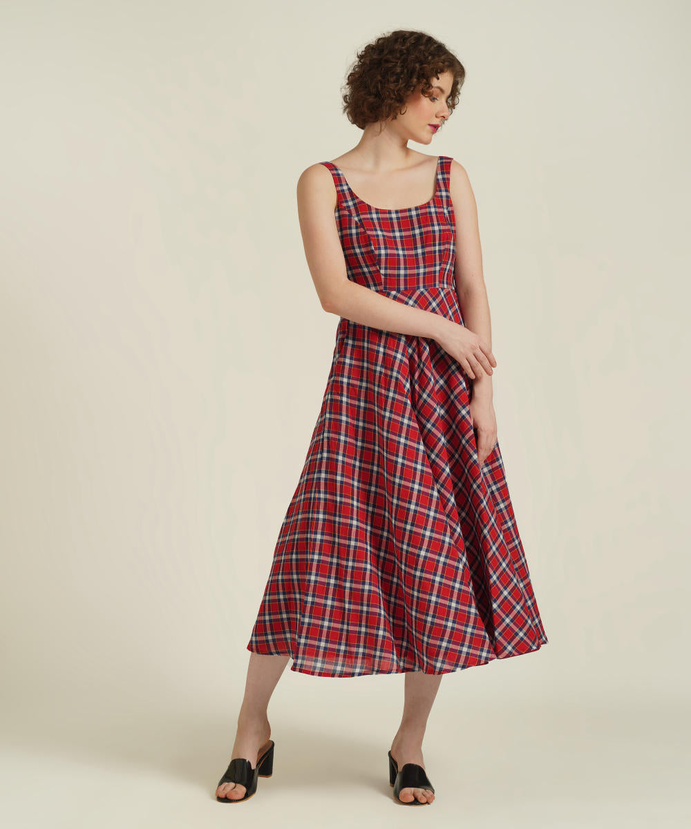 A classic fit and flare dress features fitted bodice, semi circular skirt, side button fastening and comes with side seam pockets.