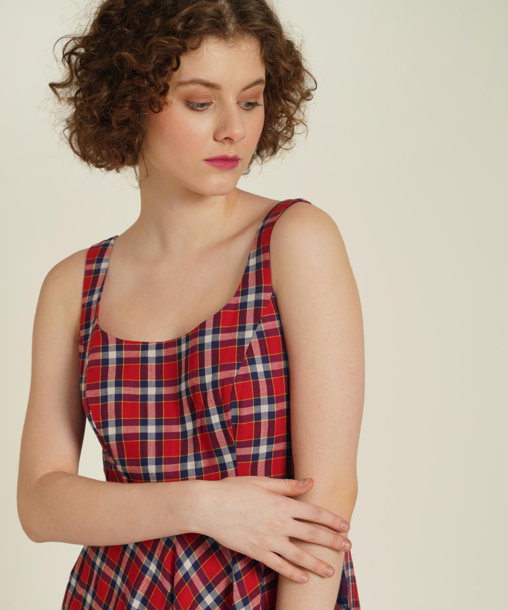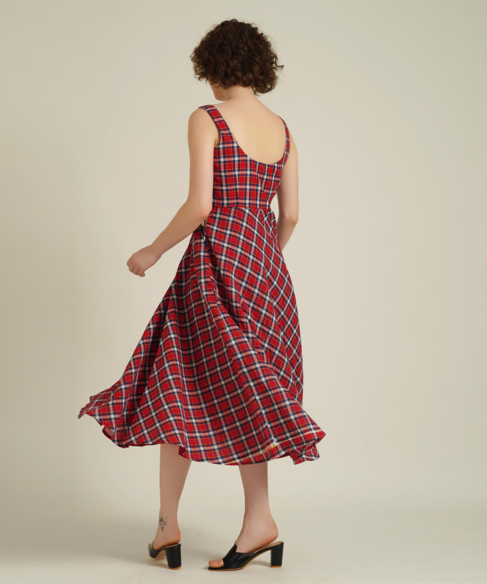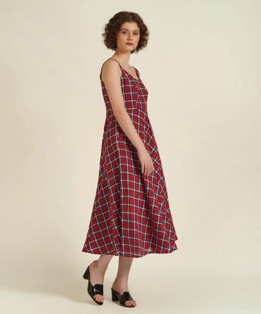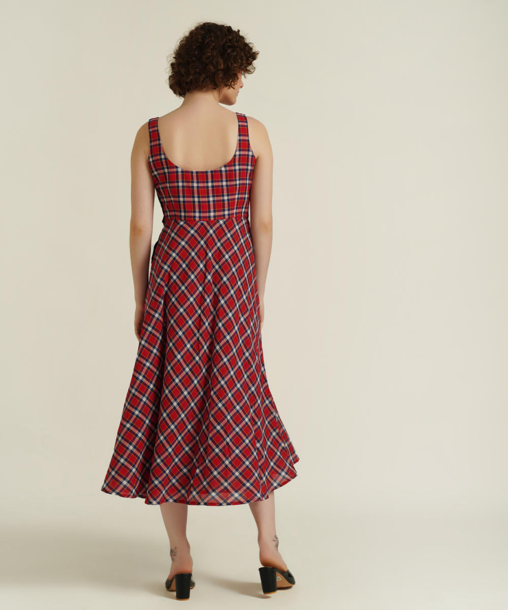 A classic fit and flare dress features fitted bodice, semi circular skirt, side button fastening and comes with side seam pockets.