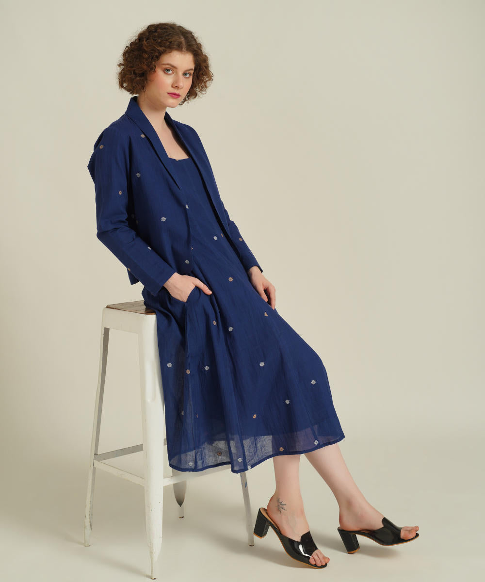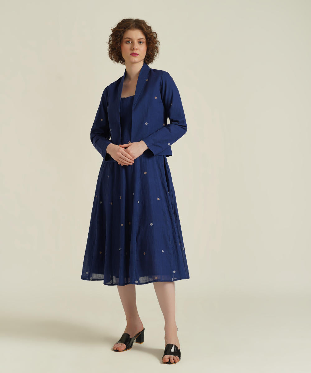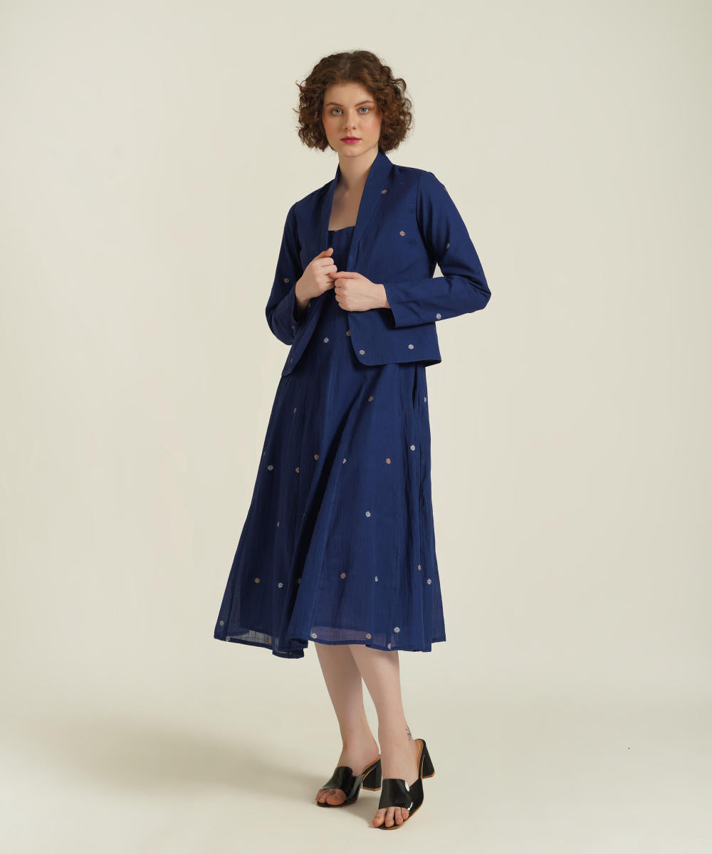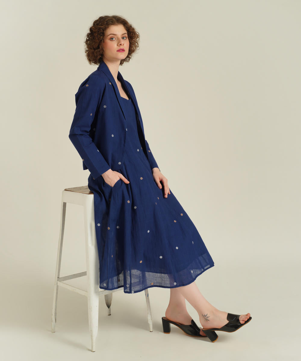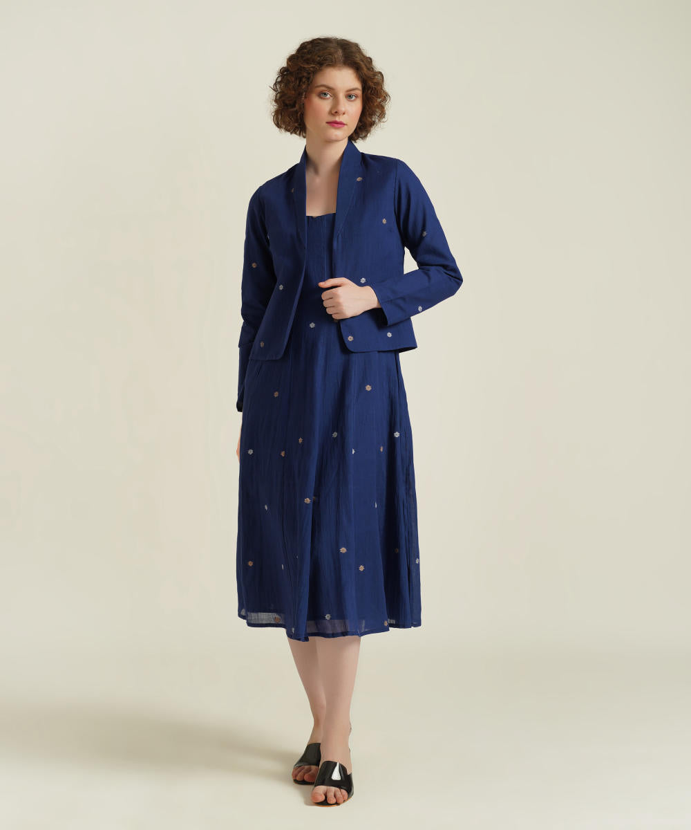 The jamdani fit-and-flare ensemble featuring a deep square neck dress with back zipper fastening, kali/panel detailing, side pockets and a jamdani co-ord jacket.