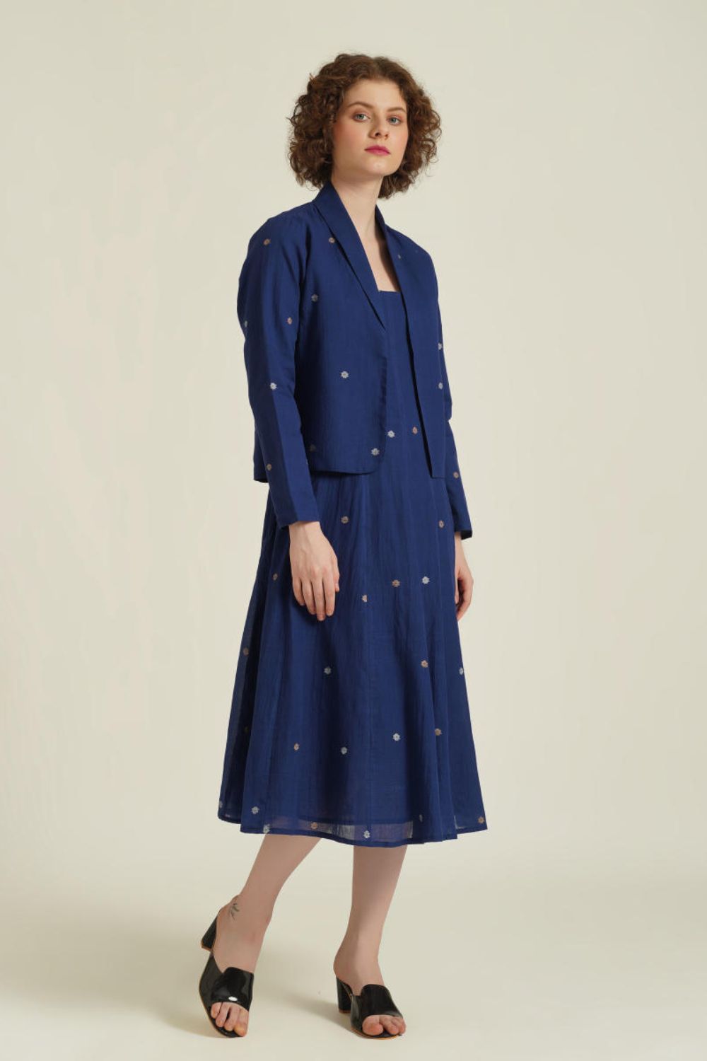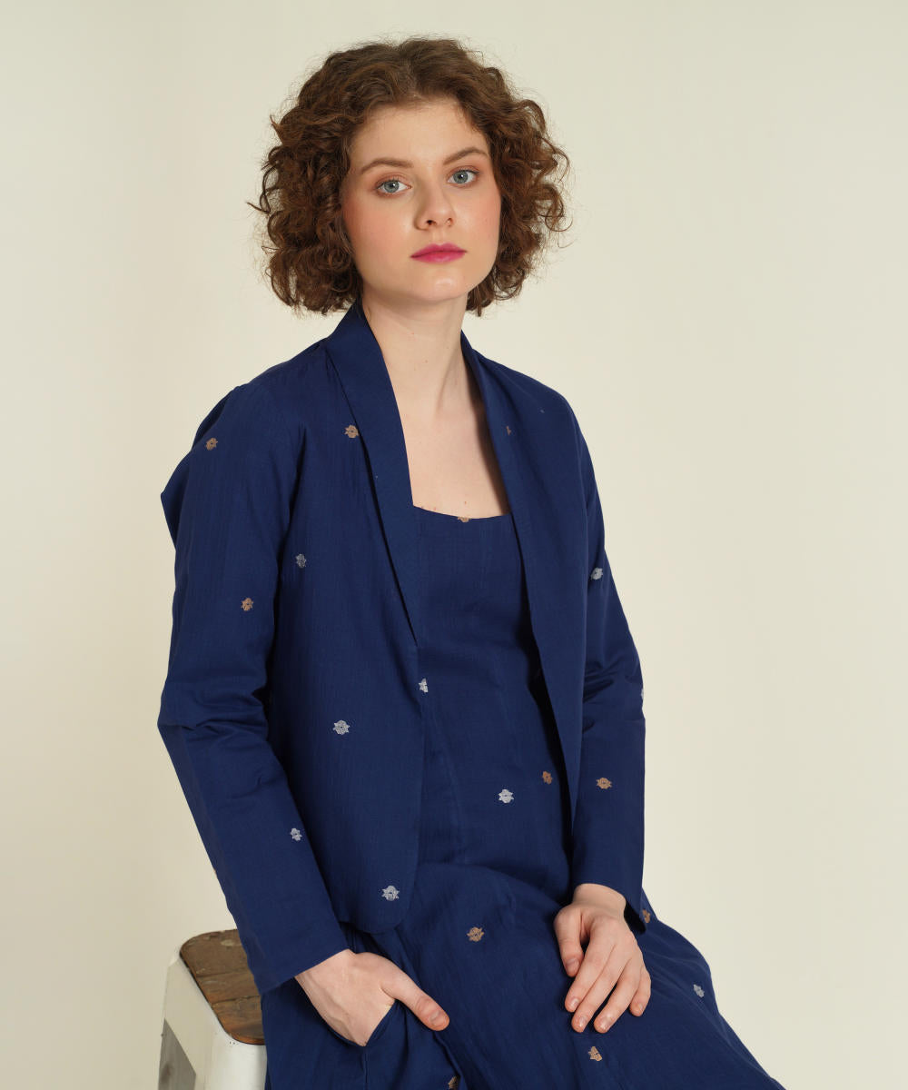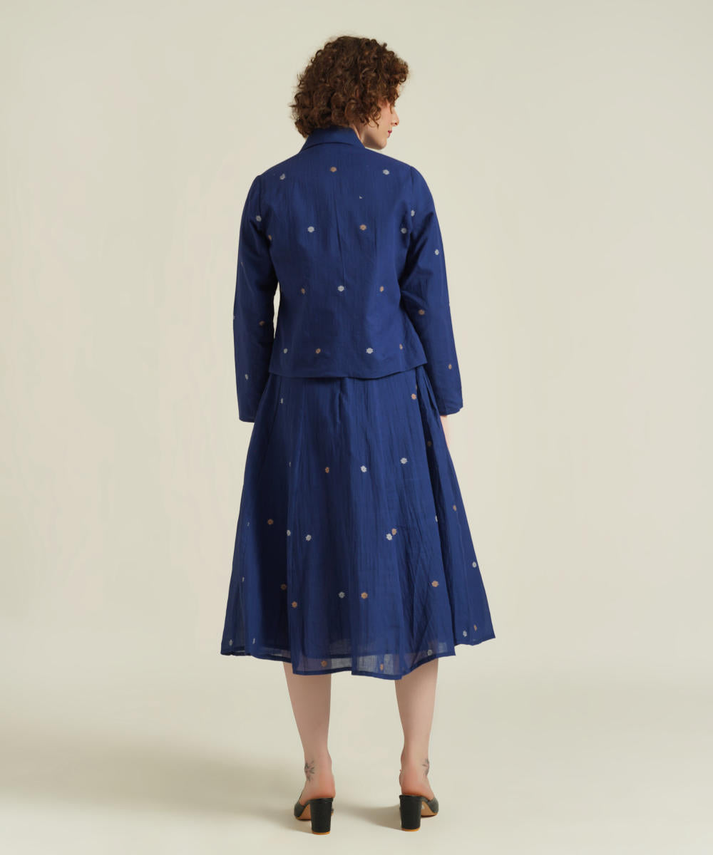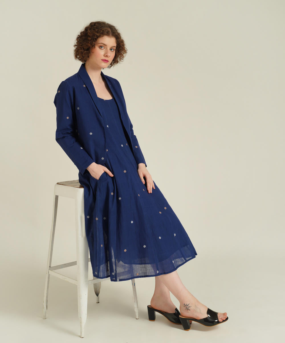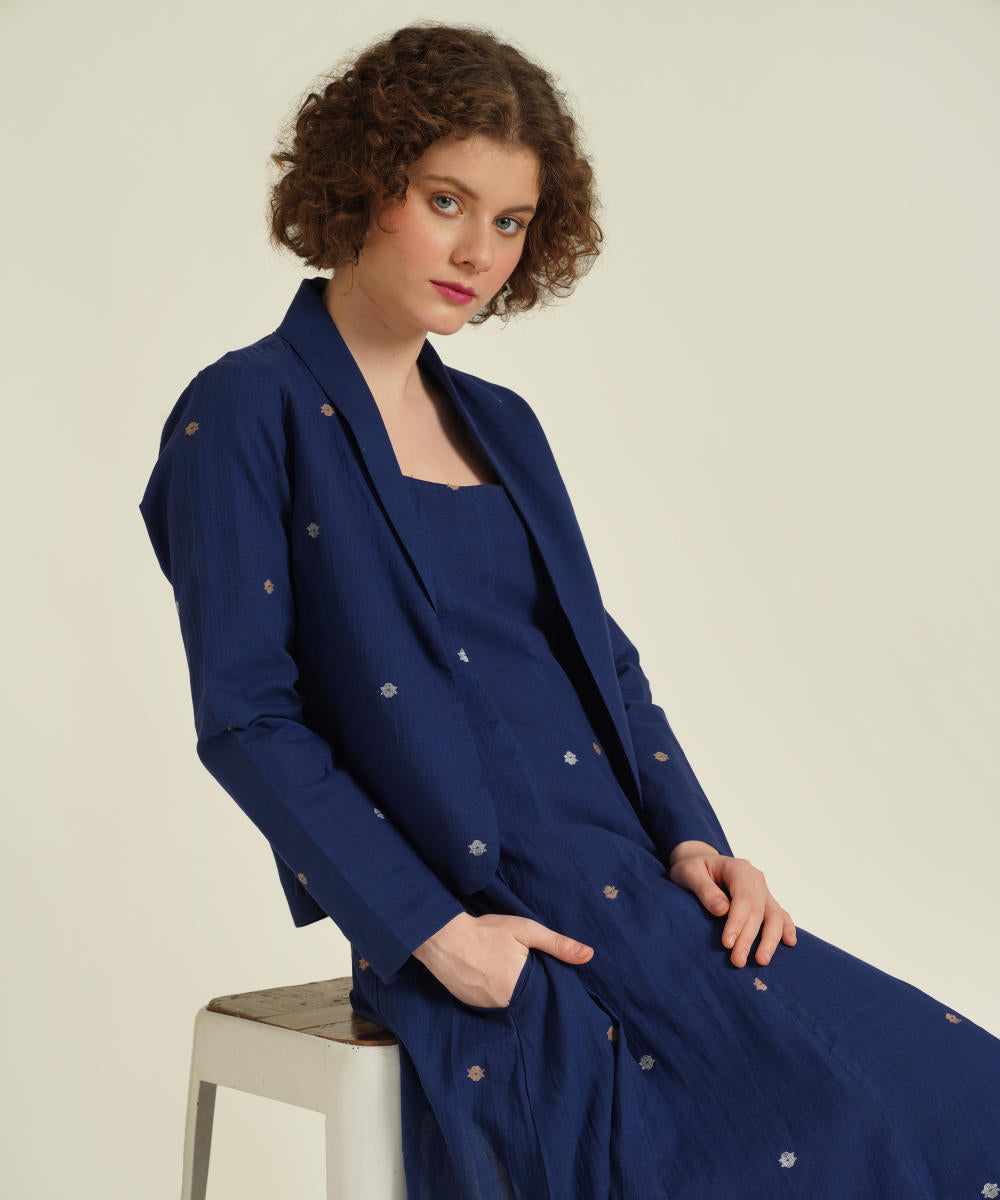 The jamdani fit-and-flare ensemble featuring a deep square neck dress with back zipper fastening, kali/panel detailing, side pockets and a jamdani co-ord jacket.
