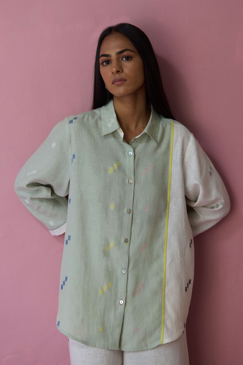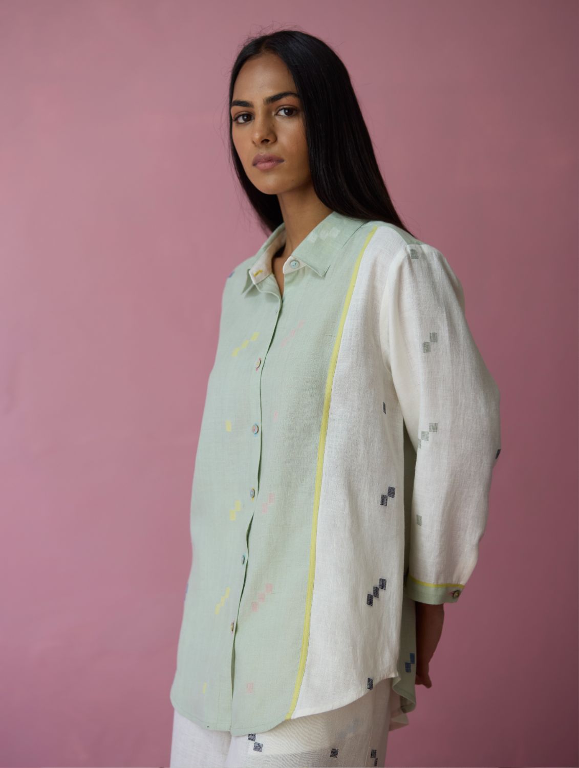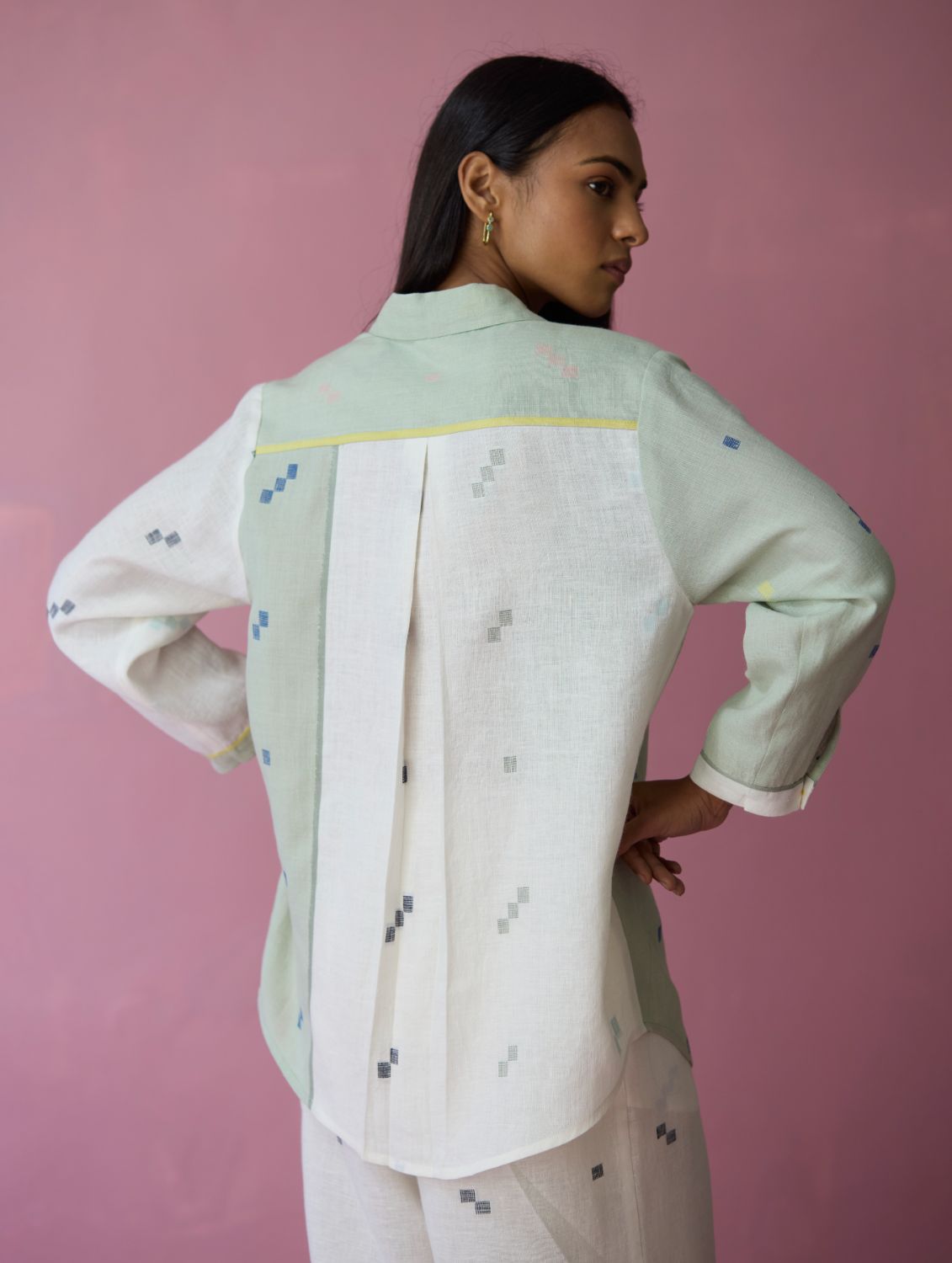 Shirt - The Sela colour-block shirt is our expression of handwoven craft and thoughtful design. Our signature best-selling shirt bodice is crafted in handloom soft jamdani linen with a distinctive varying 4-colour square motif weave. Designed with carefully constructed colour-block panels of aqua jamdani linen and ivory jamdani linen with woven selvedge details thoughtfully placed along the front, back, and sleeve cuffs. Designed for ease and movement, the shirt is detailed with a back inverted pleat and is finished with small mother-of-pearl buttons. One of our favourites this year!