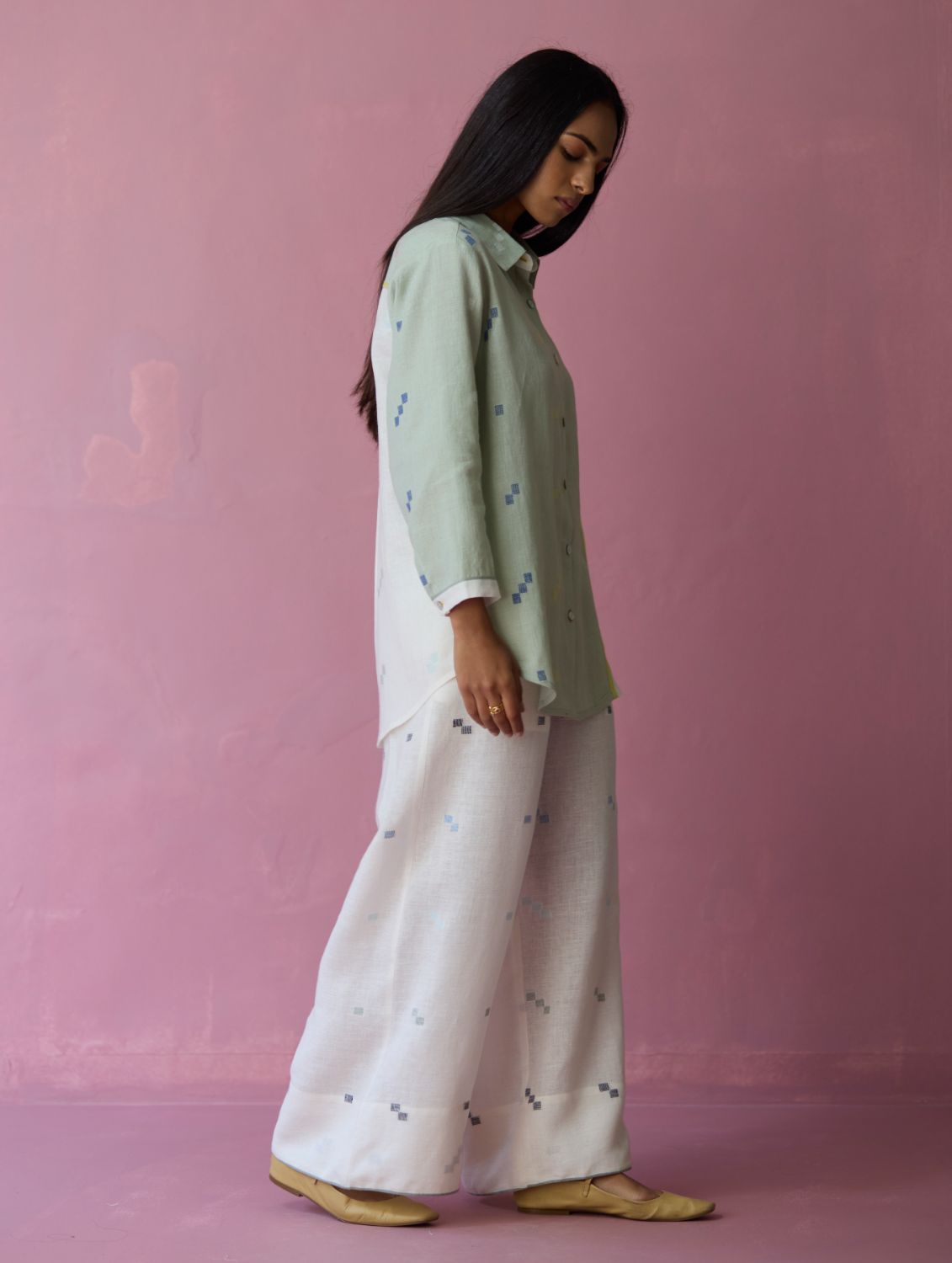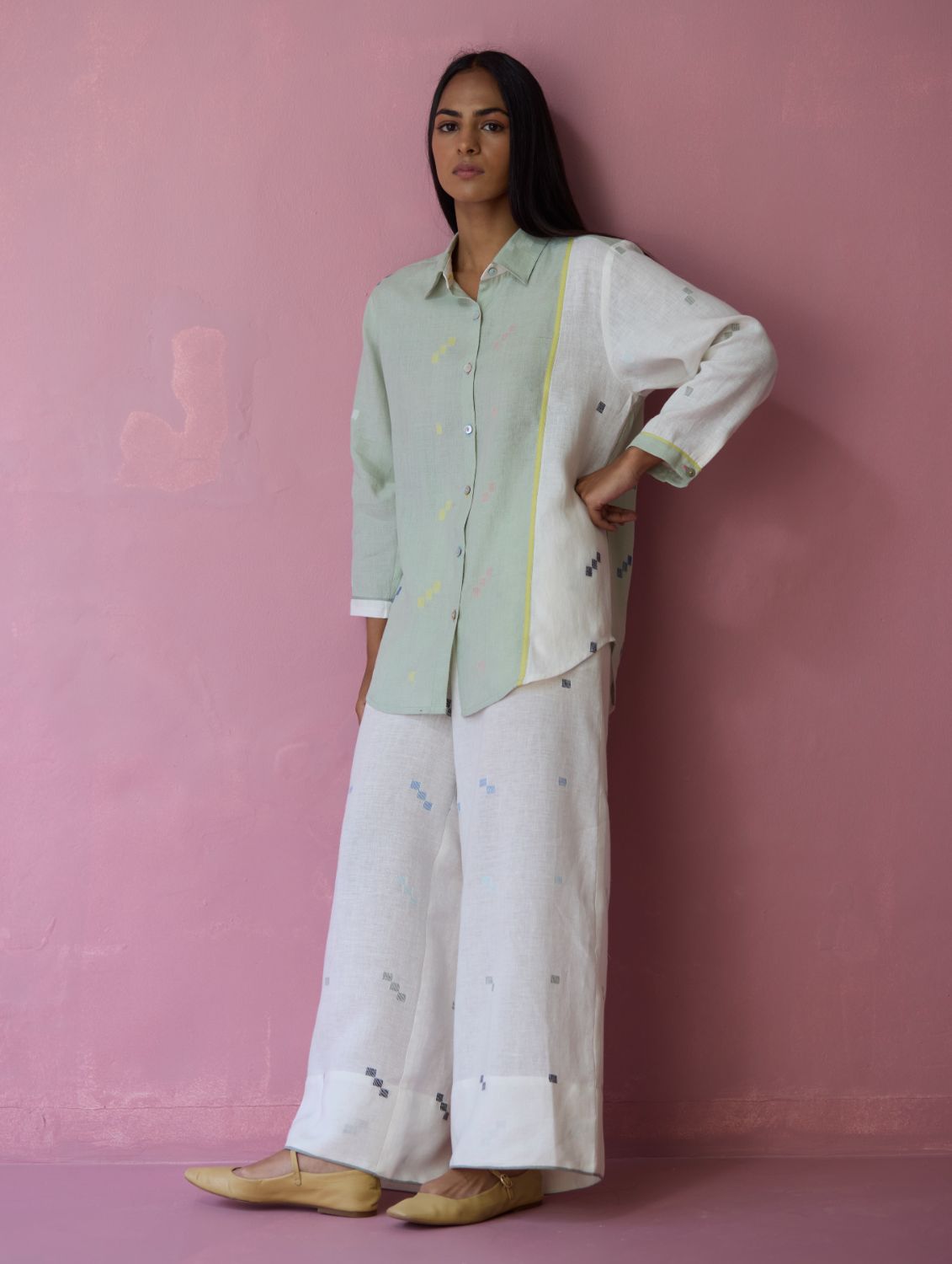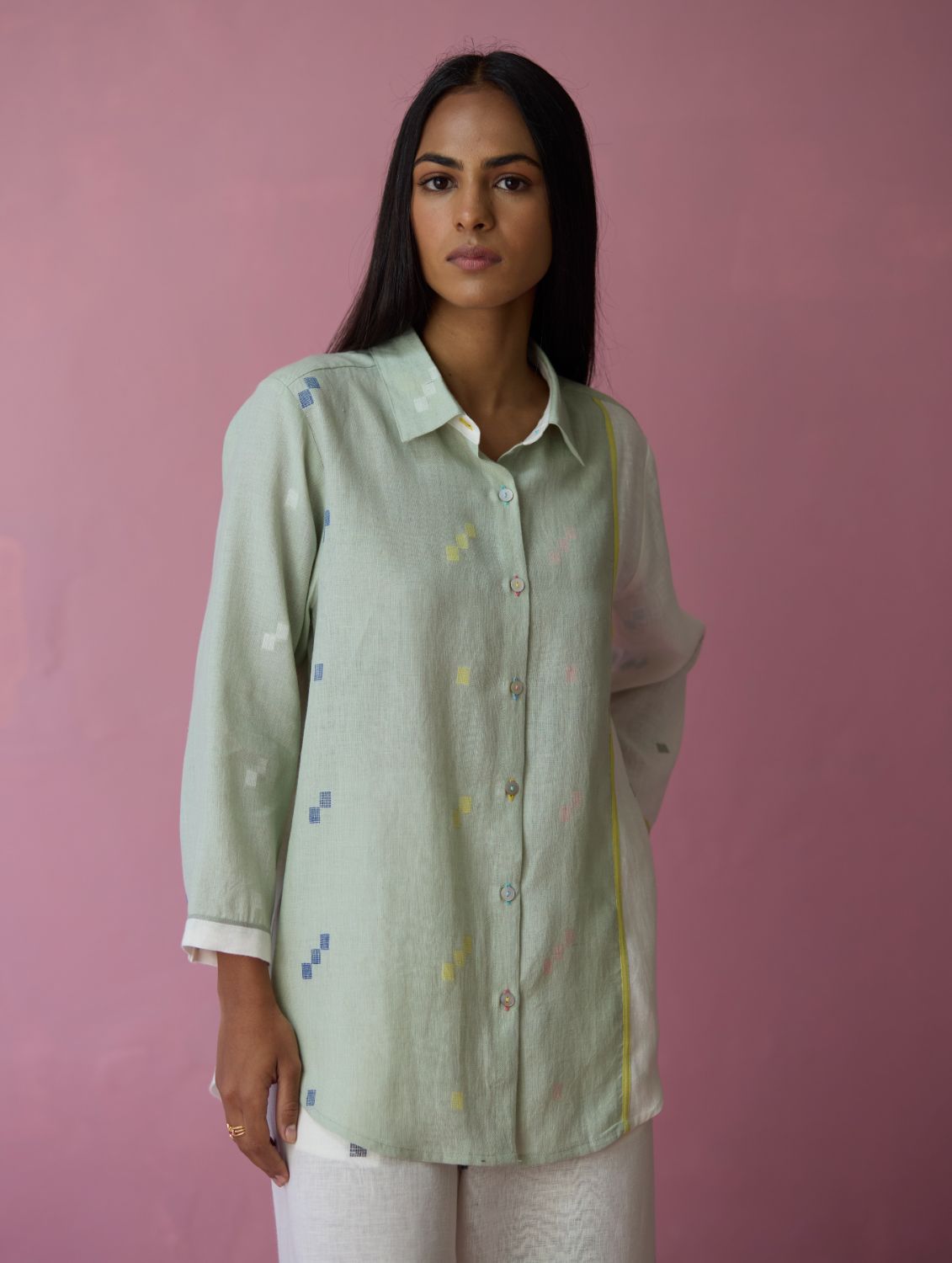 Shirt - The Sela colour-block shirt is our expression of handwoven craft and thoughtful design. Our signature best-selling shirt bodice is crafted in handloom soft jamdani linen with a distinctive varying 4-colour square motif weave. Designed with carefully constructed colour-block panels of aqua jamdani linen and ivory jamdani linen with woven selvedge details thoughtfully placed along the front, back, and sleeve cuffs. Designed for ease and movement, the shirt is detailed with a back inverted pleat and is finished with small mother-of-pearl buttons. One of our favourites this year!