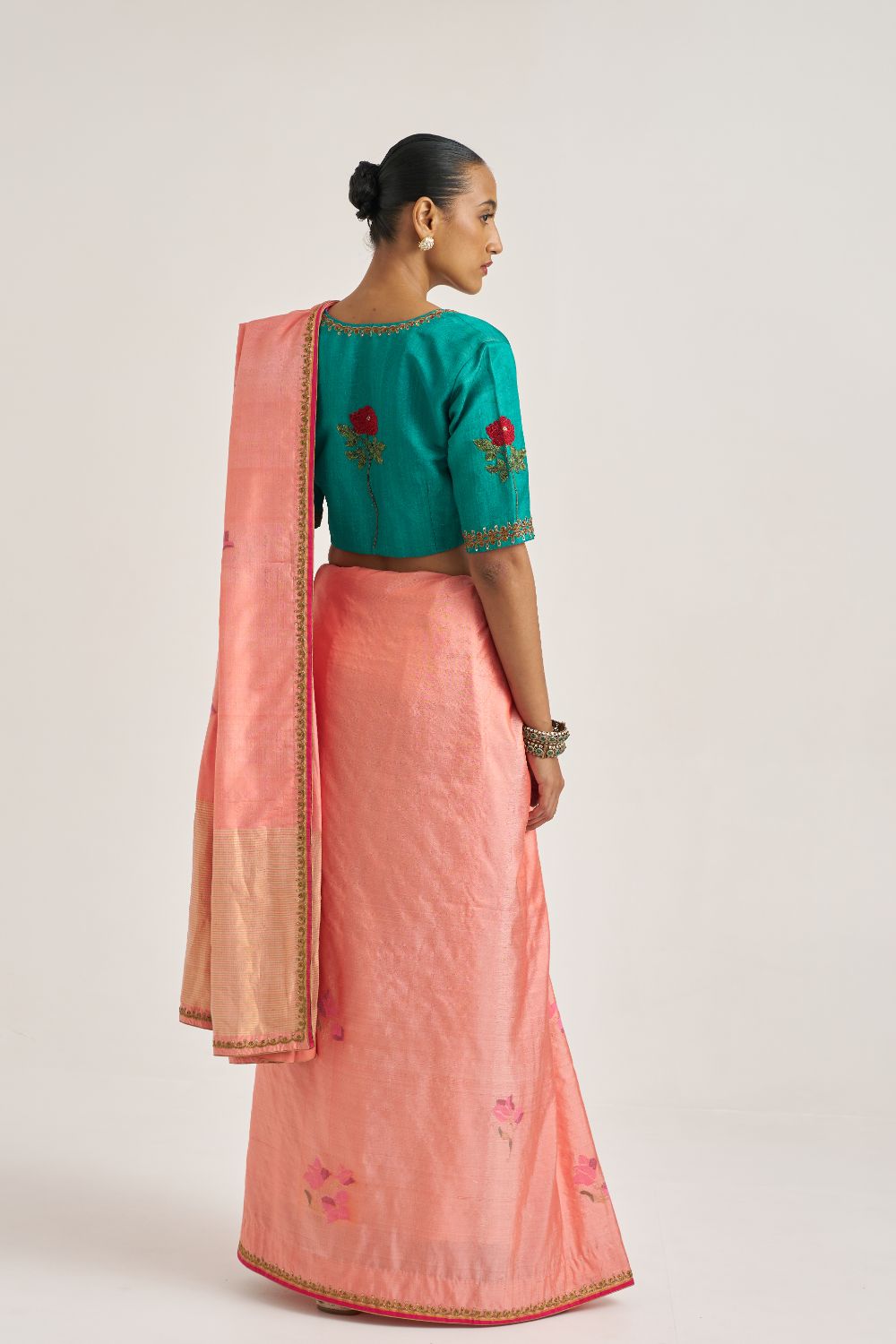 A Peach Handwoven Mulberry Silk Sari Detailed With Bouganvilla Floral Bunch Jamdani Motifs, A Striped Zari Pallu, An Ari Hand Embroidered Border Along A Red Selvedge.