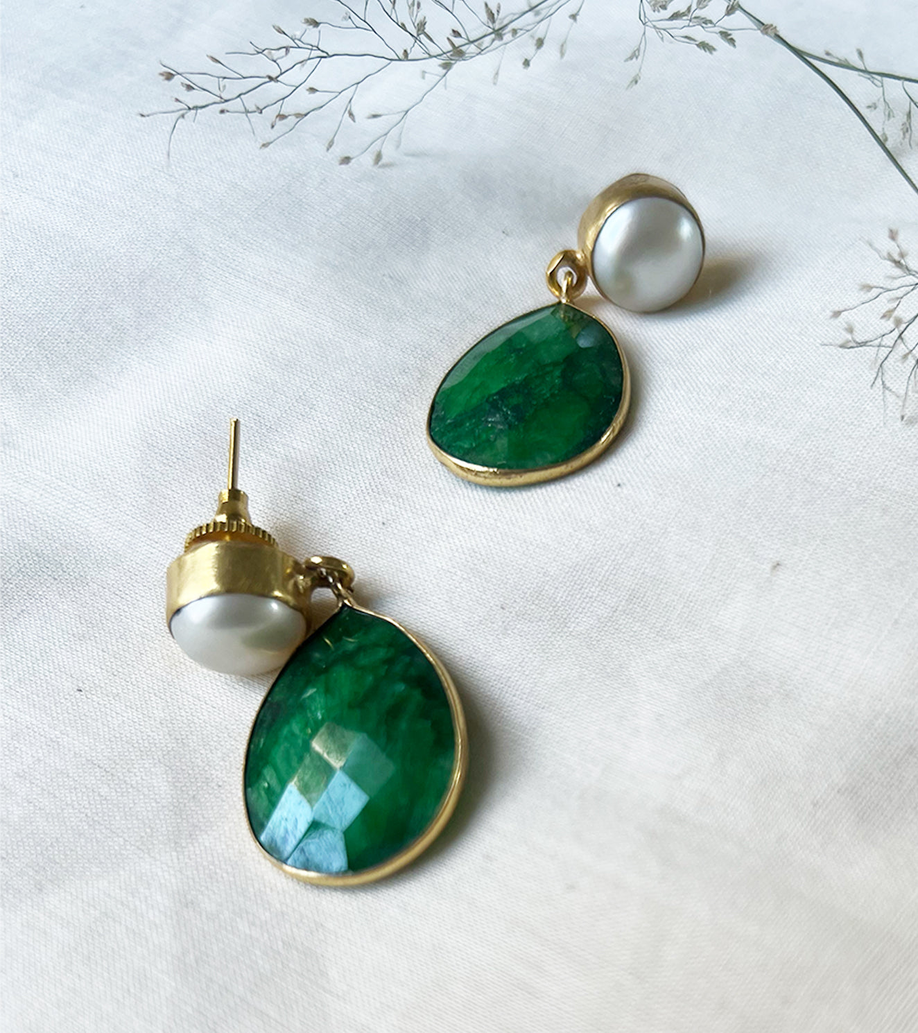 A graceful dangly earring studded with pearl and a green stone that will take you from day to night with ease. An exquisite pair to complete your charming look. All our pieces are made in Jaipur, India. Constructed in brass and dipped in 18 karat gold by our artisans. Designed for effortless & minimal styling. Handcrafted in India.