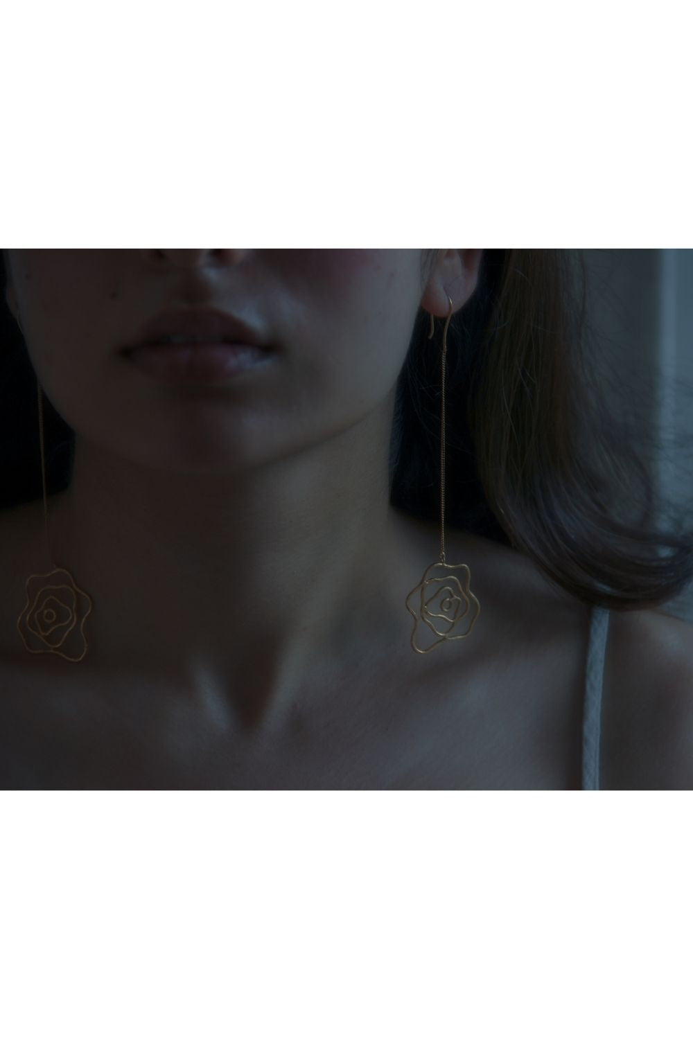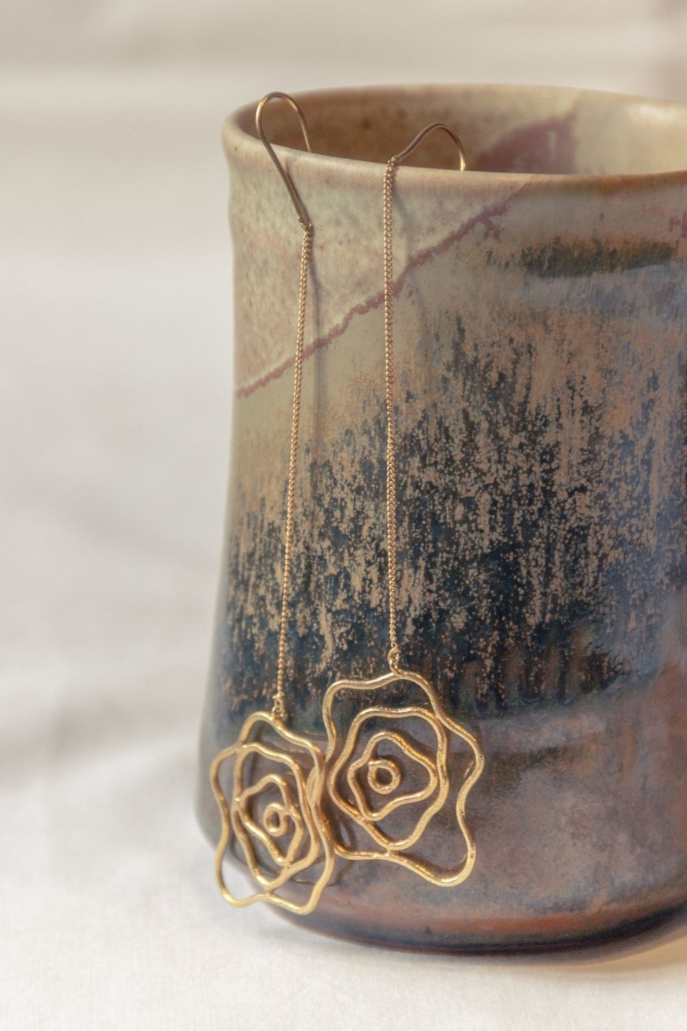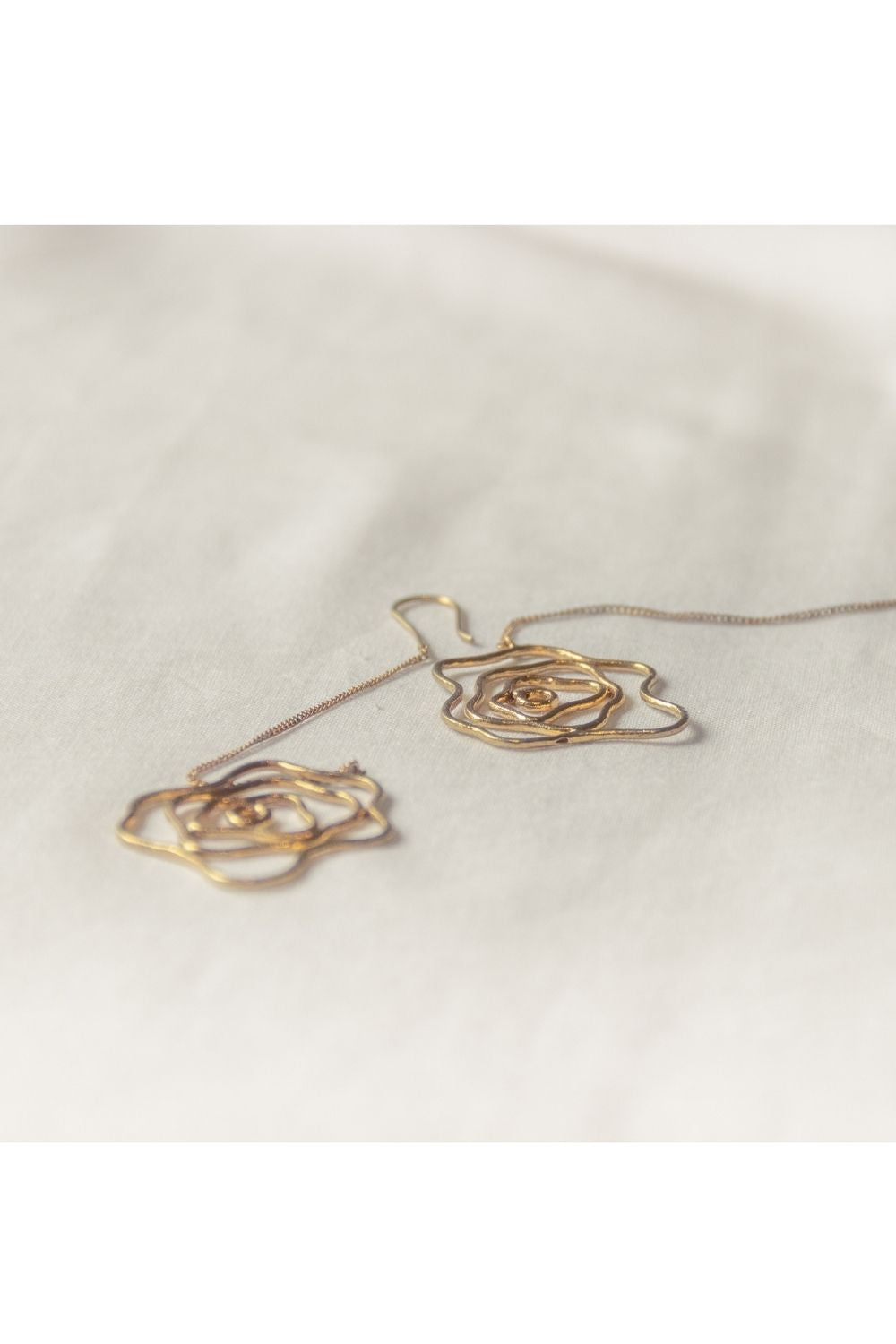A whimsical rose anchoring the dainty chain earrings, ethically handcrafted in brass and rhodium plated jewellery.