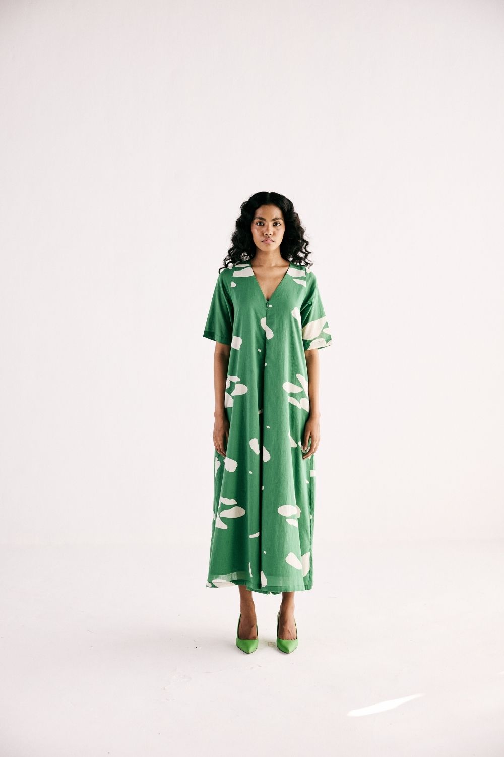 A grass green mosiac printed jumpsuit with a front zipper opening and v neckline in classic A line silhouette. crafted in soft breathable cotton mul.