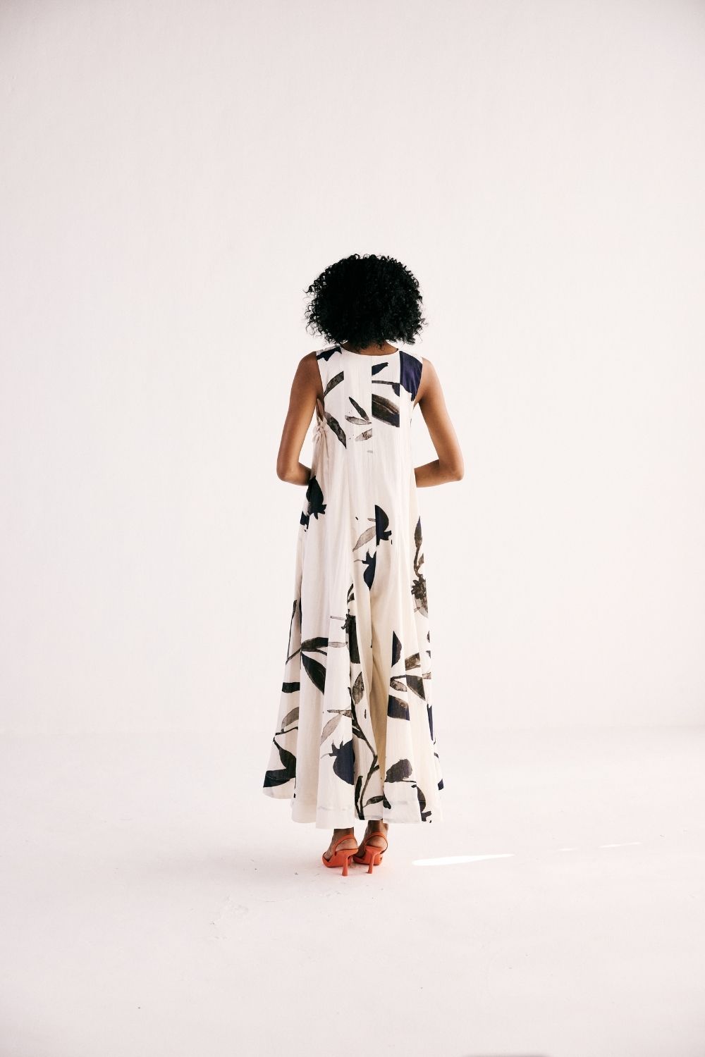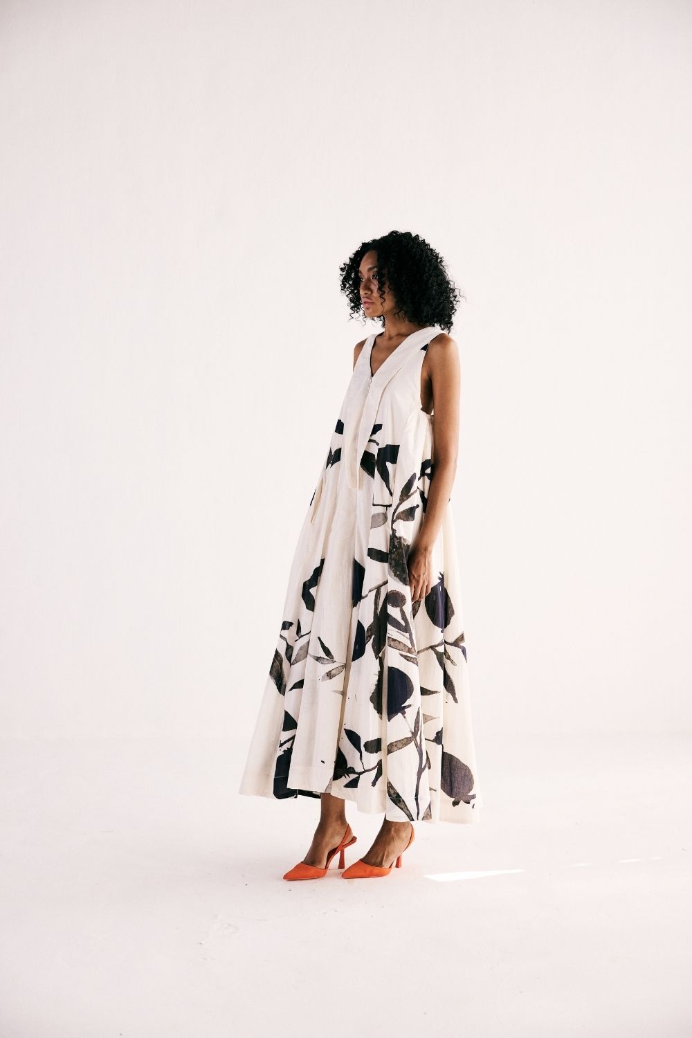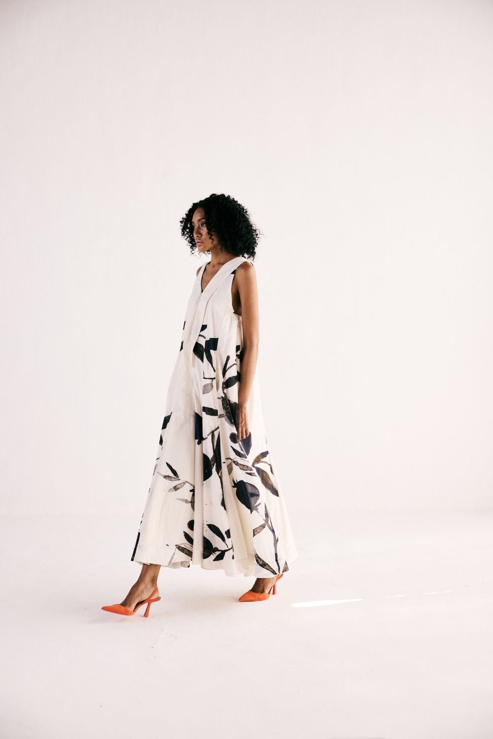 A classic off white floral art printed jumpsuit with a front zip opening, V neckline and side pleats crafted in soft cotton mul