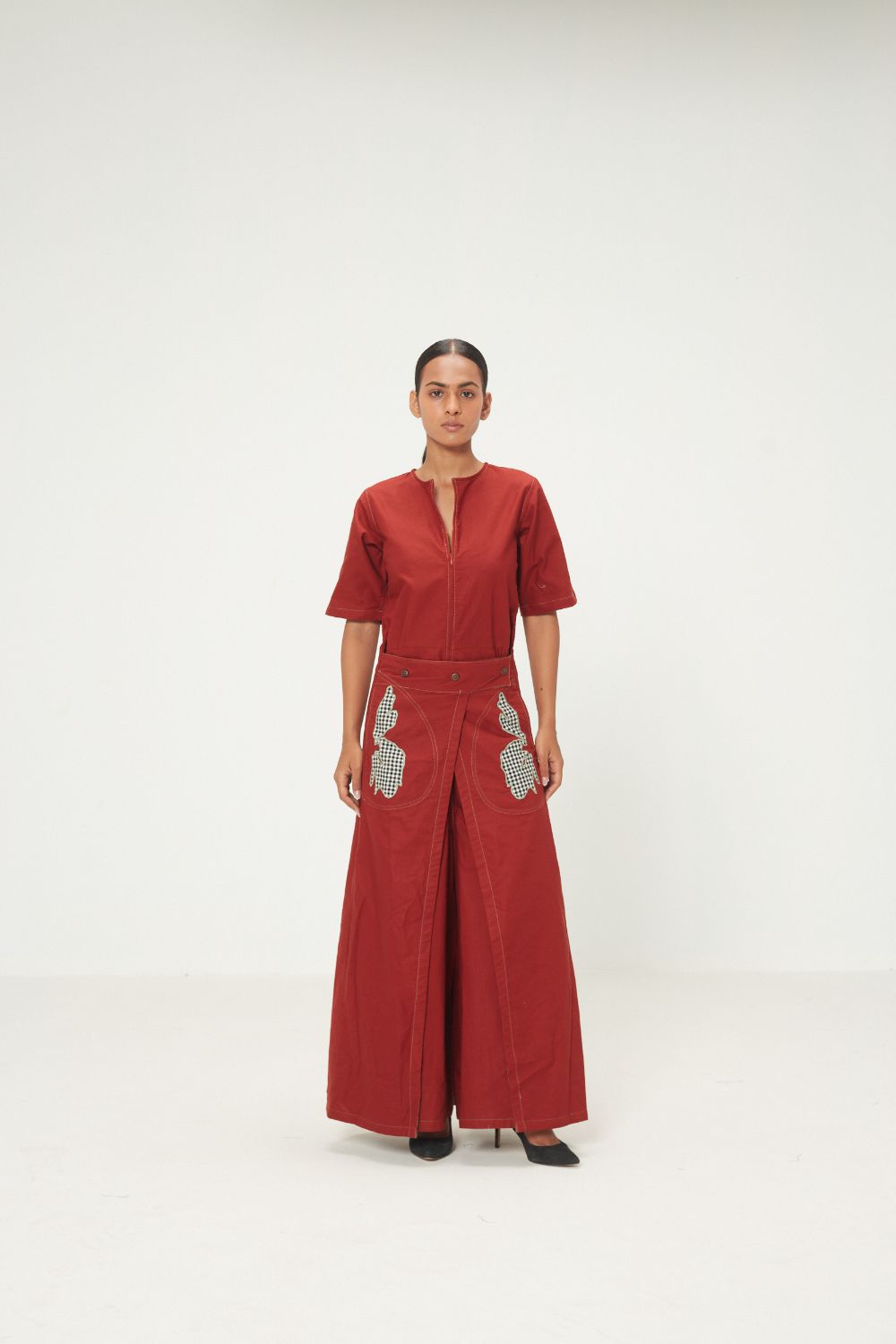 A contemporary utility-inspired silhouette in oxford, tailored in a deep red hue. The Maru Jumpsuit features abstract check patchwork, a minimal V-neckline, short sleeves, and an asymmetrical wrap-over front that buttons neatly at the waist. Wide-leg bottoms and side pockets add ease and structure - a refined balance of function and form.