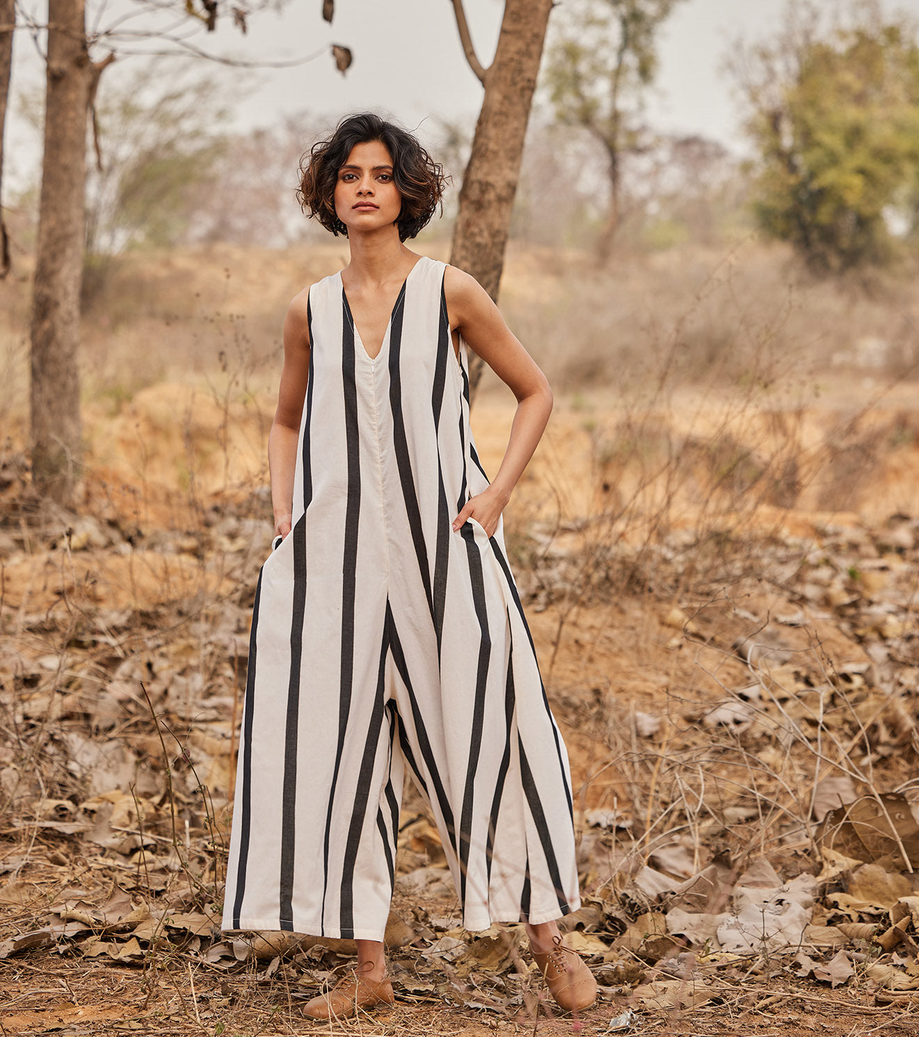 An off white mul jumpsuit with a front zipper opening and v neckline in classic deep blue stripes. - Handcrafted in India. - Side seam pockets