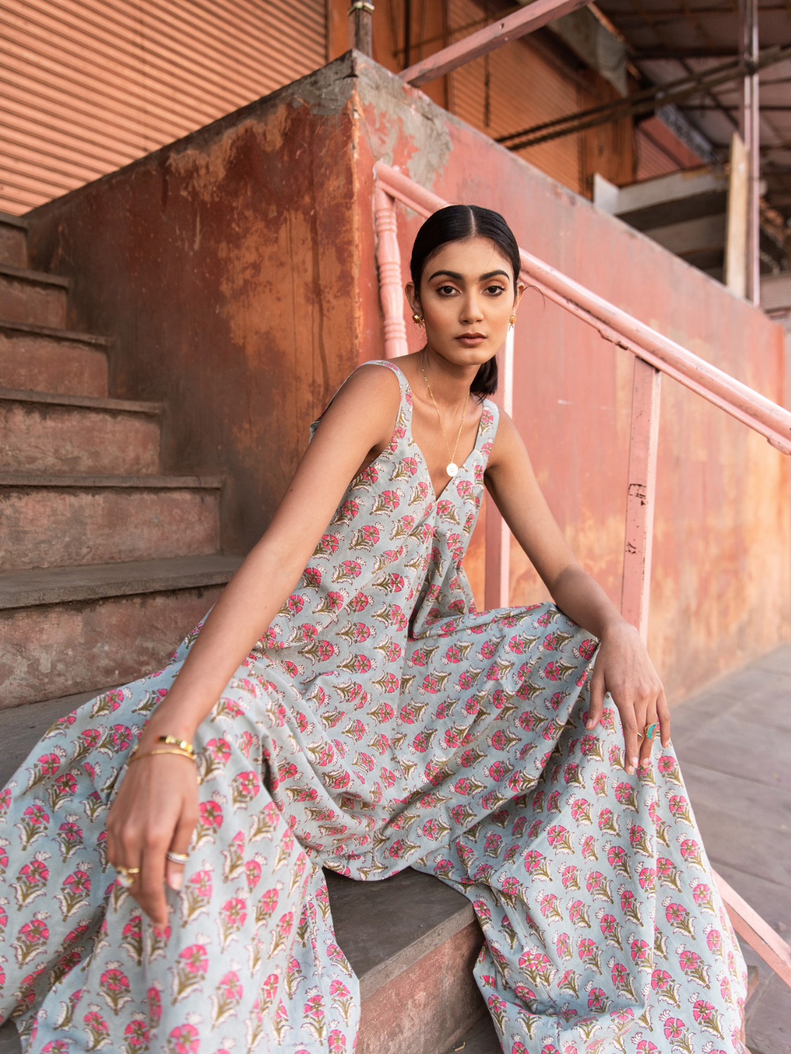 "Ilahi - Jaipur inspired patterns in the softest cottons and breeziest silhouettes help set your heart free. Feel the wanderlust within you as you embrace our looks for the perfect summer. Grey cotton is draped beautifully in our printed jumpsuit.