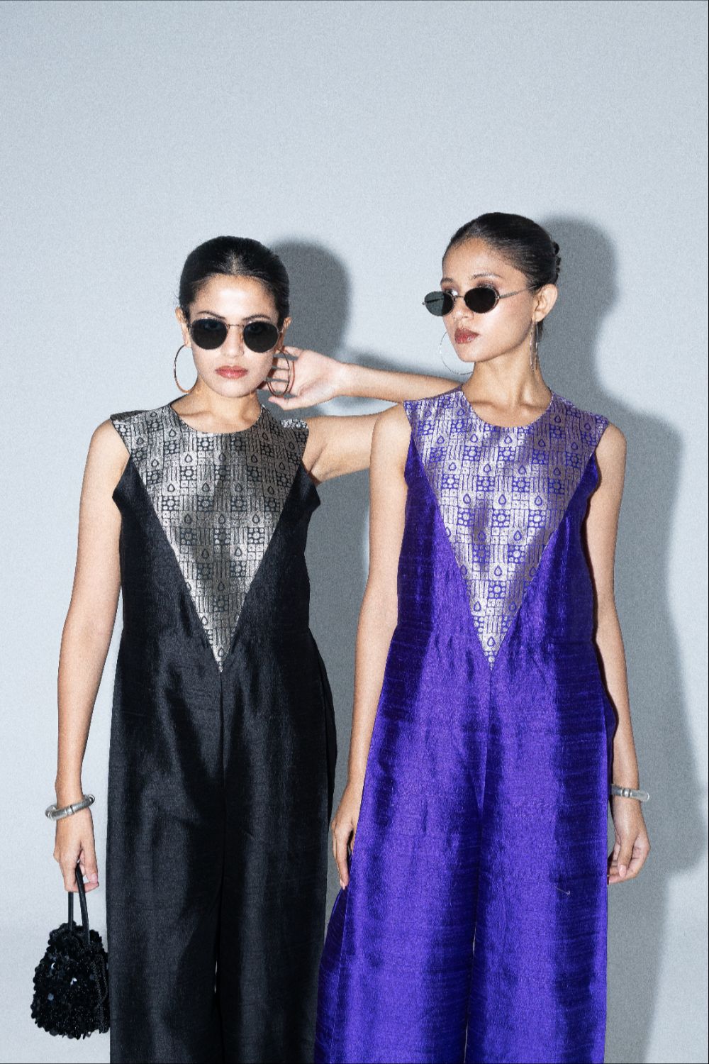 Black statement Raw Silkl Jumpsuit with Brocade detail at the neck and back.
