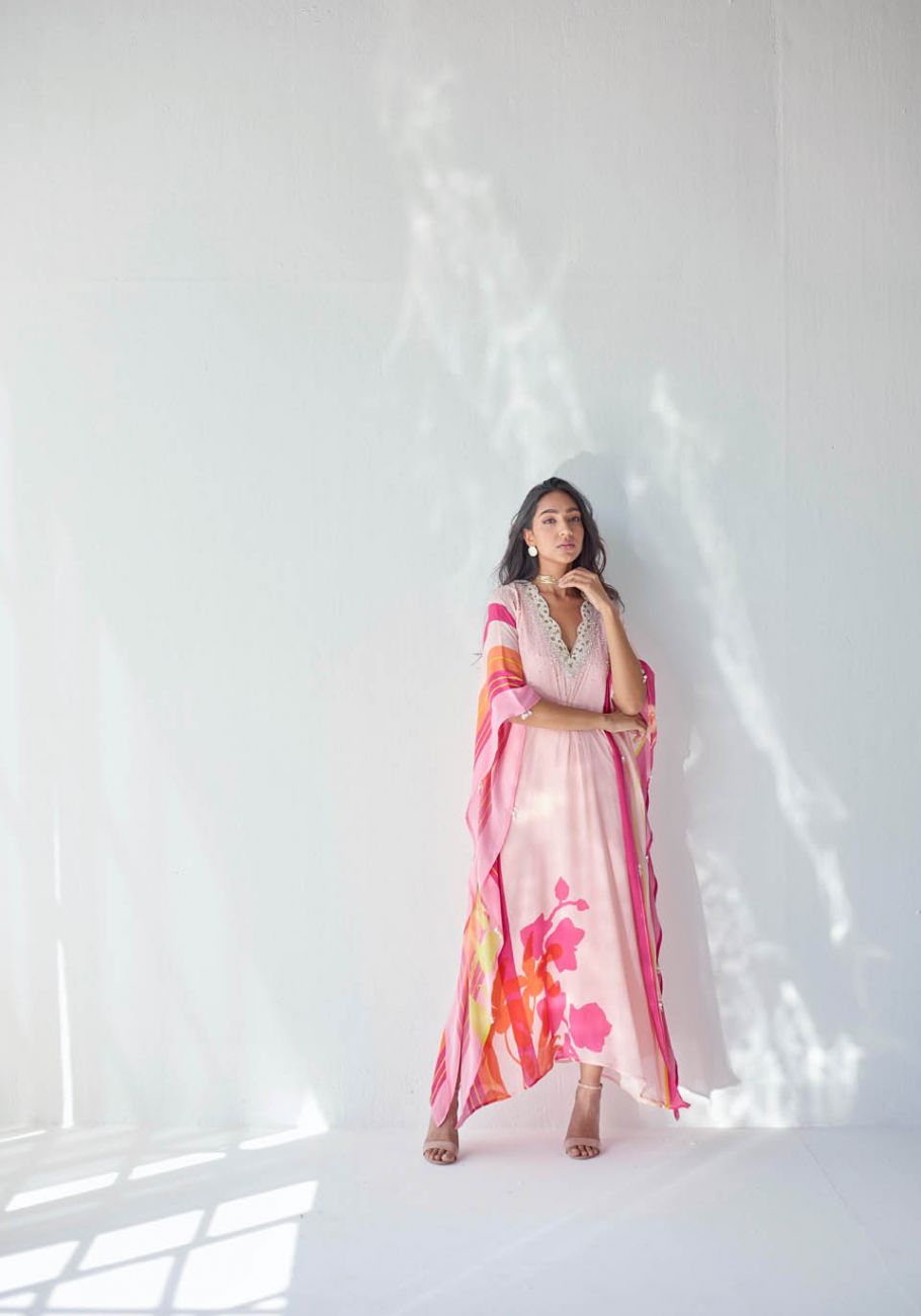 Nude Pink printed kaftan with intricate pearl hand embroidered scallop neck with centre pleat detailing.