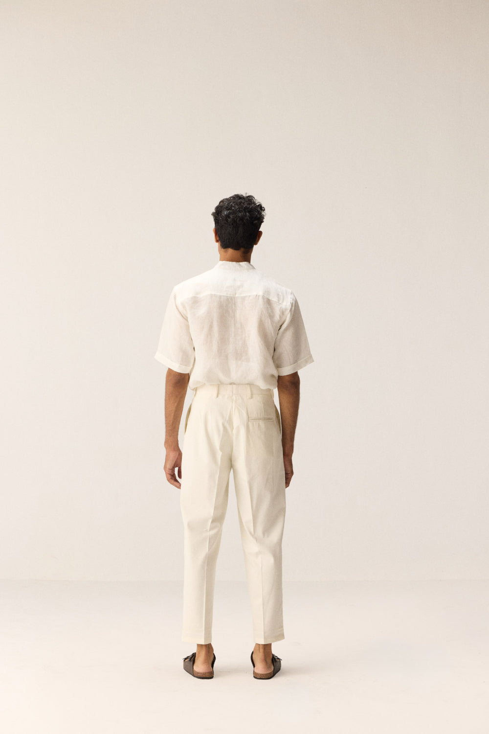 White straight-cut pants crafted in durable twill fabric. Designed with two side seam pockets, one back pocket, and belt loops for a polished fit. Features a hook-and-bar closure with a zipper for easy wear.