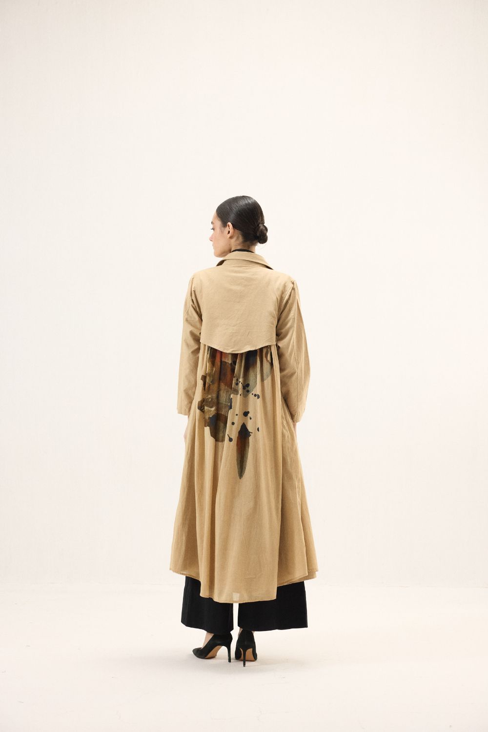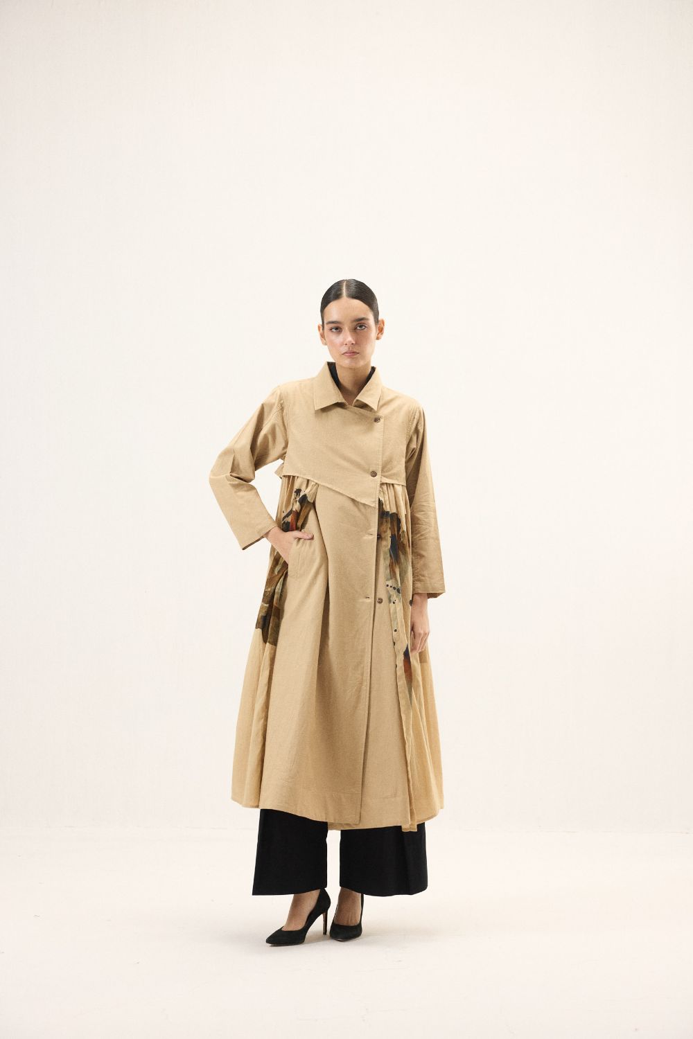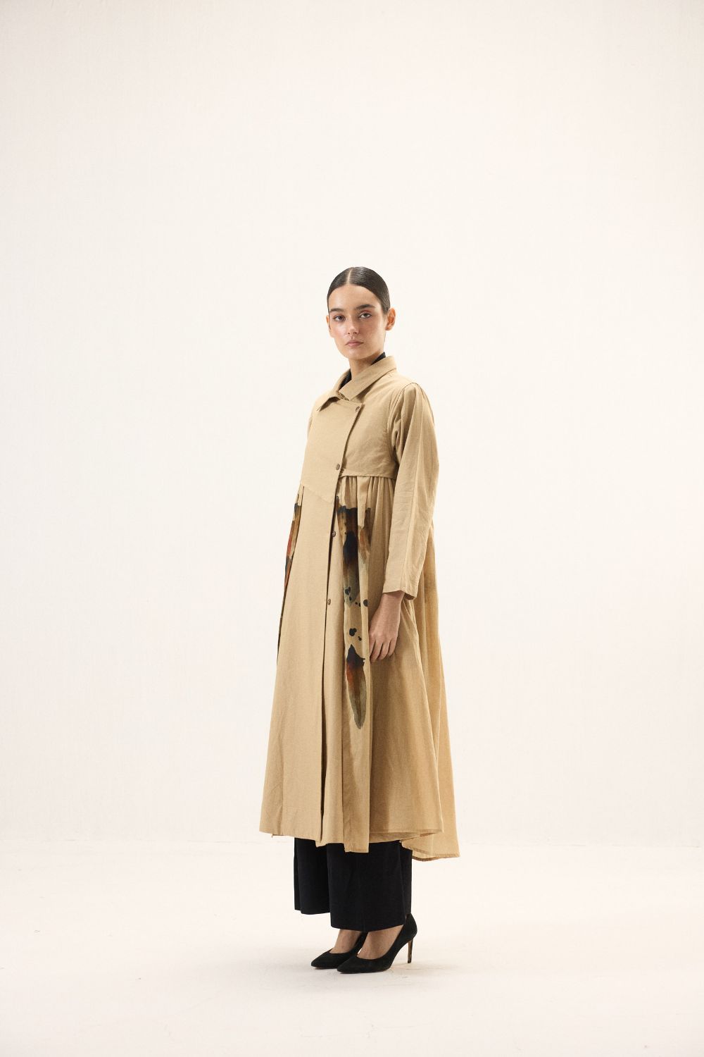 A striking trench dress crafted in tan poplin, featuring gathered printed layers in mul for a delicate contrast. Designed with functional front pockets and a double-breasted placket finish, it exudes effortless chic. Versatile in style, this piece can be worn as a statement dress or layered as a sophisticated overlay.