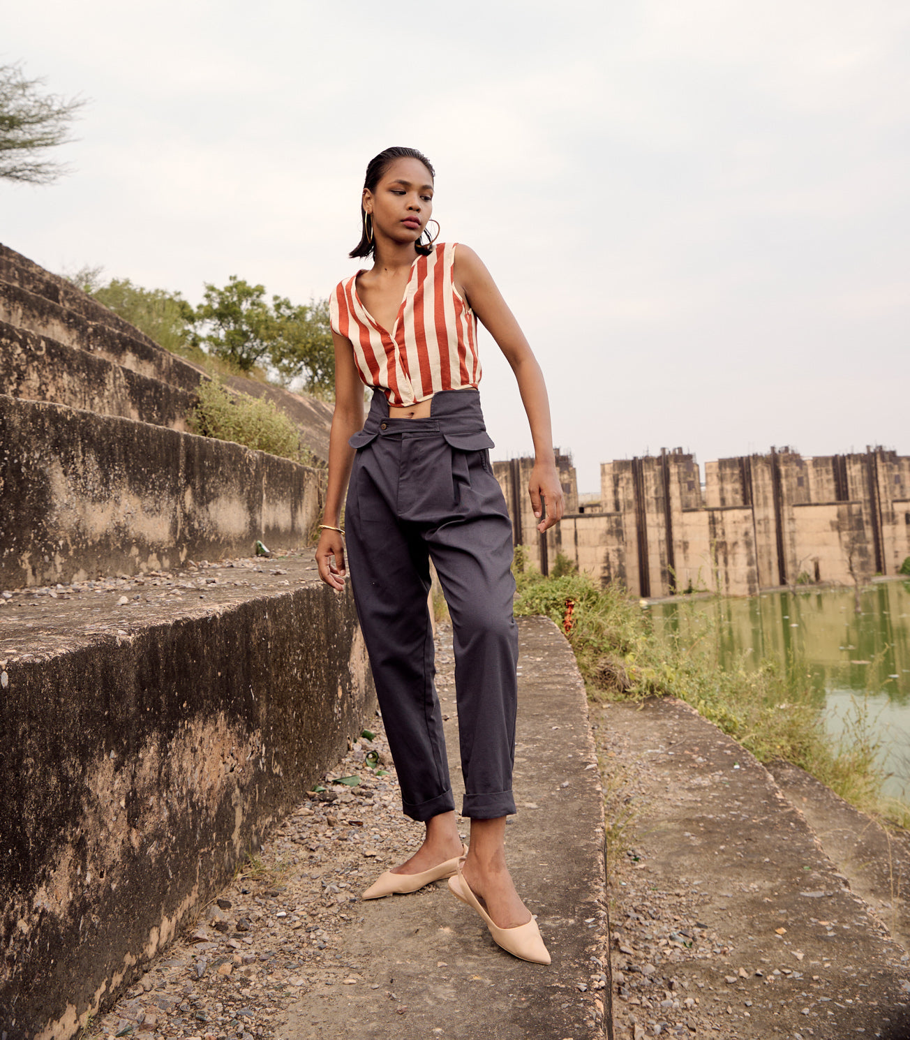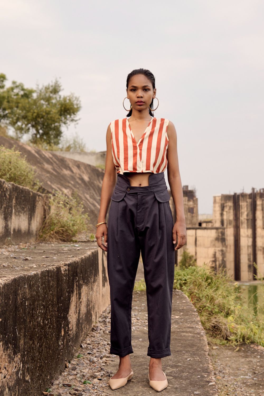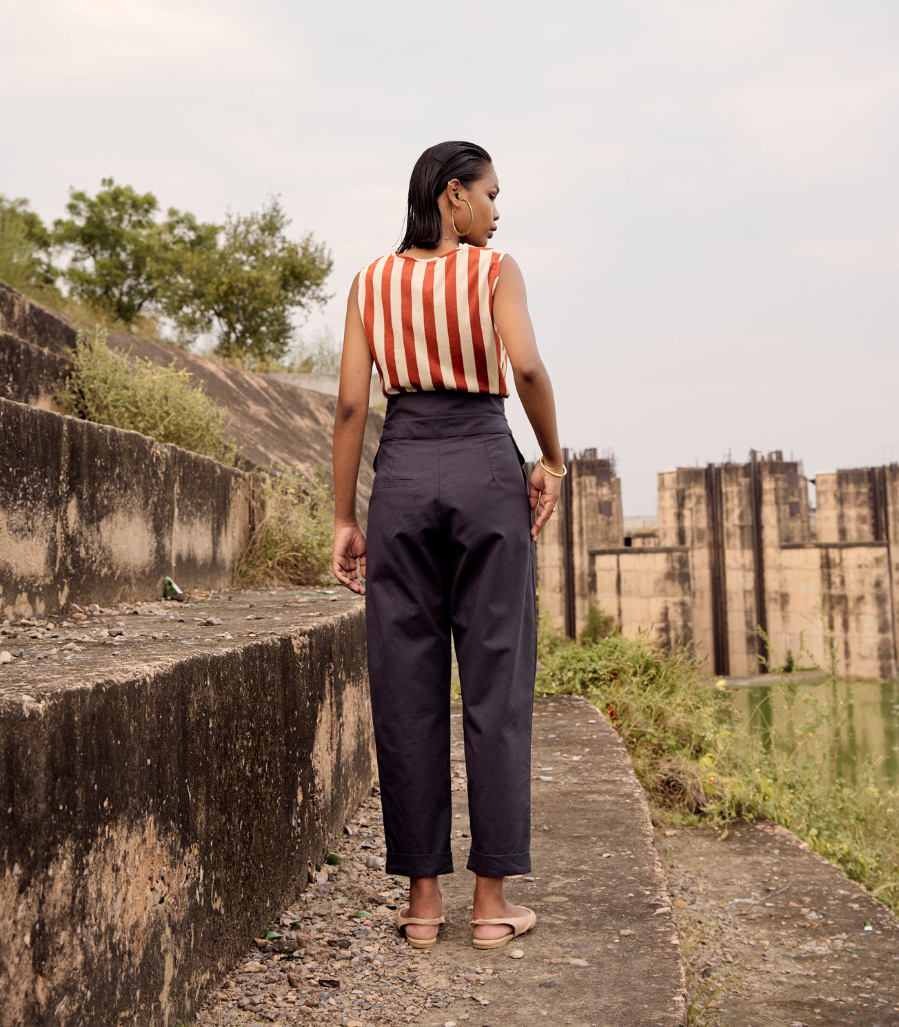 A brick red mul reversible top with stripes at one side and lino print at the other.