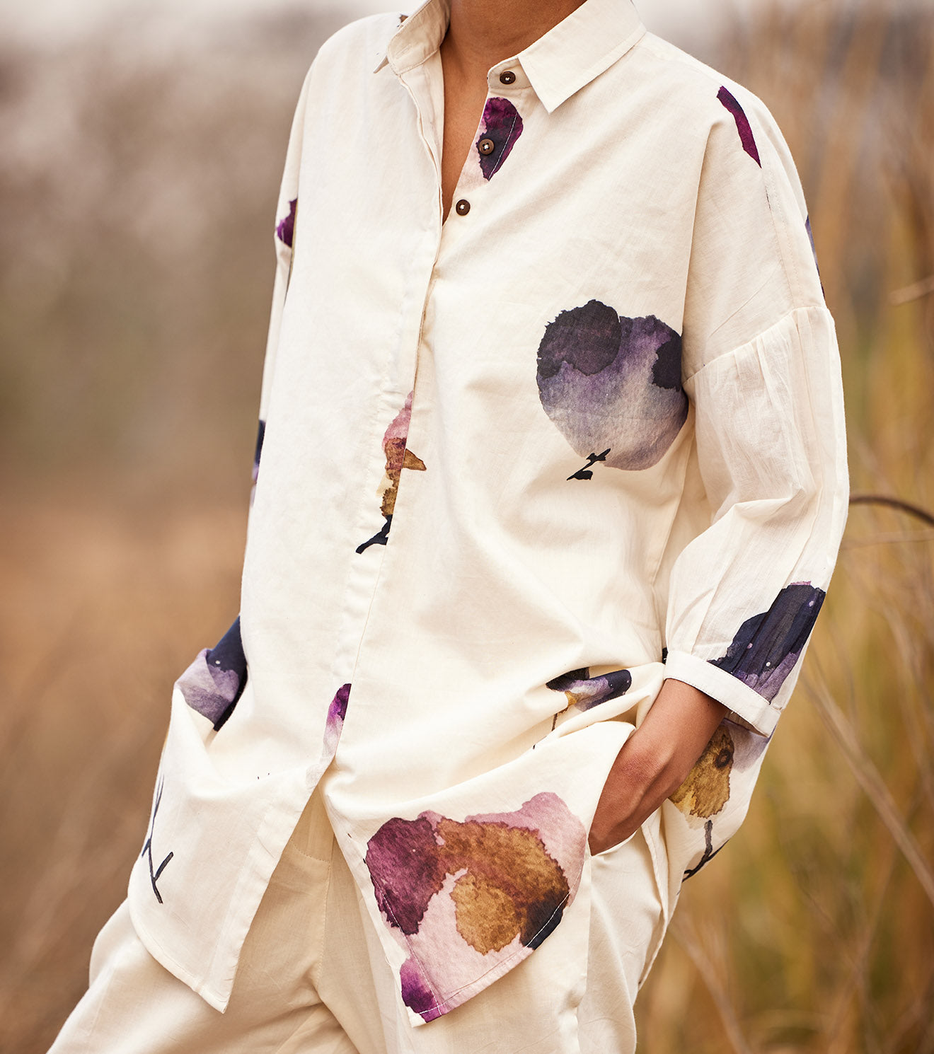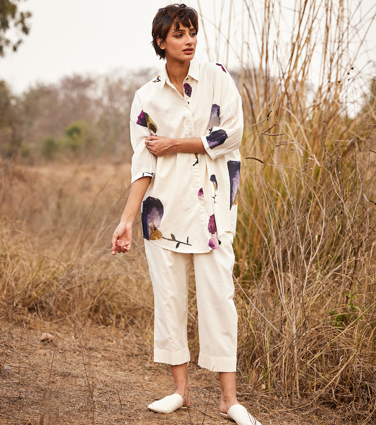 A vibrant floral printed co ord set featuring a shirt crafted in breathable cotton mul fabric. comes with pencil bottoms - Handcrafted in India. - 2 Side pockets