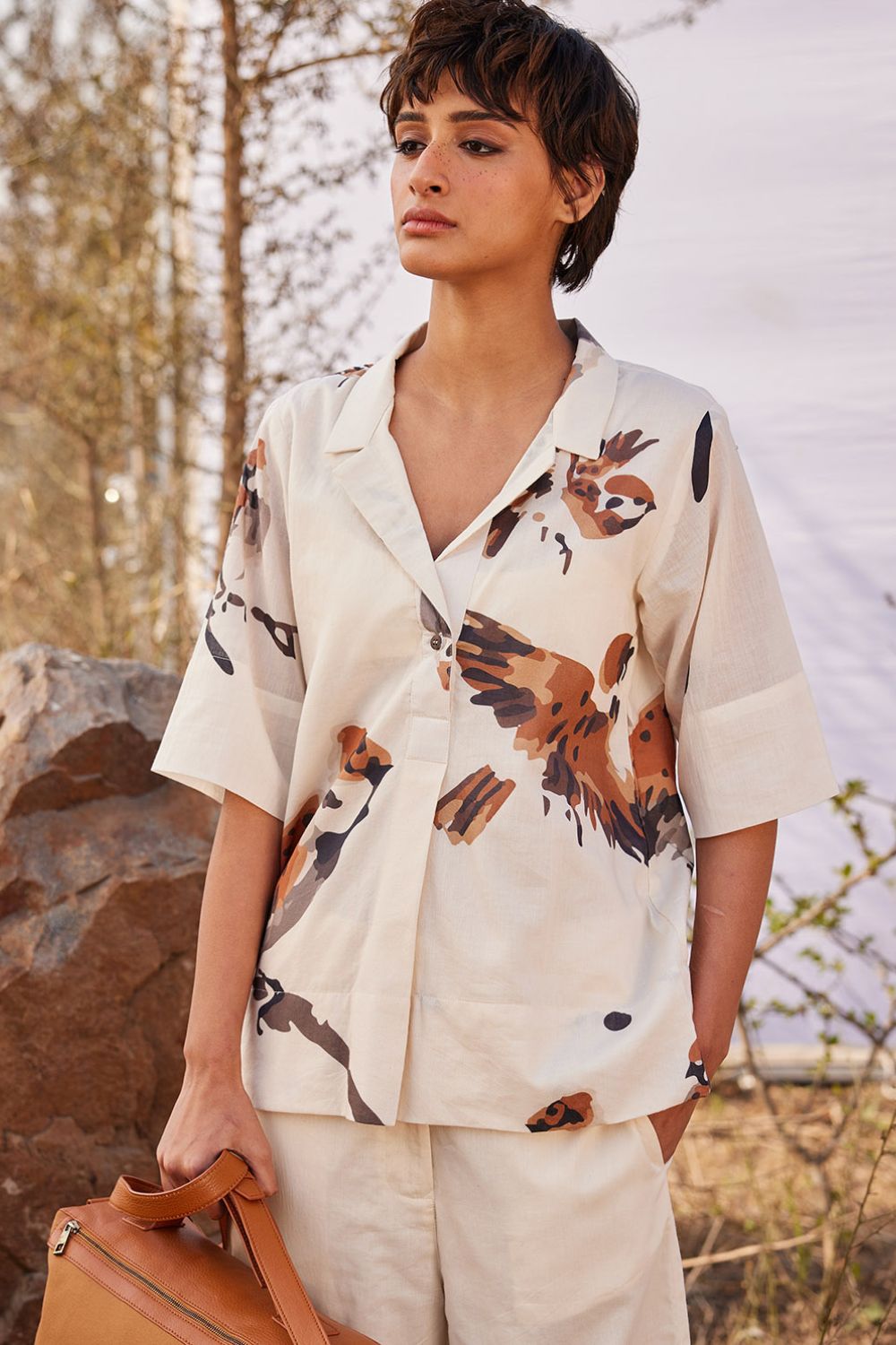 An off white bird printed shirt with notch lapels crafted in breathable cotton fabric.