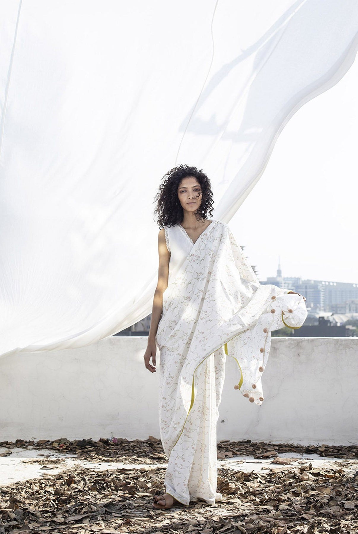 Styled with our 'sprouting' crop top. *This product consists of just the saree. The crop top isn't included in this product.