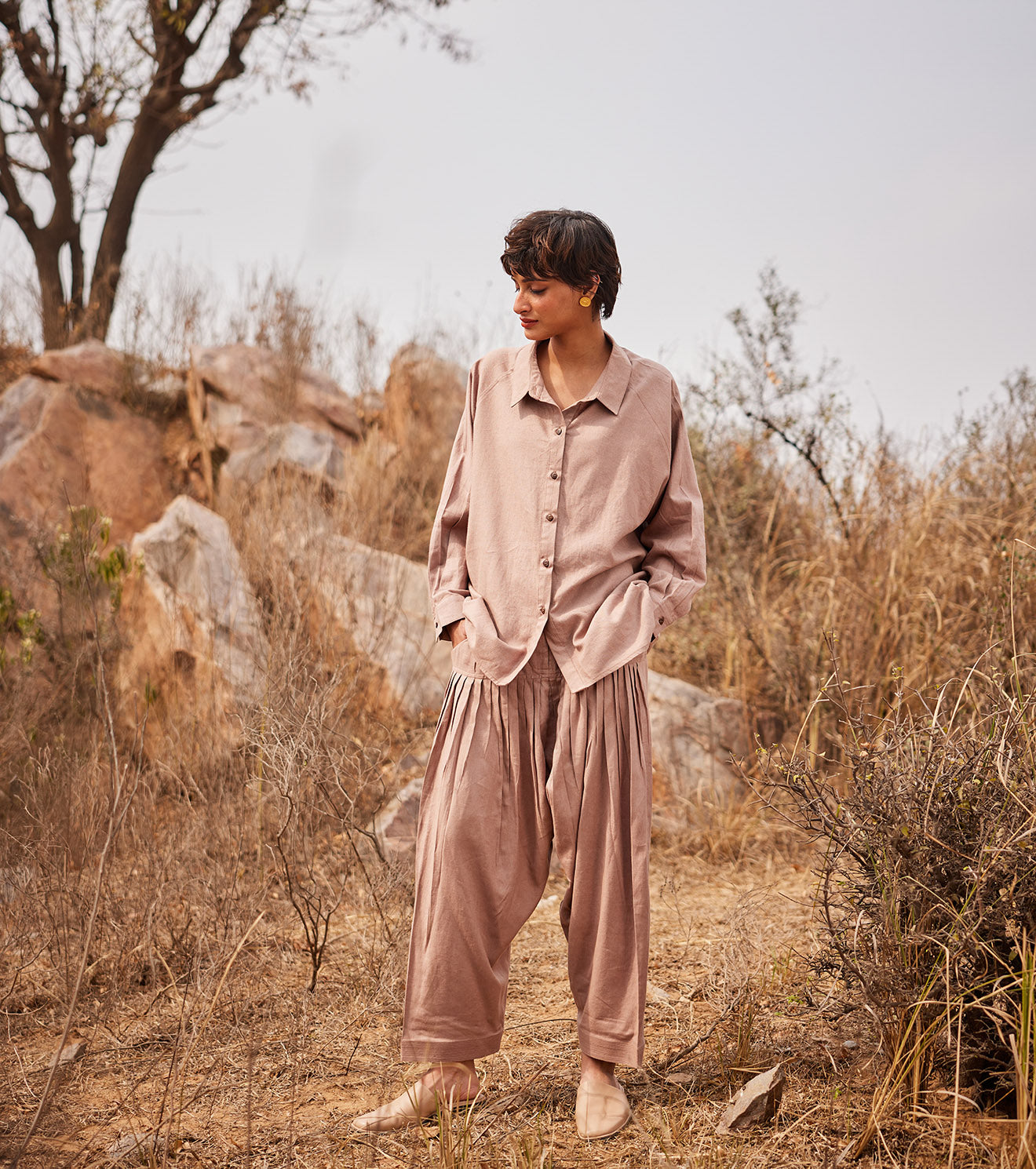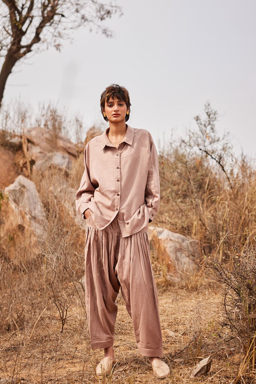 A rosy brown classic shirt with button opening in the front crafted in breathable linen fabric. - Handcrafted in India.