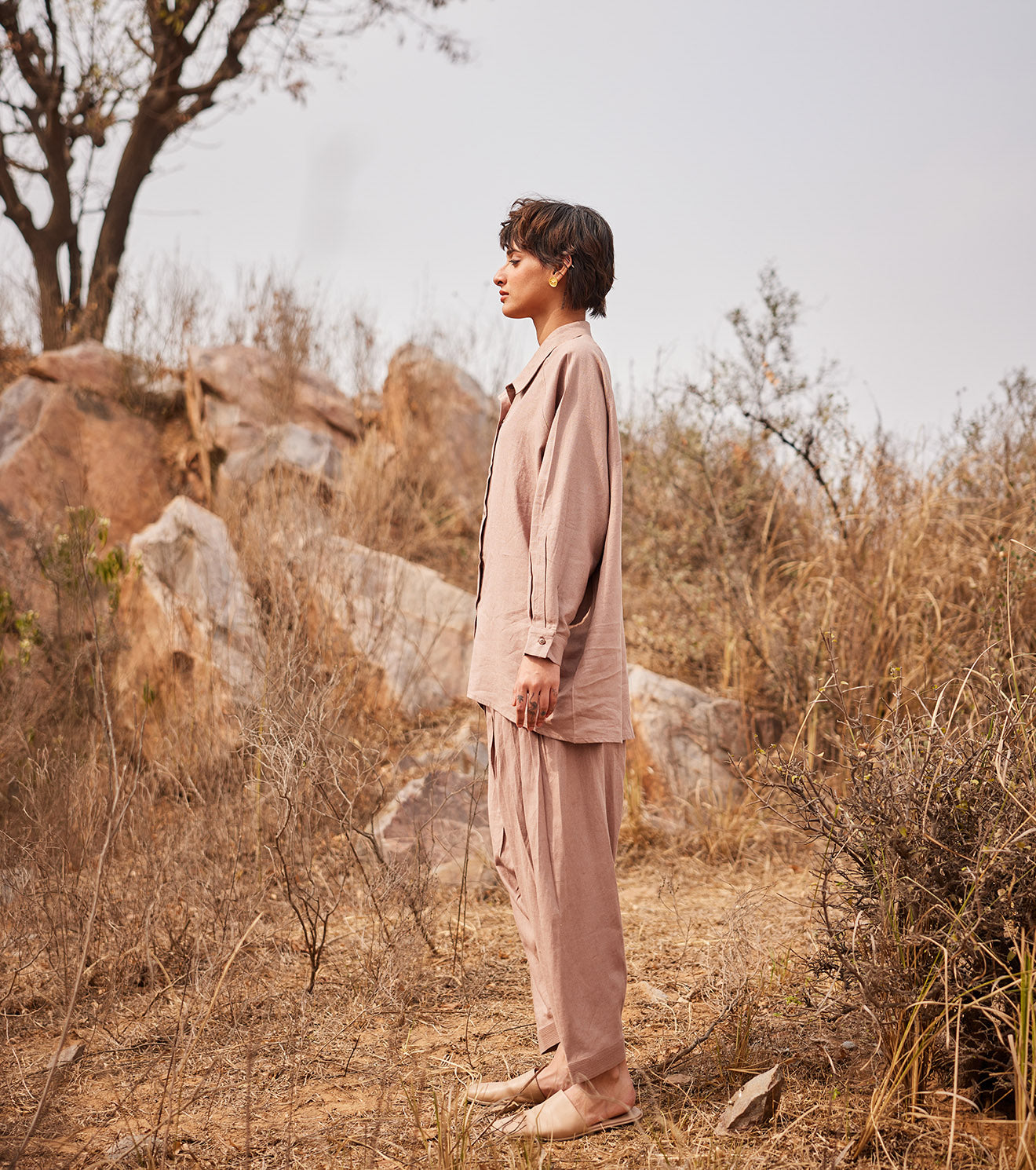 Rooted in handloom cotton and natural dyes, Khara Kapas works with the simplest geometry — circles, squares, triangles — and turns them into silhouettes that feel effortless, global, and emotionally familiar. There is a stillness to their clothes, a sense of returning to slower rhythms and honest materials, without ever losing relevance.