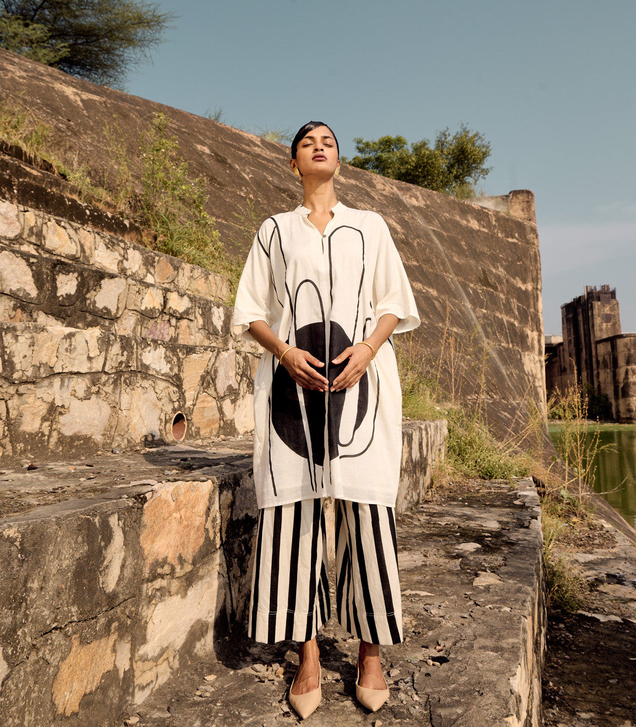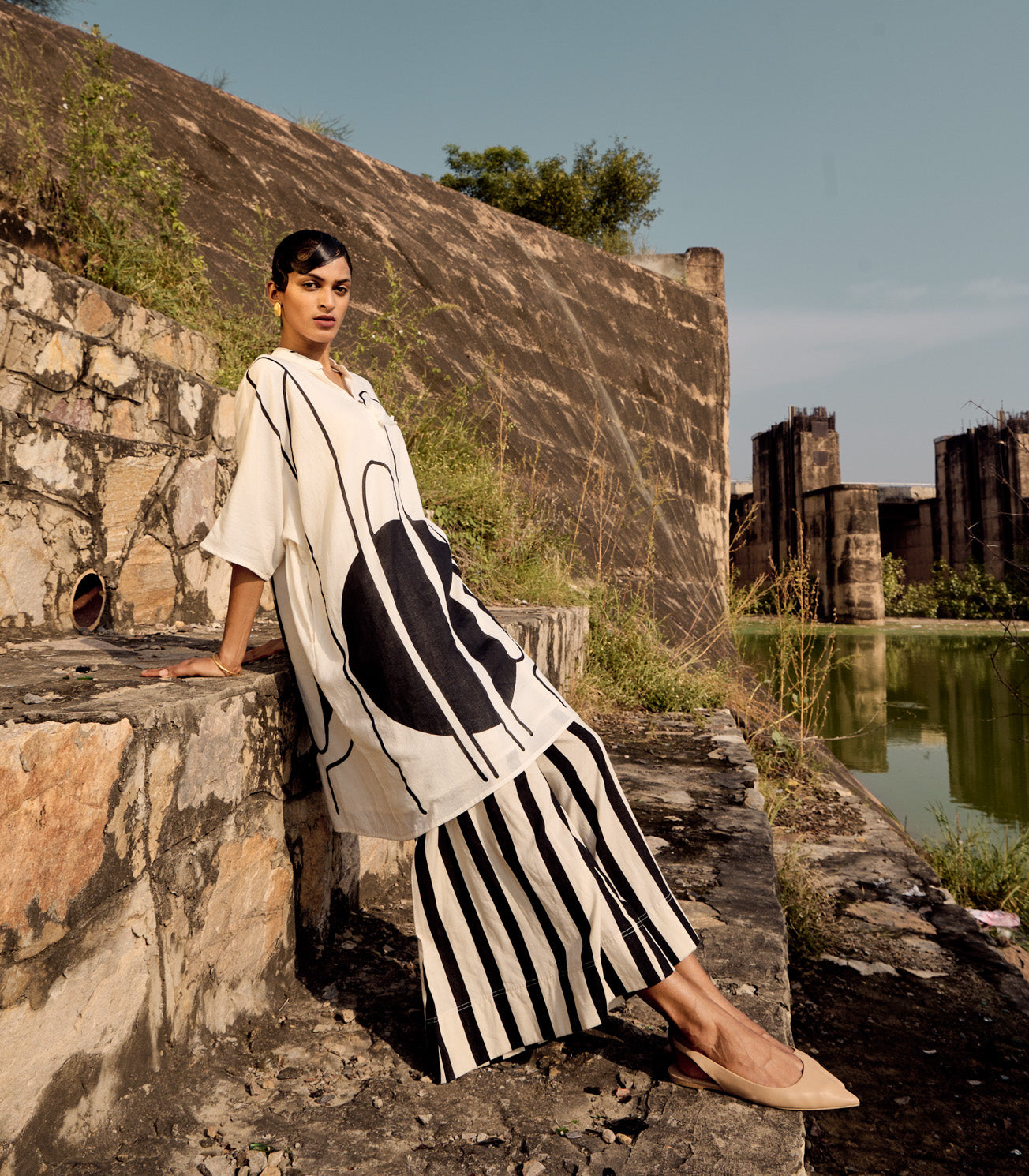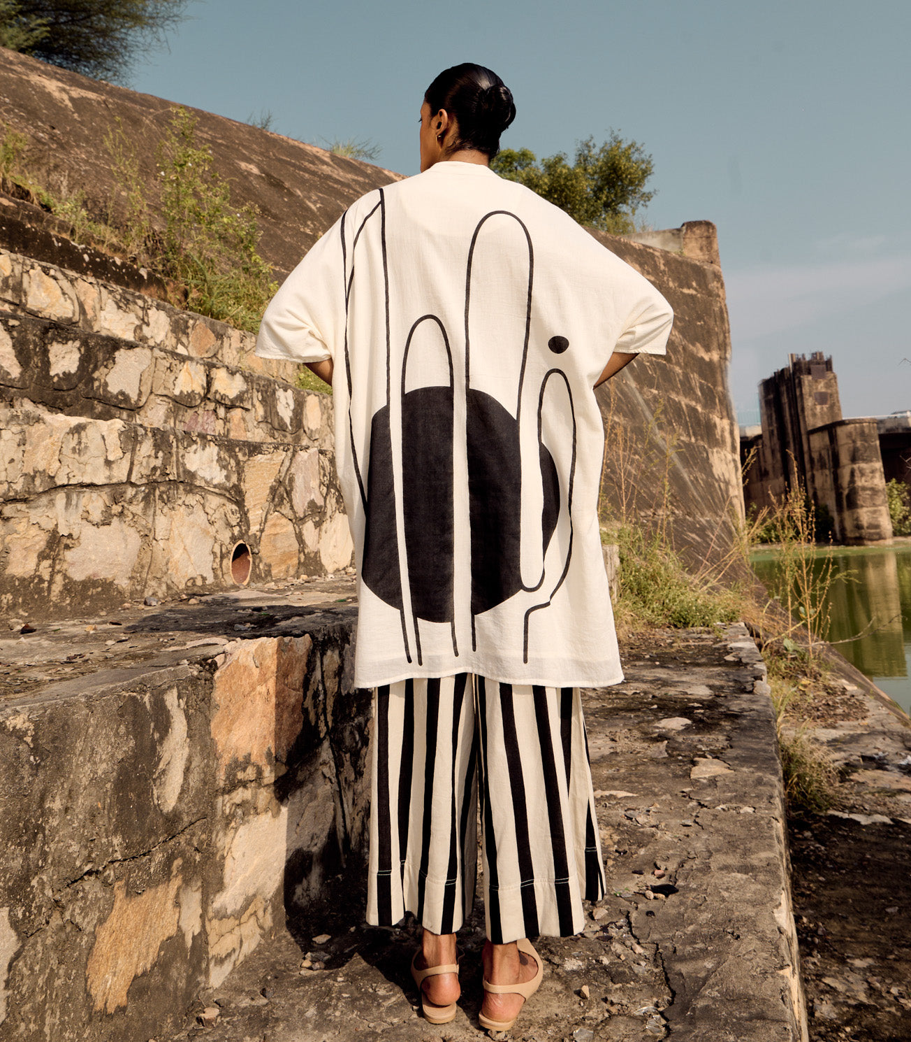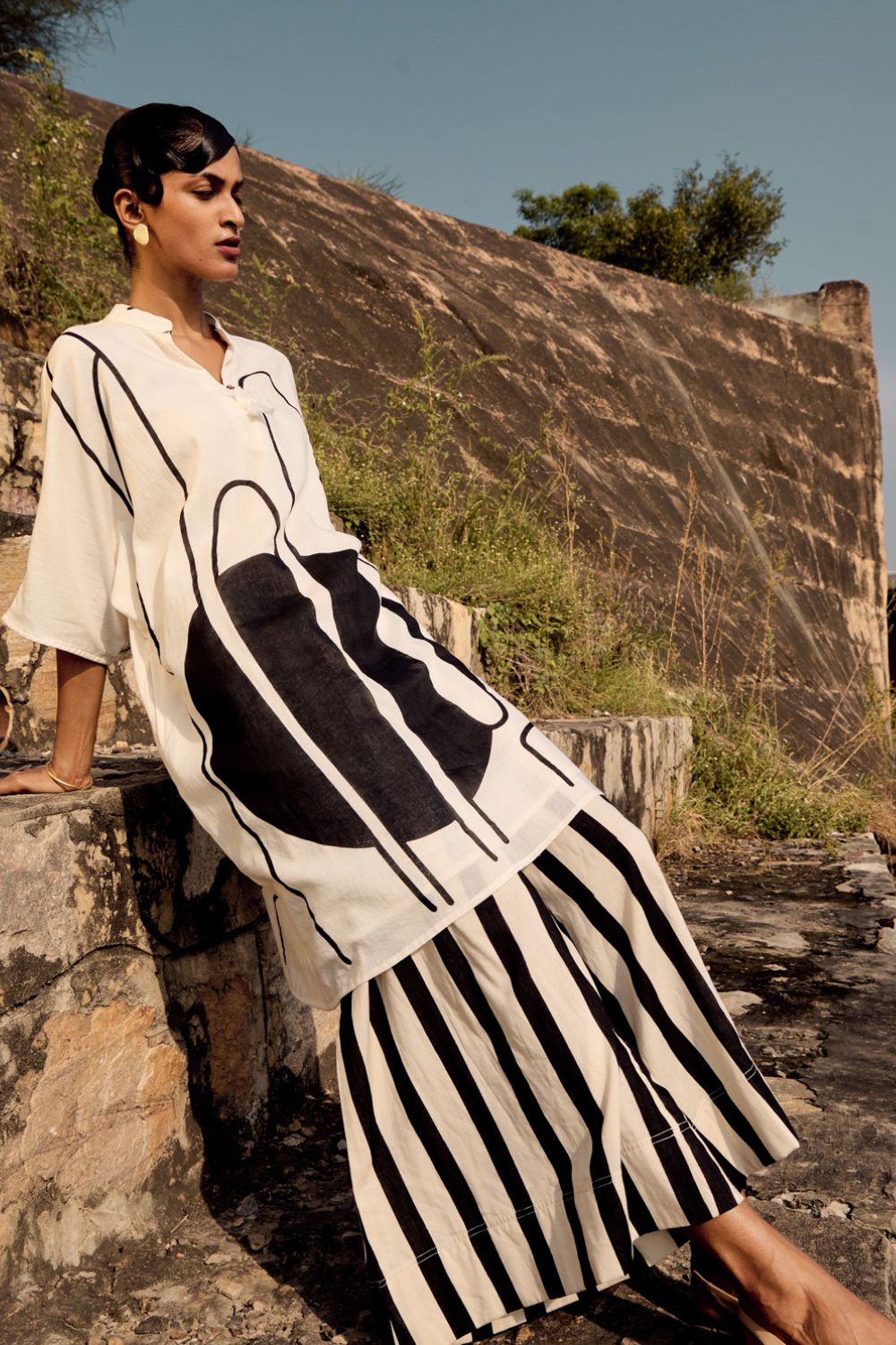 An off white antifit mul co-ord set. The lino print tunic comes with front button opening, mandarin collar and side seam pockets. Comes with a striped flared culottes with front button