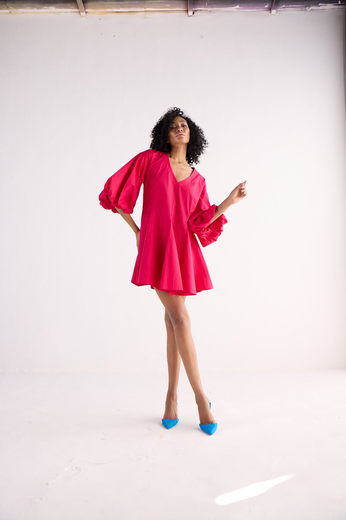 A hot pink mini dress crafted in breathable poplin with puff sleeve, V neckline and godet flares at the hemline.