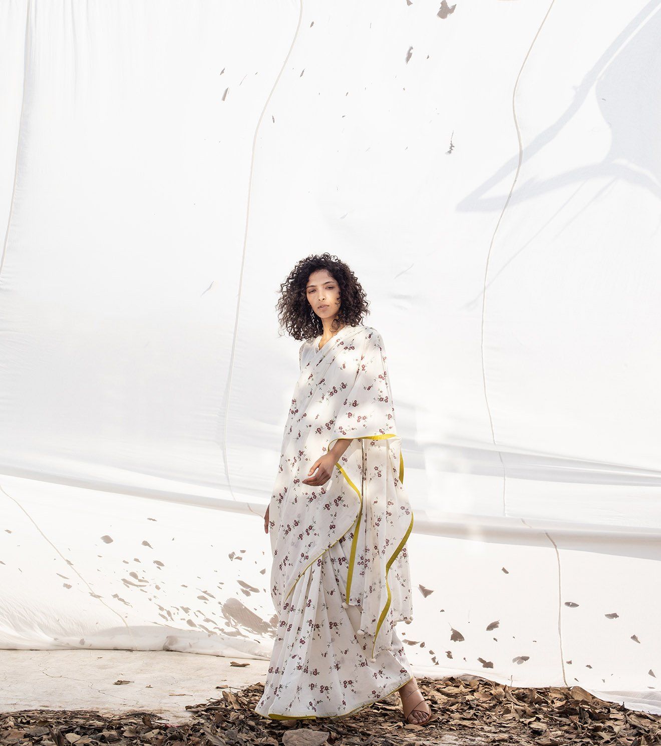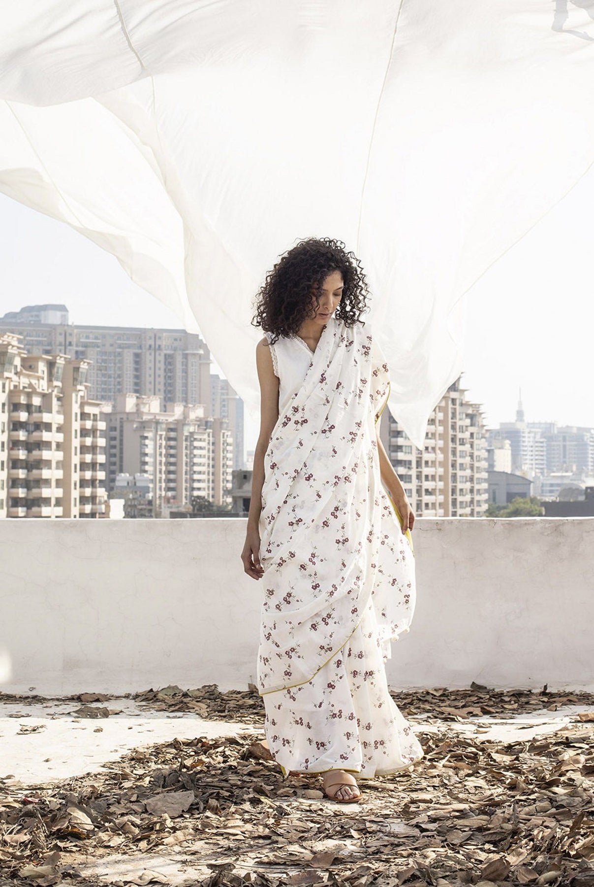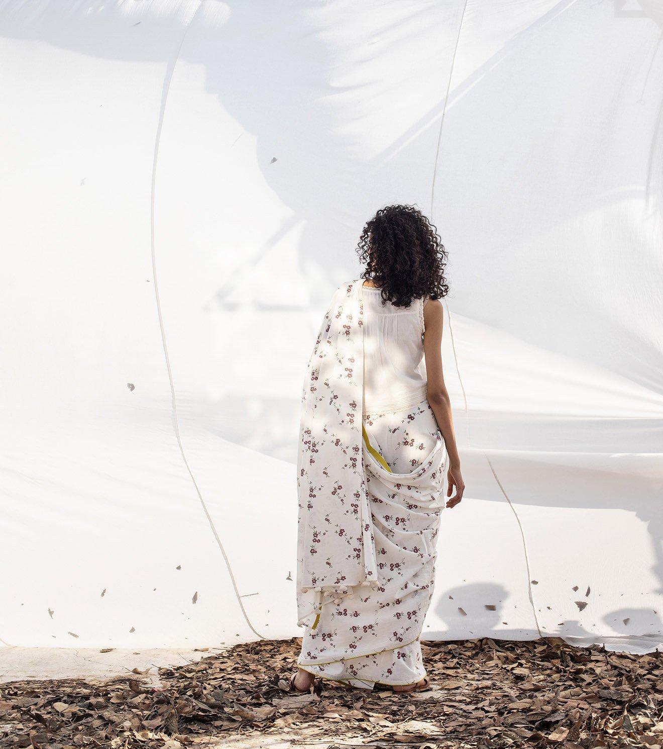Ivory mulmul saree with an overall peach floral & green leaves screen print. Styled with our 'sprouting' crop top.