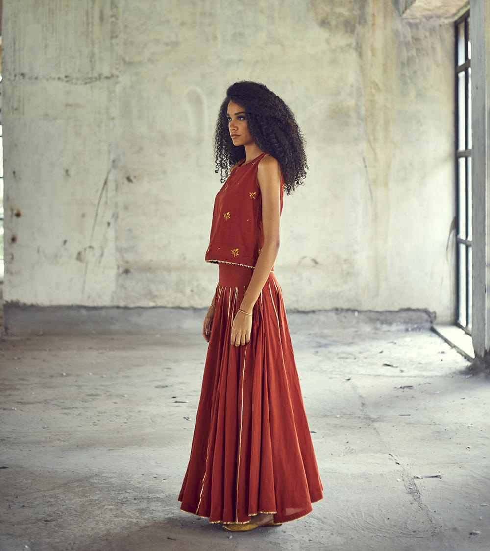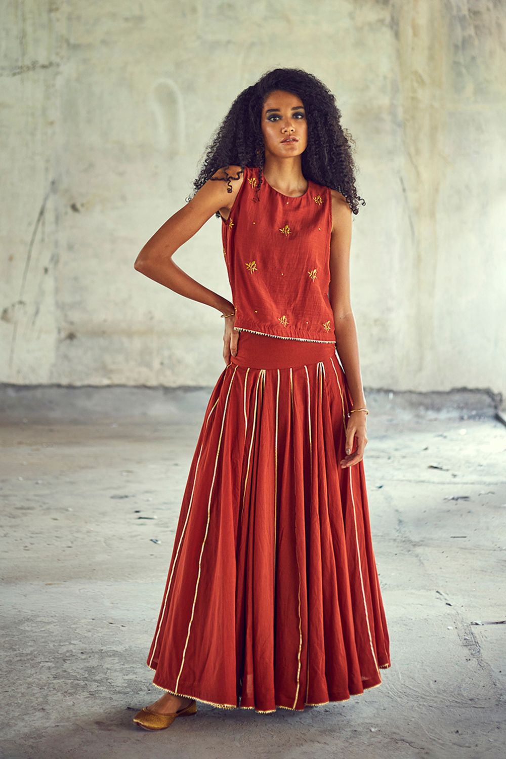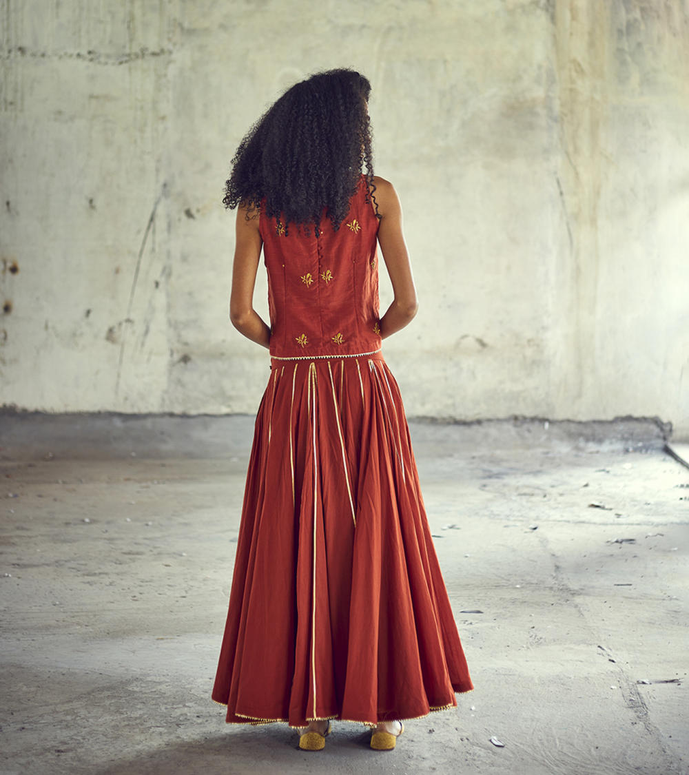 Burt red short cotton silk kurti, with around neckline, back hook opening and delicate details of gold embroidery work. Worn with it is a playful and fun mulmul hight waisted ghagra and fastened by decorative gold buttons. The look is completed with delicate lines of gota lace all across the kalidar mulmul skirt with delicate gota finishing across the hemline.