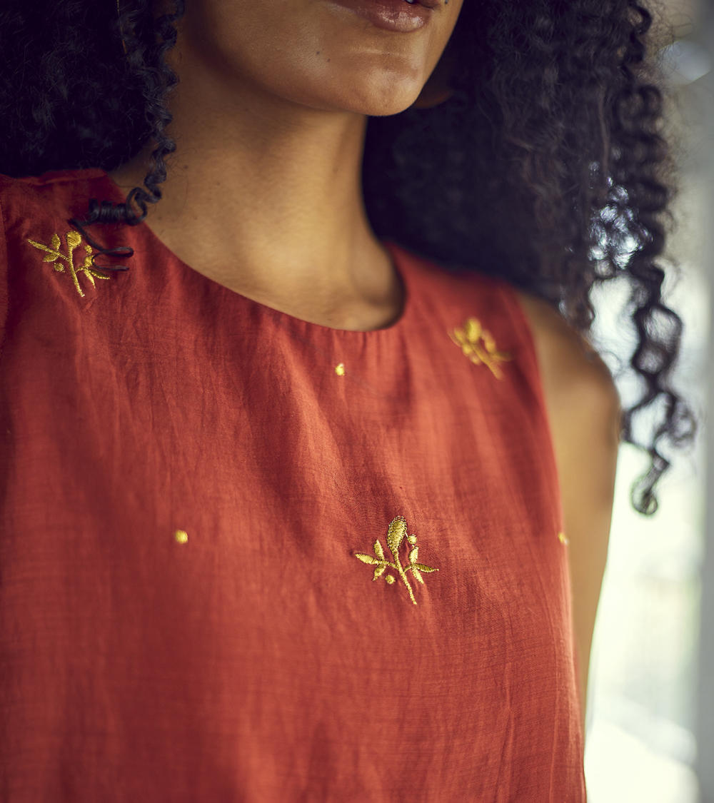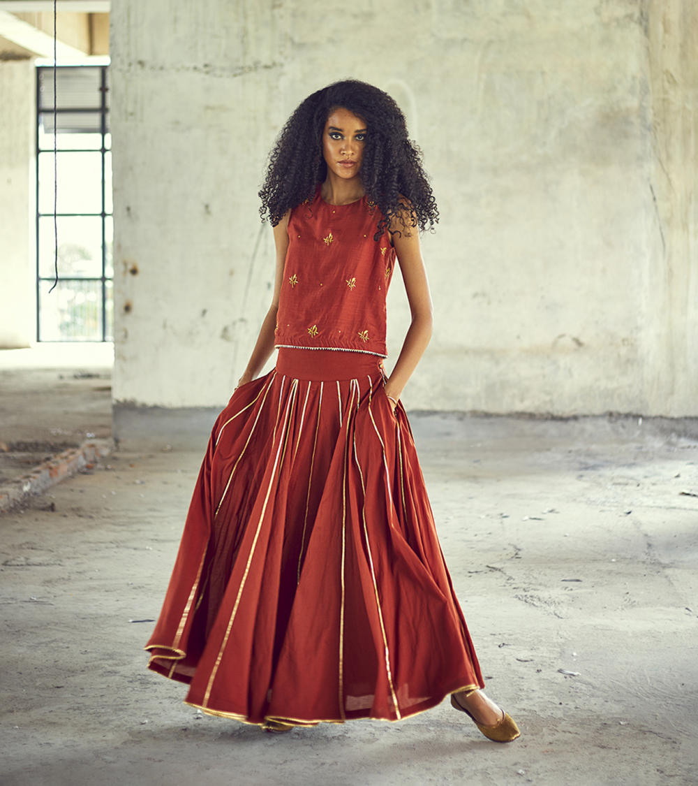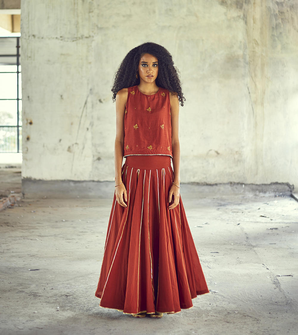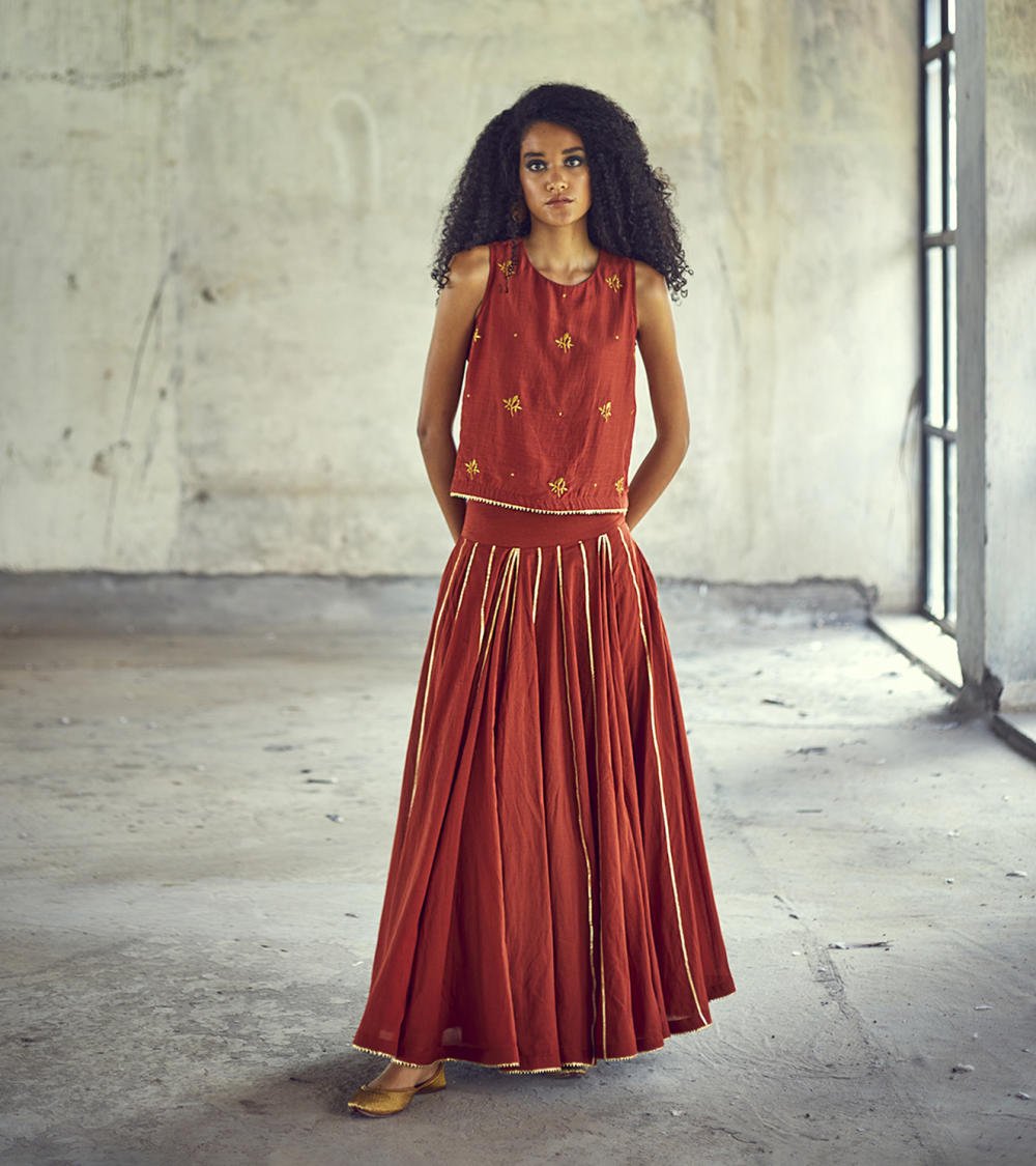 Burt red short cotton silk kurti, with around neckline, back hook opening and delicate details of gold embroidery work. Worn with it is a playful and fun mulmul hight waisted ghagra and fastened by decorative gold buttons. The look is completed with delicate lines of gota lace all across the kalidar mulmul skirt with delicate gota finishing across the hemline.