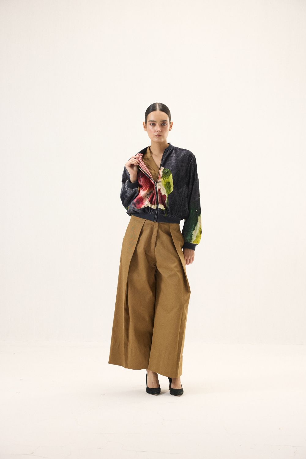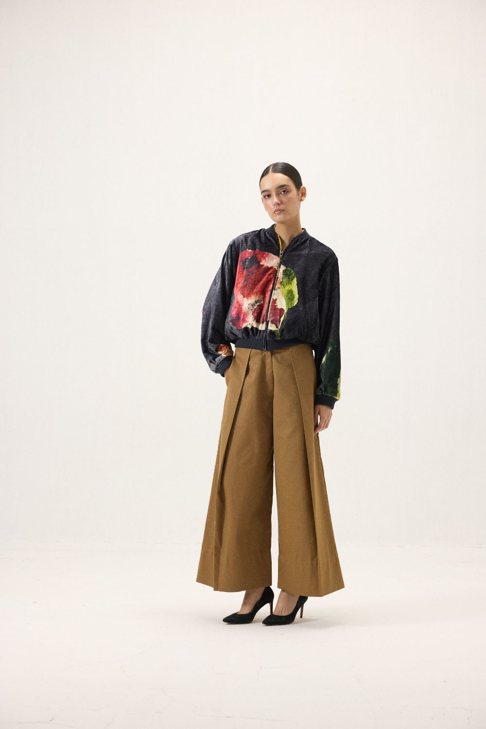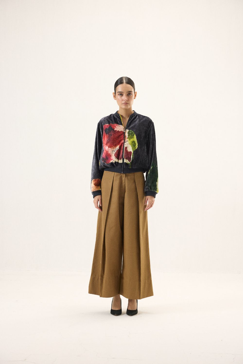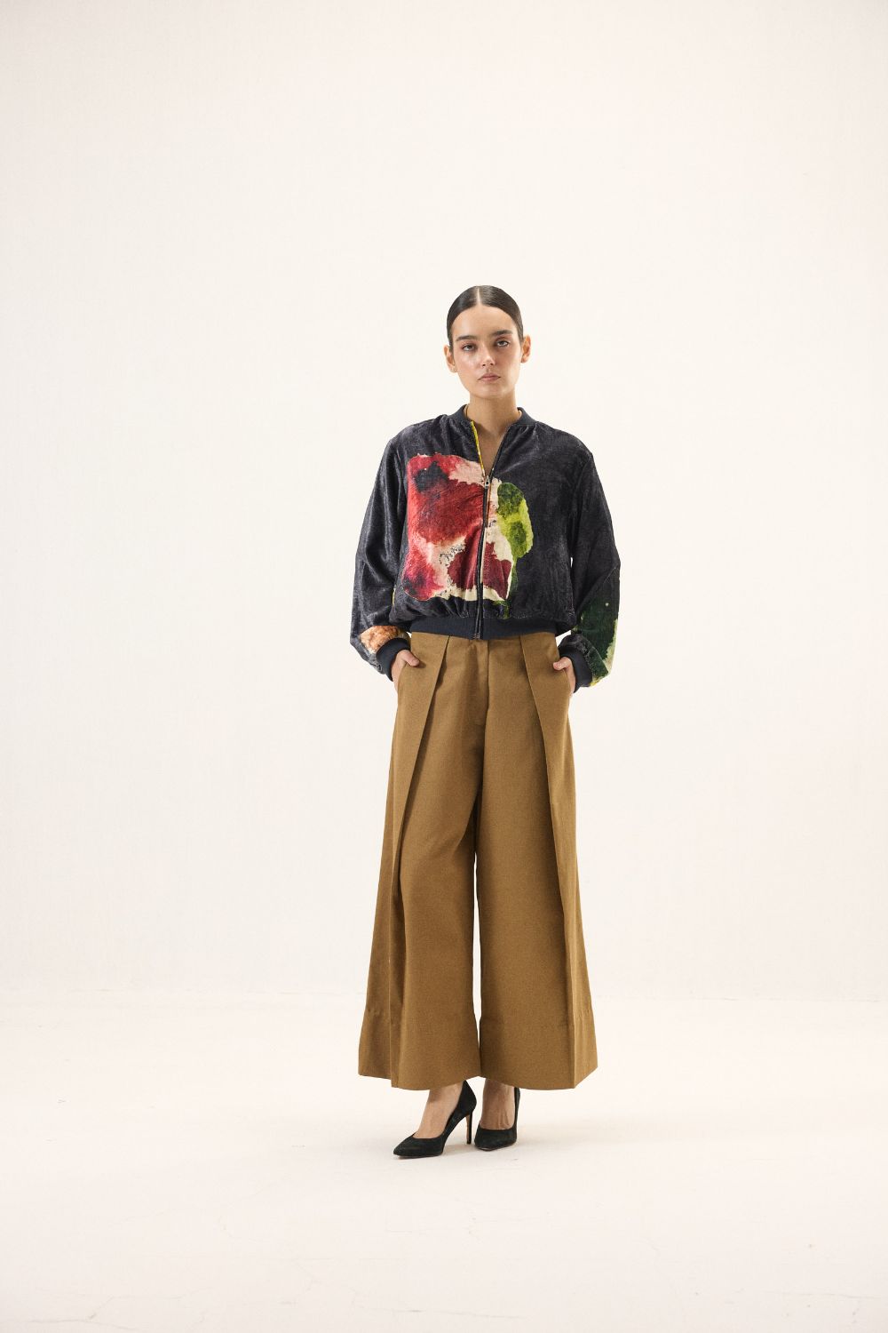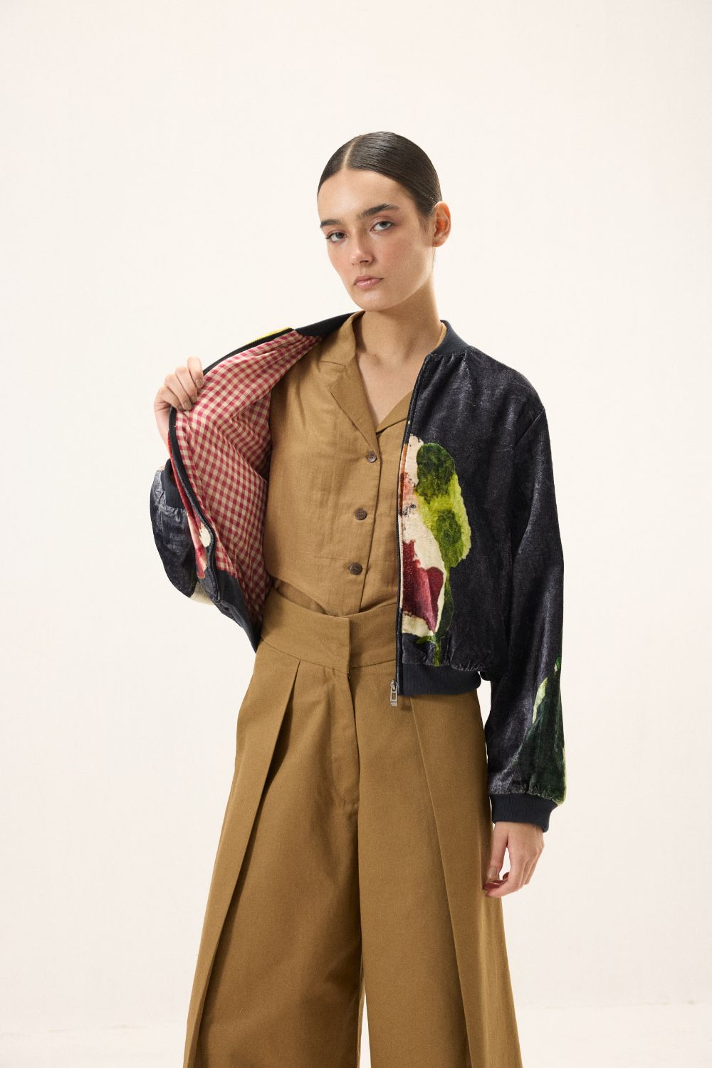 Crafted in plush black velvet, this bomber jacket brings together elegance and modern edge. The rich texture of the fabric adds depth, while bold floral prints bloom across the silhouette, creating a striking visual contrast. Designed with a front zipper and two functional pockets, it offers effortless wearability without compromising on style.