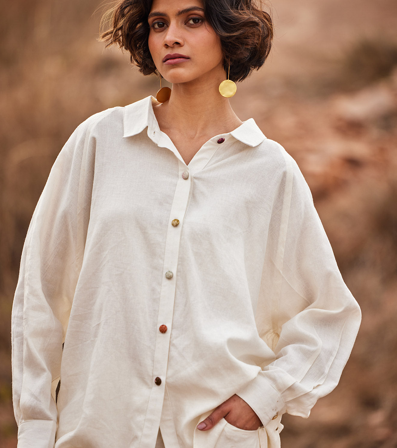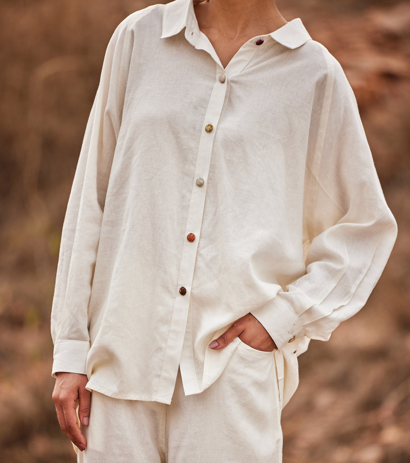An off white co ord set featuring a classic shirt with multi colored button details in the front and wide bottoms crafted in breathable linen fabric. - Handcrafted in India. - 2 Side pockets