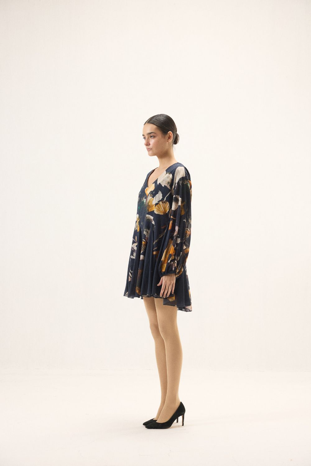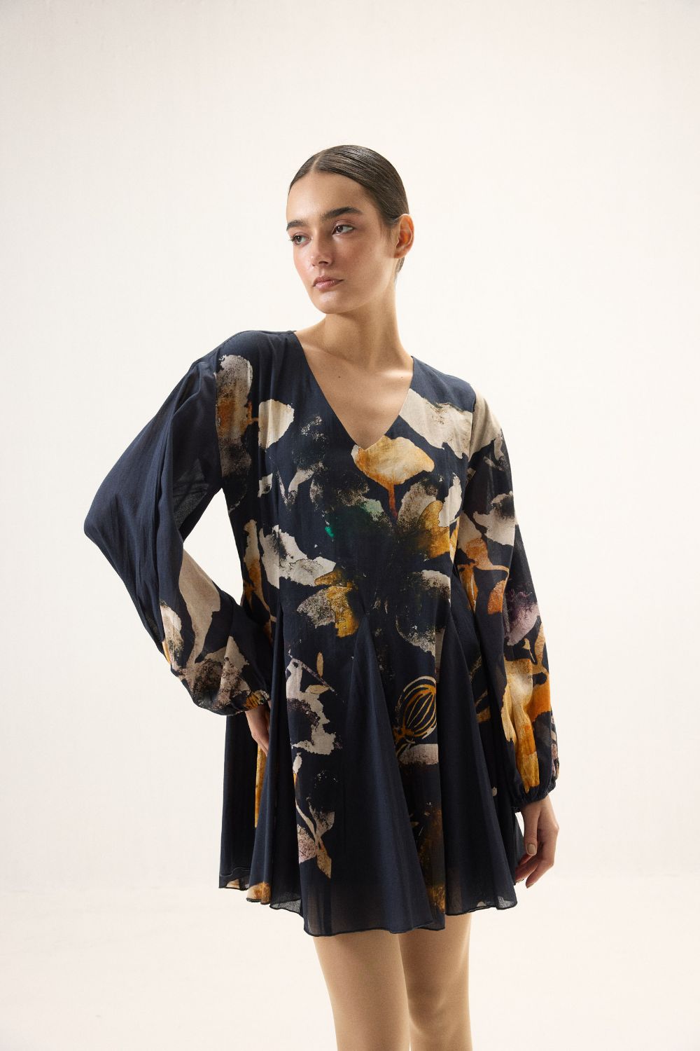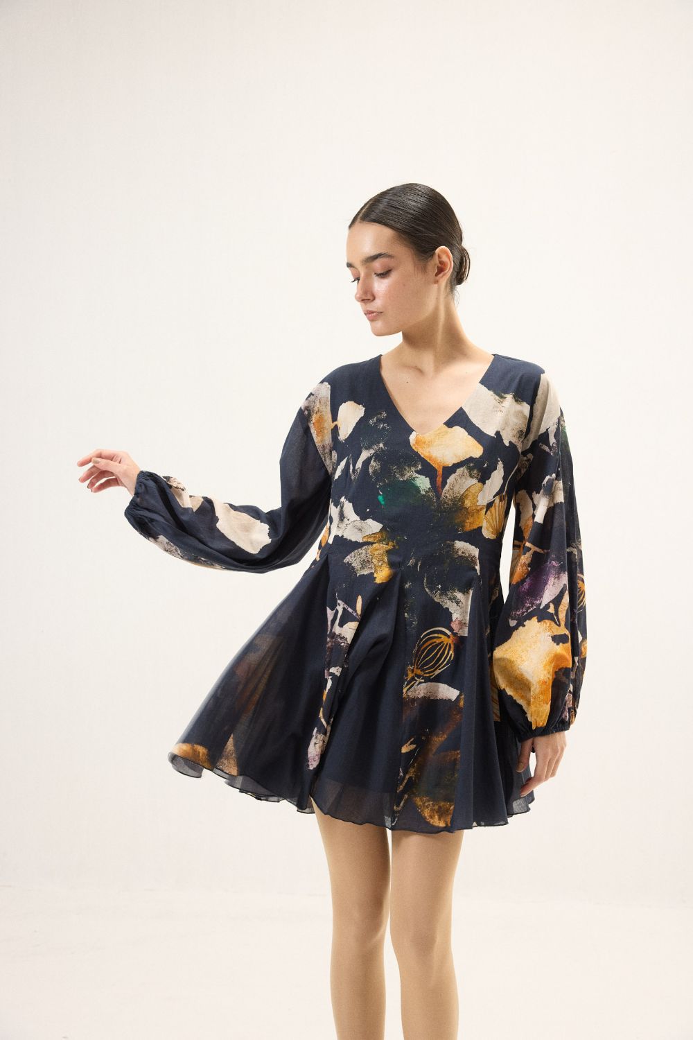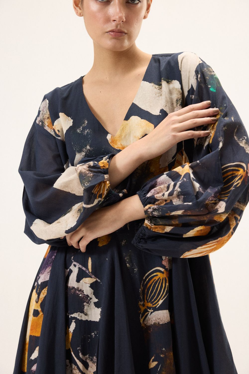Crafted in airy cotton mul, this Navy dress with floral prints, moves with an effortless grace. Designed with a soft V neckline and full-length puff sleeves finished with gentle elasticated cuffs, it balances volume with ease. Godet panels at the hem create fluid flares that sway beautifully with every step, lending the silhouette a light, flowing charm, perfect for days that call for quiet elegance and comfort.