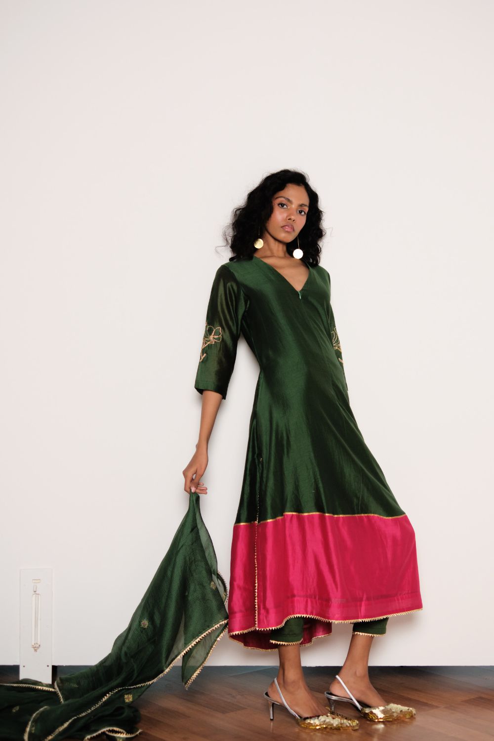 This set is a statement in contrasts, crafted in emerald green chanderi with a bold fuchsia border. Its straight-cut silhouette is paired with slim trousers and a kota silk dupatta, each finished with delicate scalloped edging. Subtle embroidery on the sleeves adds a festive detail, while the jewel-toned palette brings a vibrant, contemporary touch to a classic form.