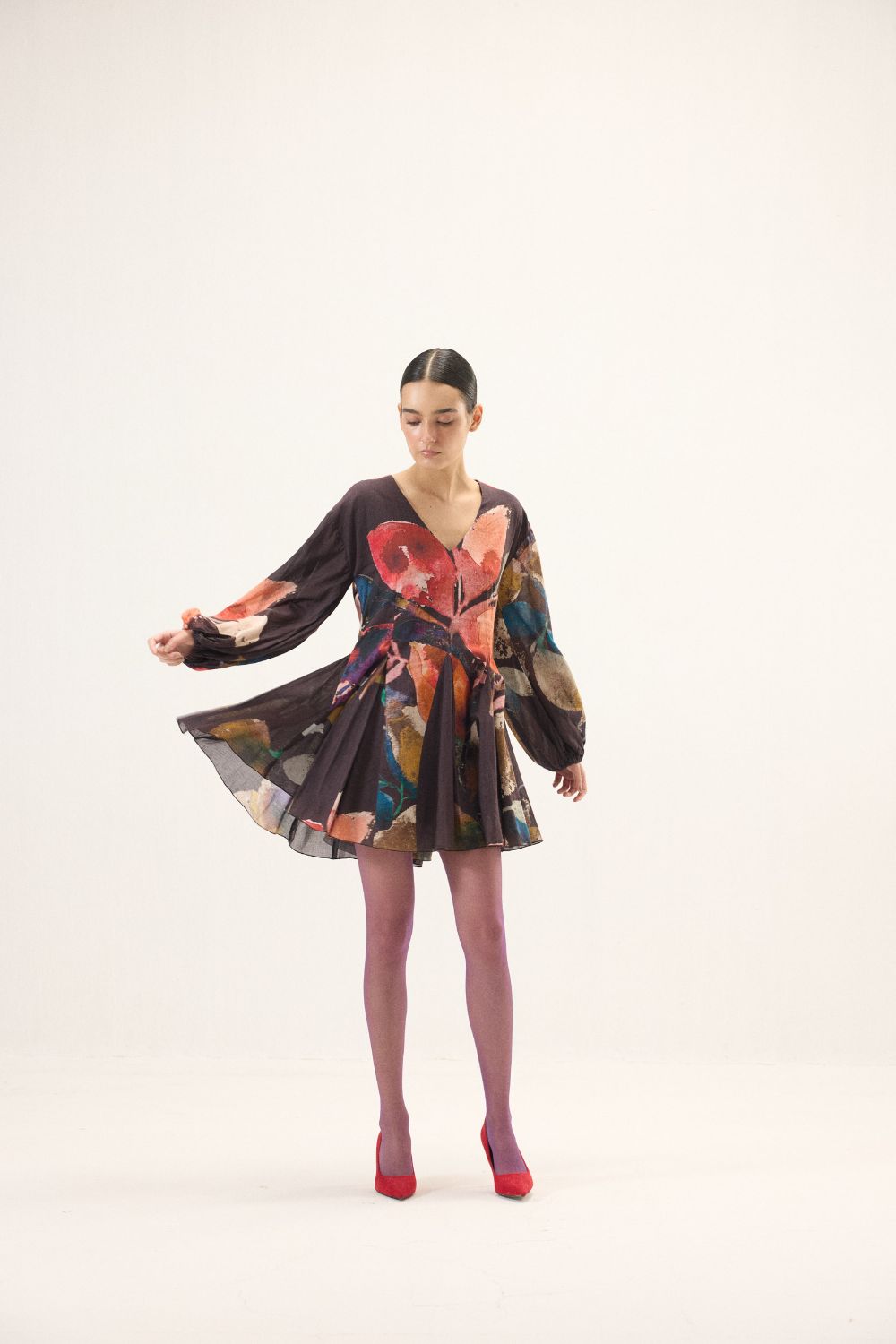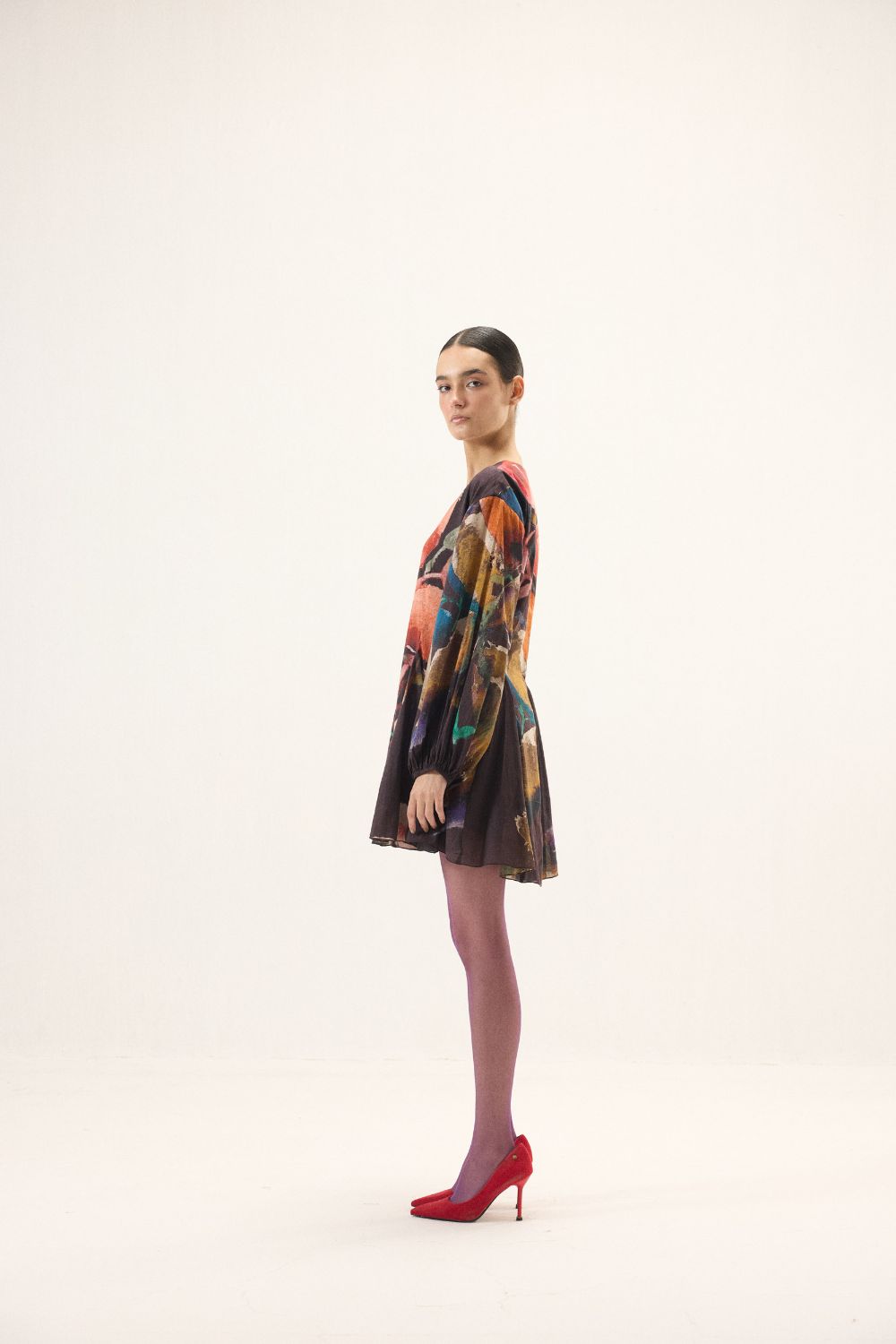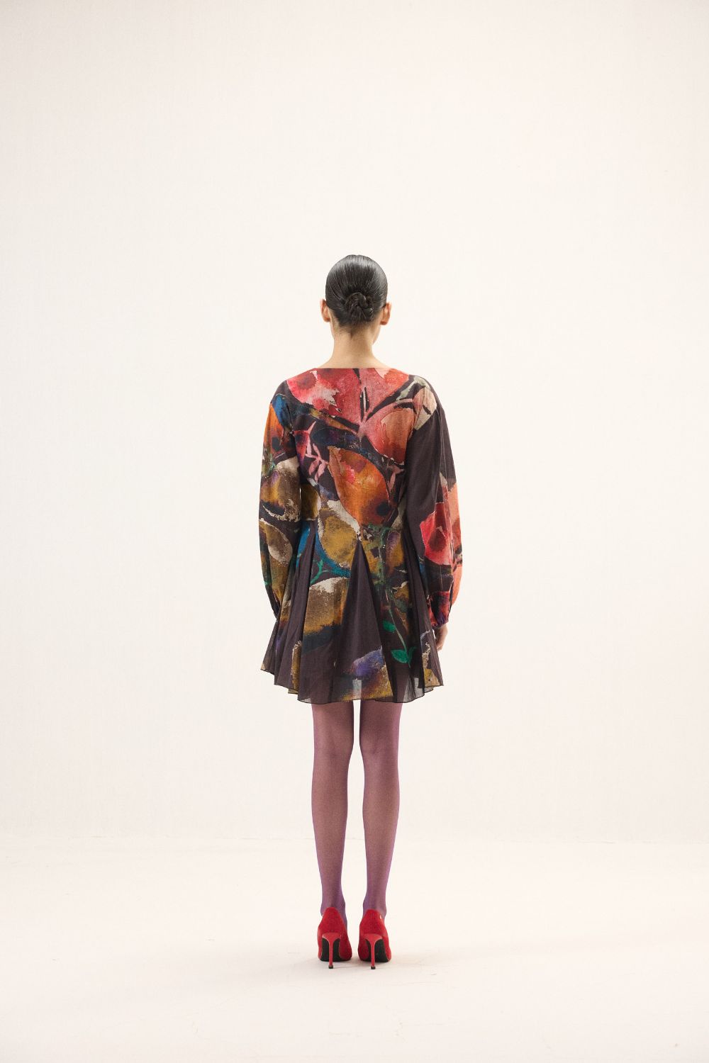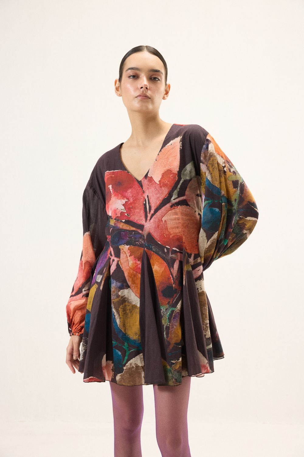 Crafted in airy cotton mul, this purple dress in bold floral prints, moves with an effortless grace. Designed with a soft V neckline and full-length puff sleeves finished with gentle elasticated cuffs, it balances volume with ease. Godet panels at the hem create fluid flares that sway beautifully with every step, lending the silhouette a light, flowing charm, perfect for days that call for quiet elegance and comfort.