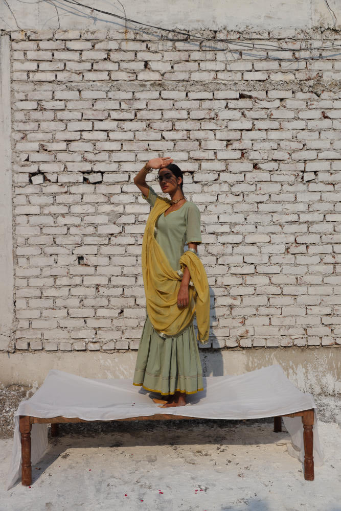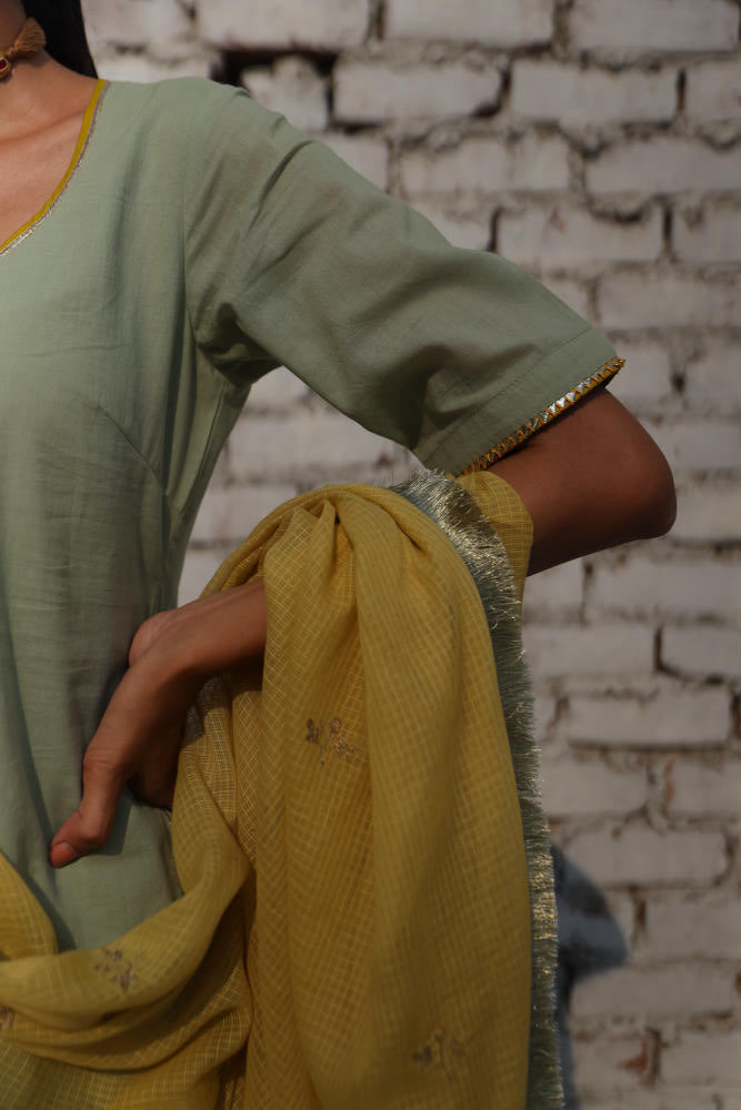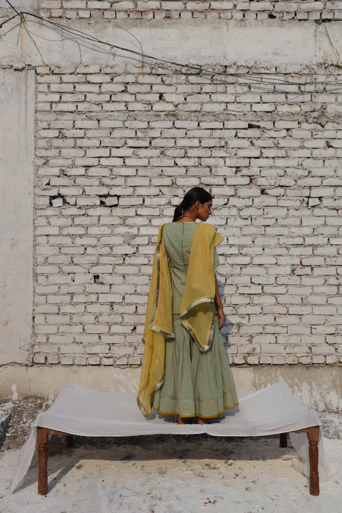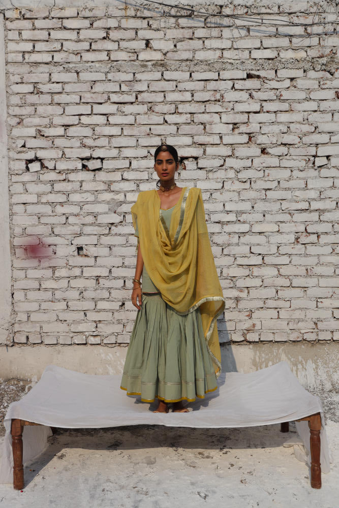Cotton mulmul sharara set in a lively sage green with elaborate gold detailing and gota work. Comes with an embroidered contrasting dupatta