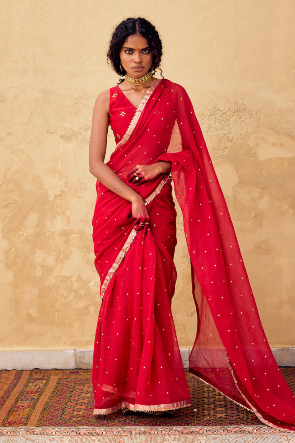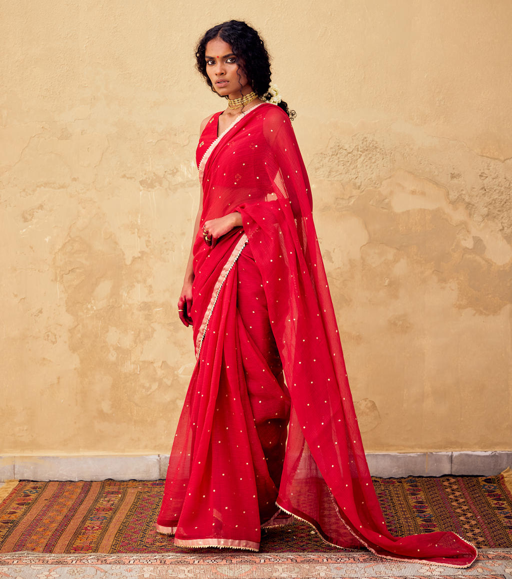 A red foil printed Kota doriya saree composed in silk , featuring bijiya gota detail at the hem. Includes a classic v neck embroidered blouse in Chanderi with back tie up and hook & eye fastening.