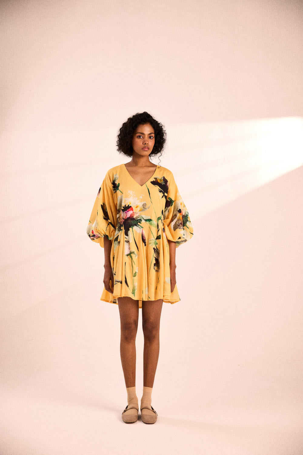 A relaxed dress with a floral print, featuring a soft V-neckline and voluminous three-quarter sleeves.